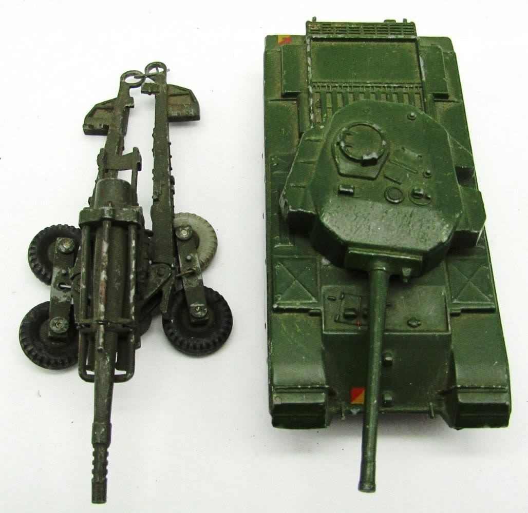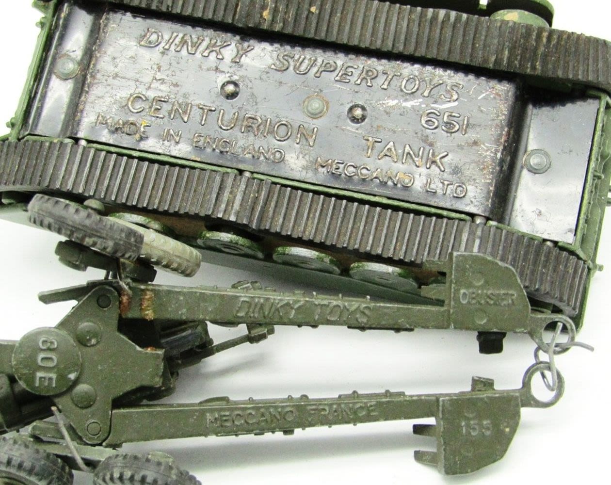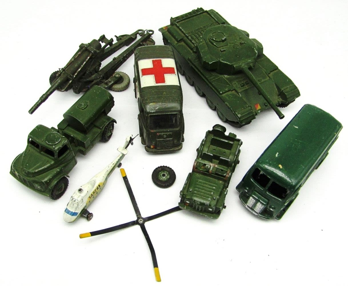 #651 Supertoys Centurion Tank, #80F Ambulance Militaire Made in France, #674 Austin Champ, #643 Army Water Tanker, #80E Obusier 155MM French Field Gun (Wheels are funky), #60D Helicopter Sikorsky S.58 Sabena France Model (Blades are Detached from Copter), Peugeot D.3.A. 258 Fabrique En France Par Meccano Postes; Used Conditions.