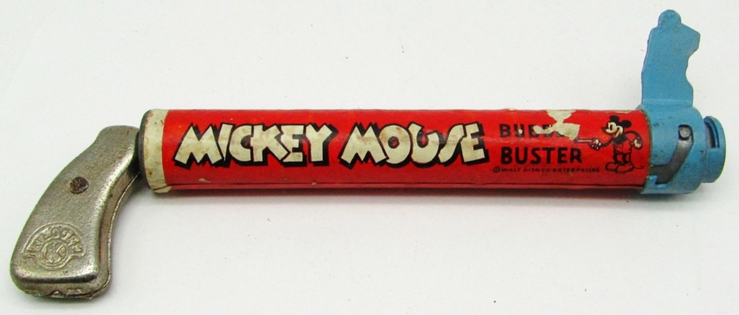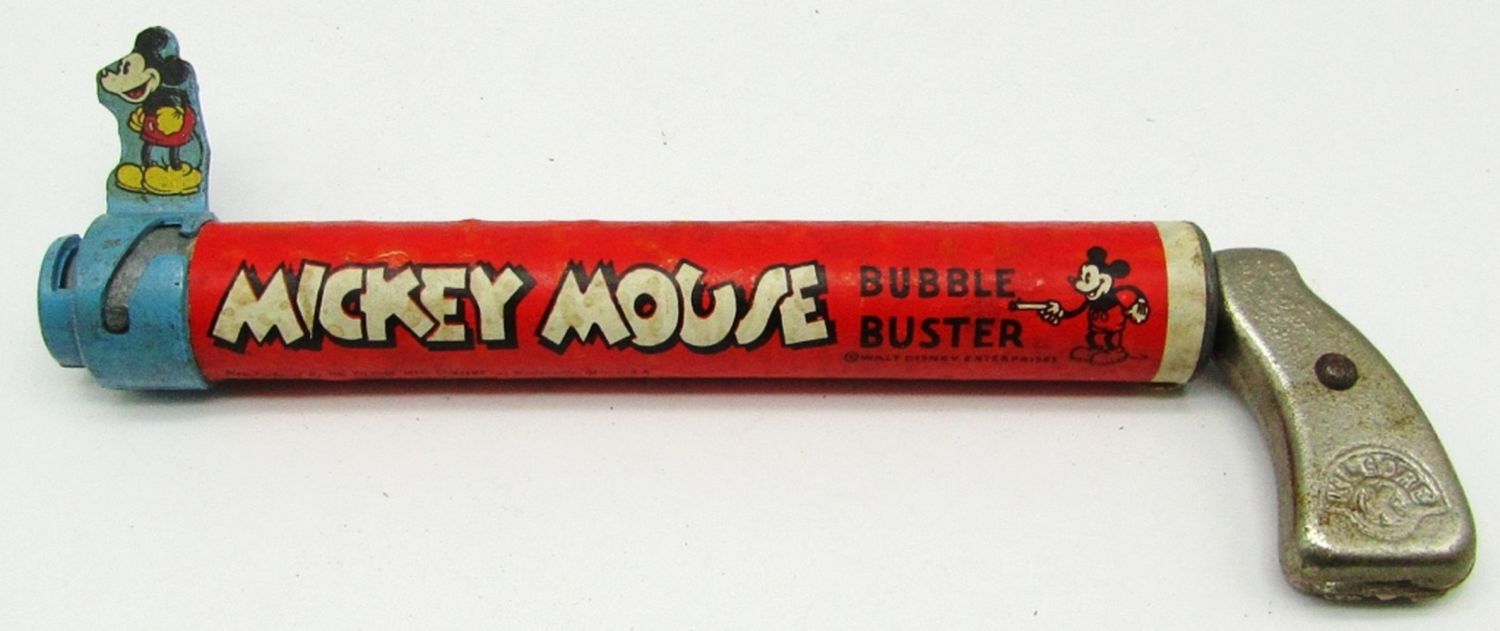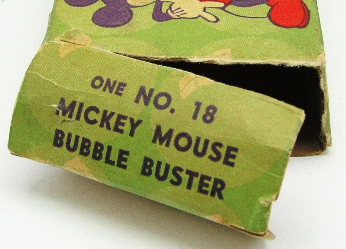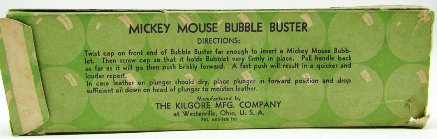 Killgore Handle, With Original Box (Has detached side flaps, and general wear and tear from age); Used Condition, Comes with Mickey Mouse Bubblets (crushed pieces of the bubblets).