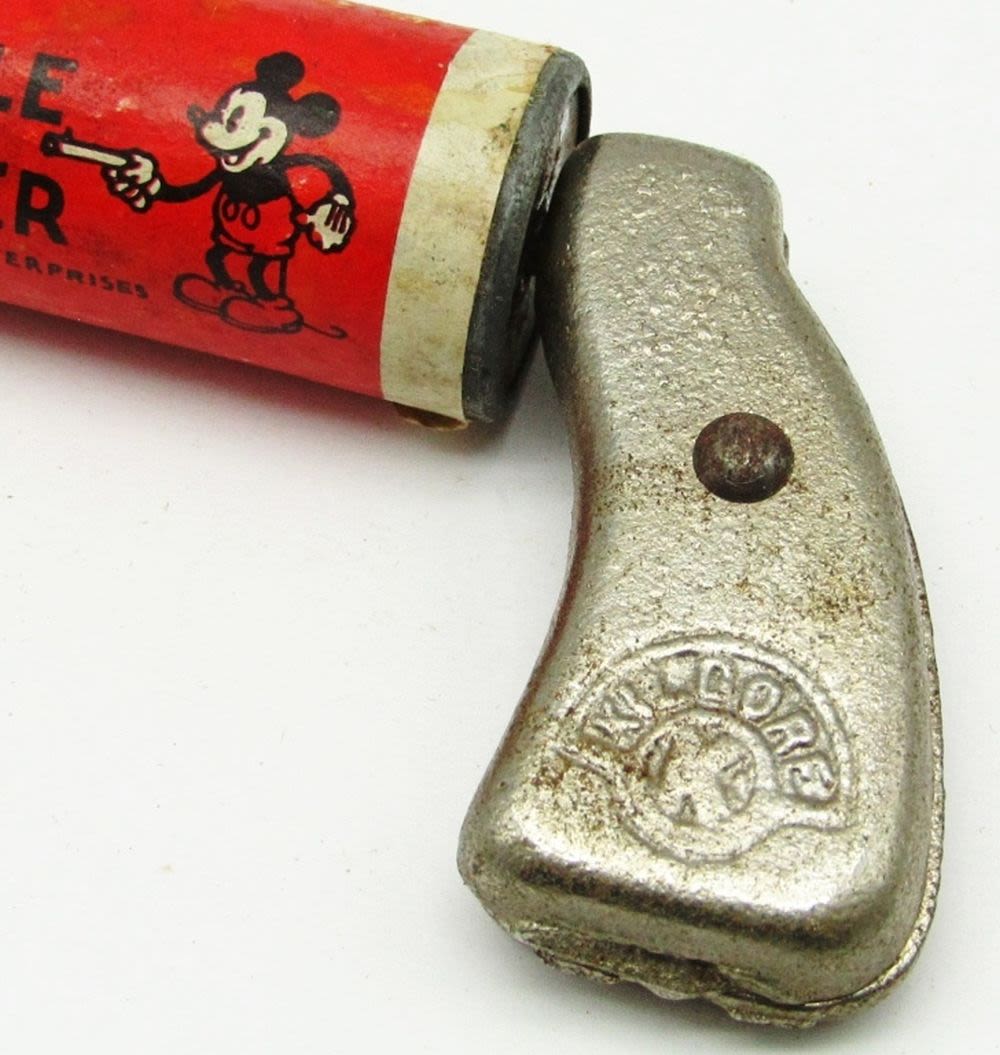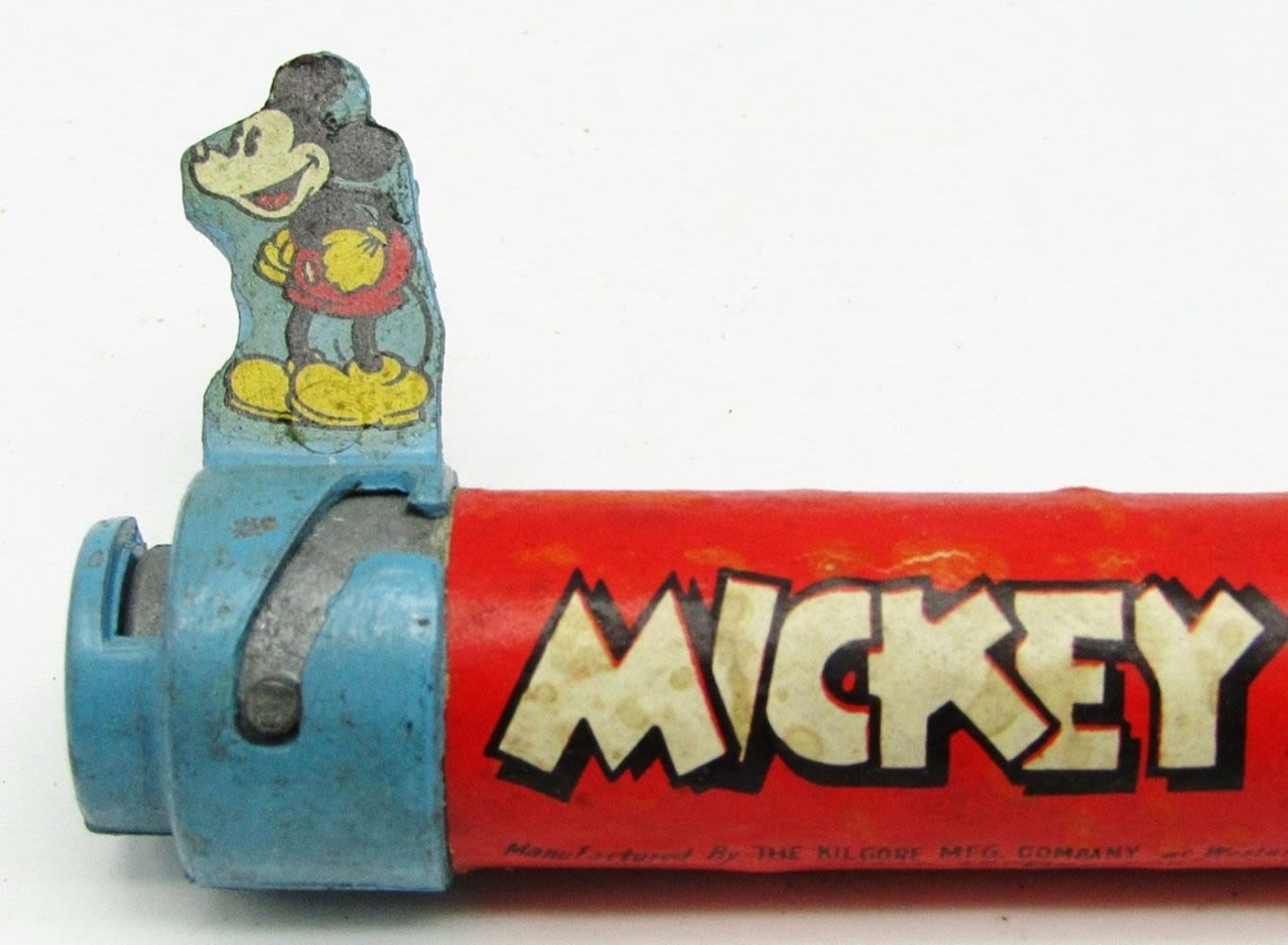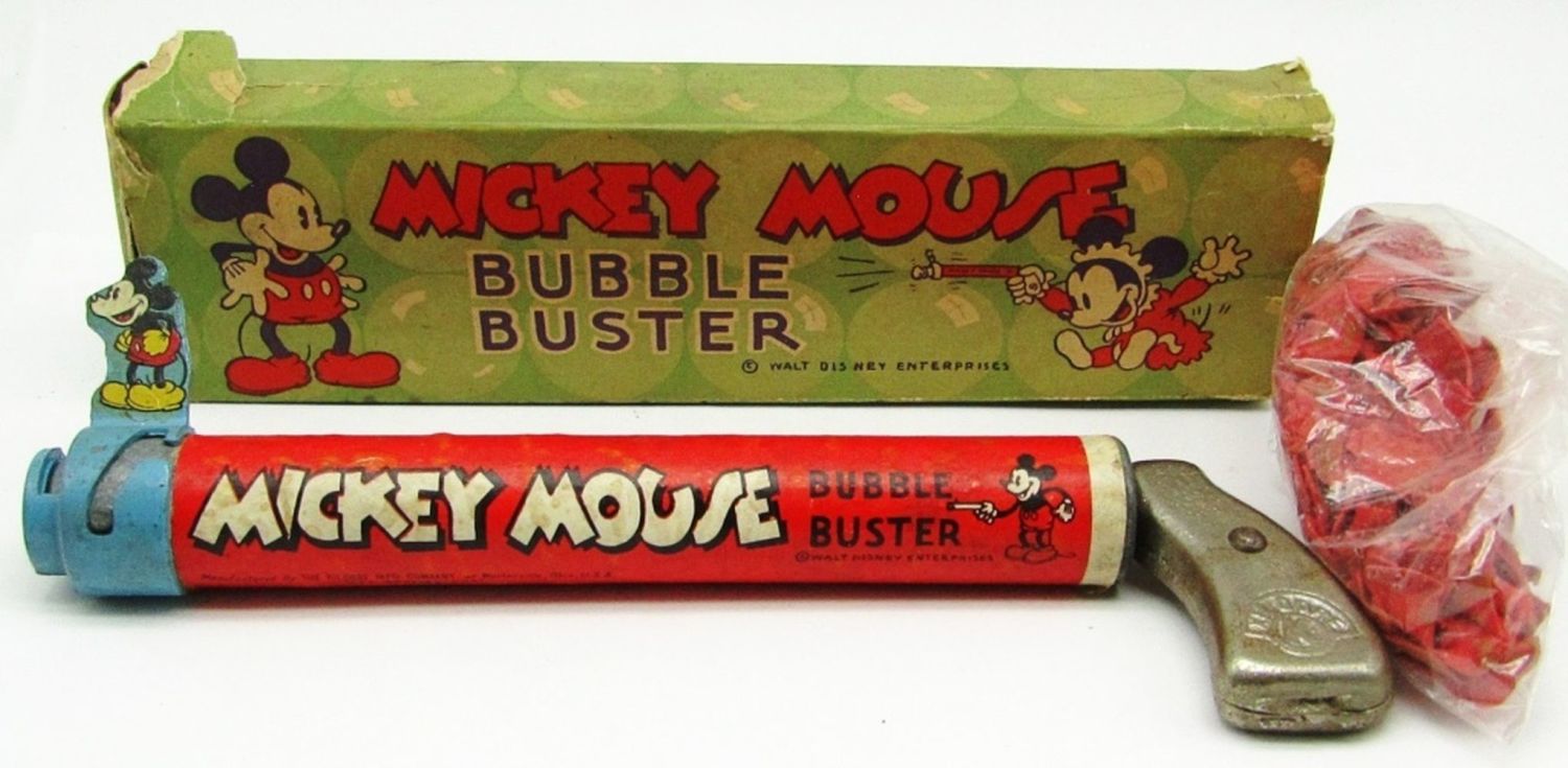 Killgore Handle, With Original Box (Has detached side flaps, and general wear and tear from age); Used Condition, Comes with Mickey Mouse Bubblets (crushed pieces of the bubblets).