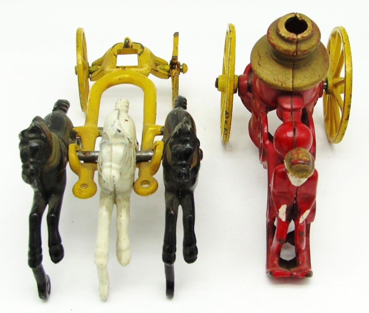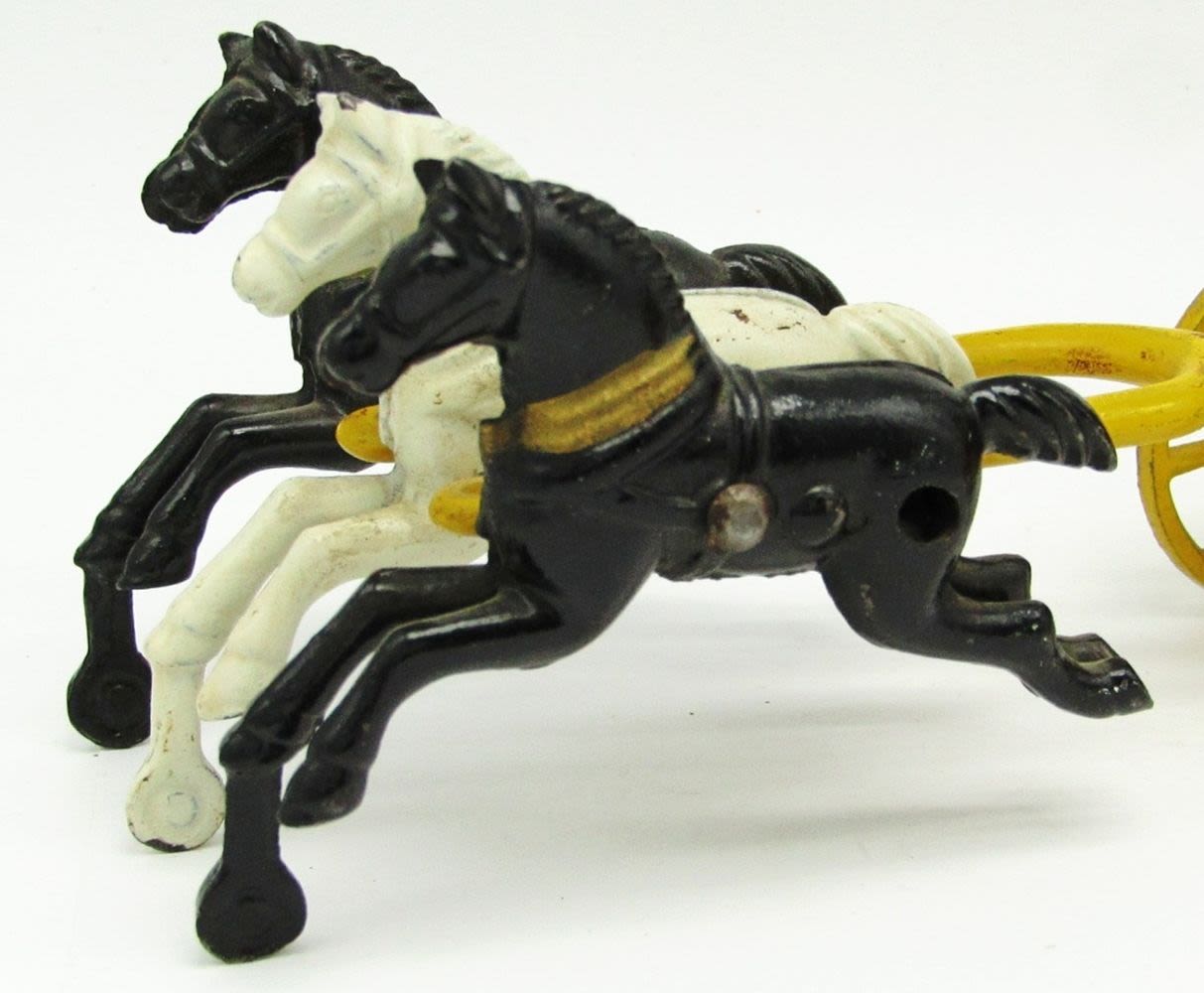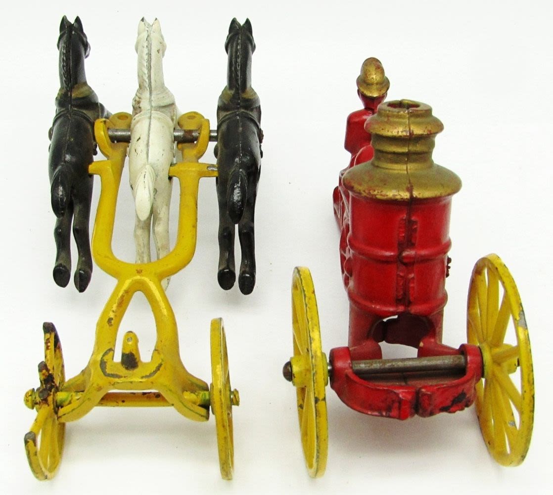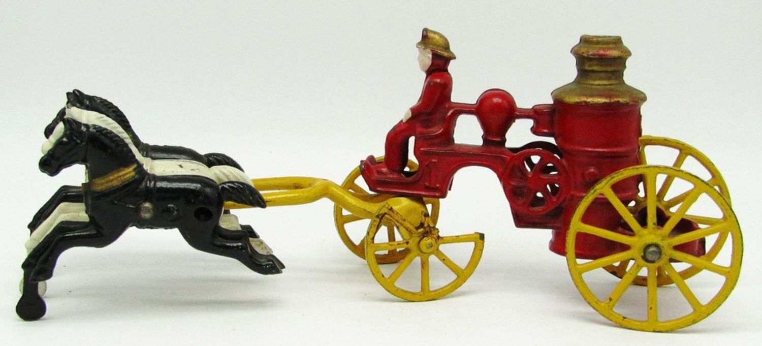 (1) Horse Wheel is Broken; Cast Iron Horse Drawn Fire Pumper Toy; Used Condition.