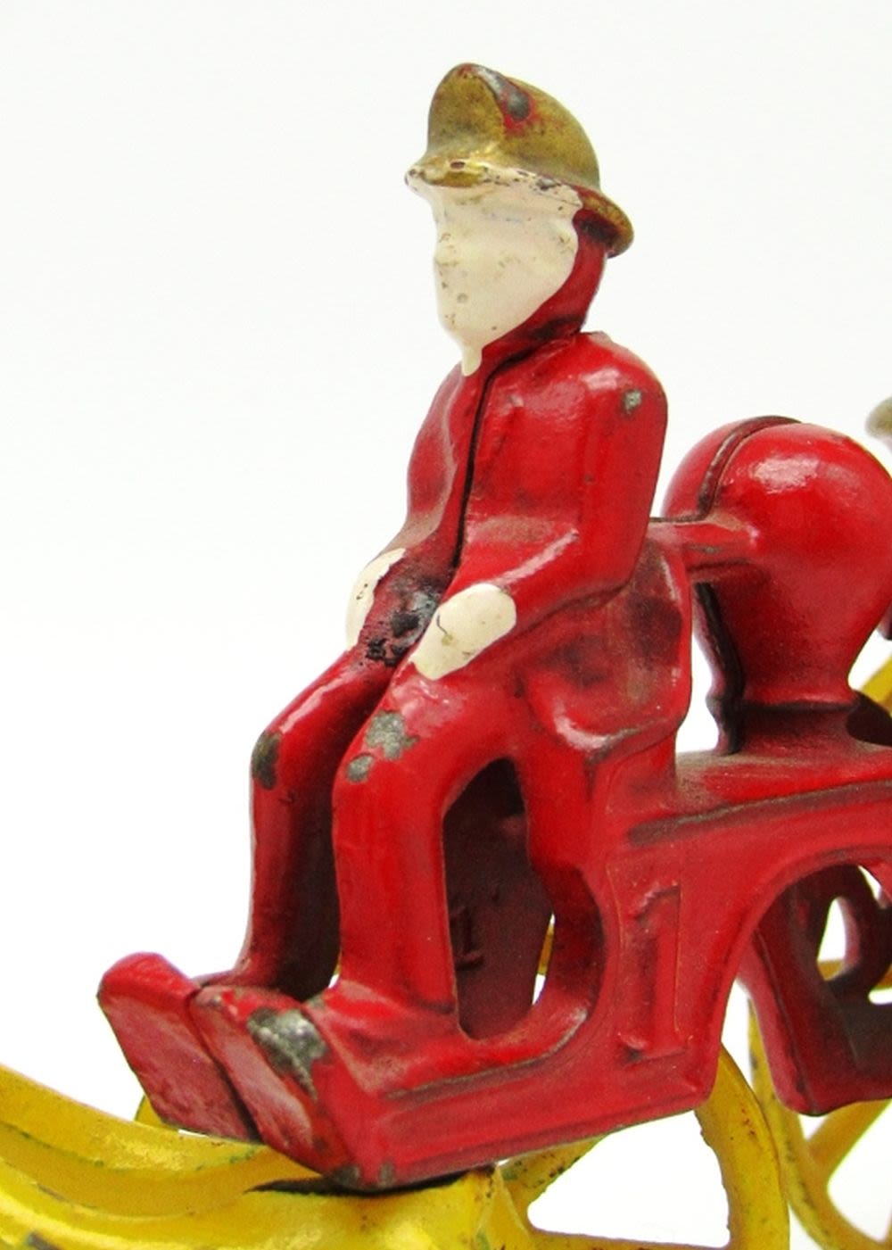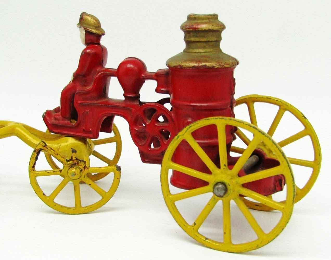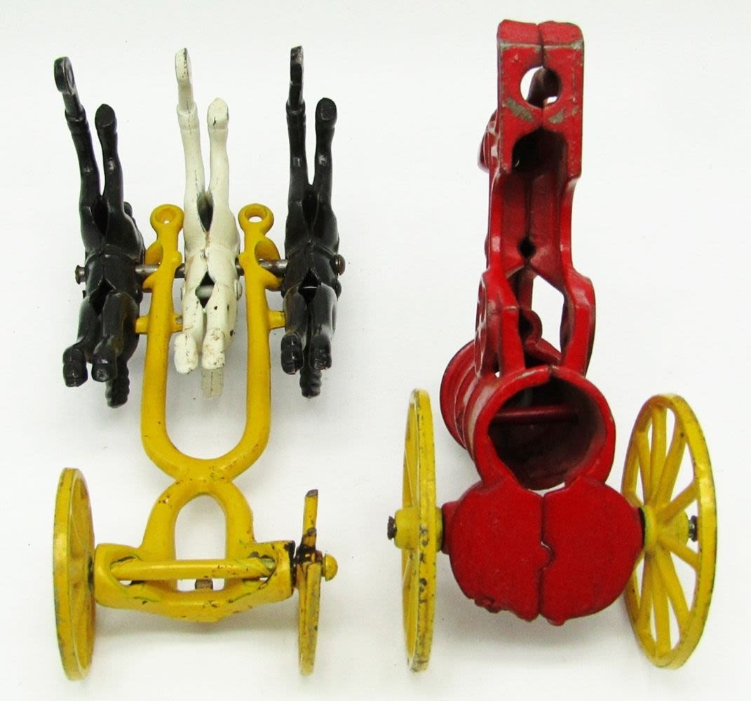 (1) Horse Wheel is Broken; Cast Iron Horse Drawn Fire Pumper Toy; Used Condition.