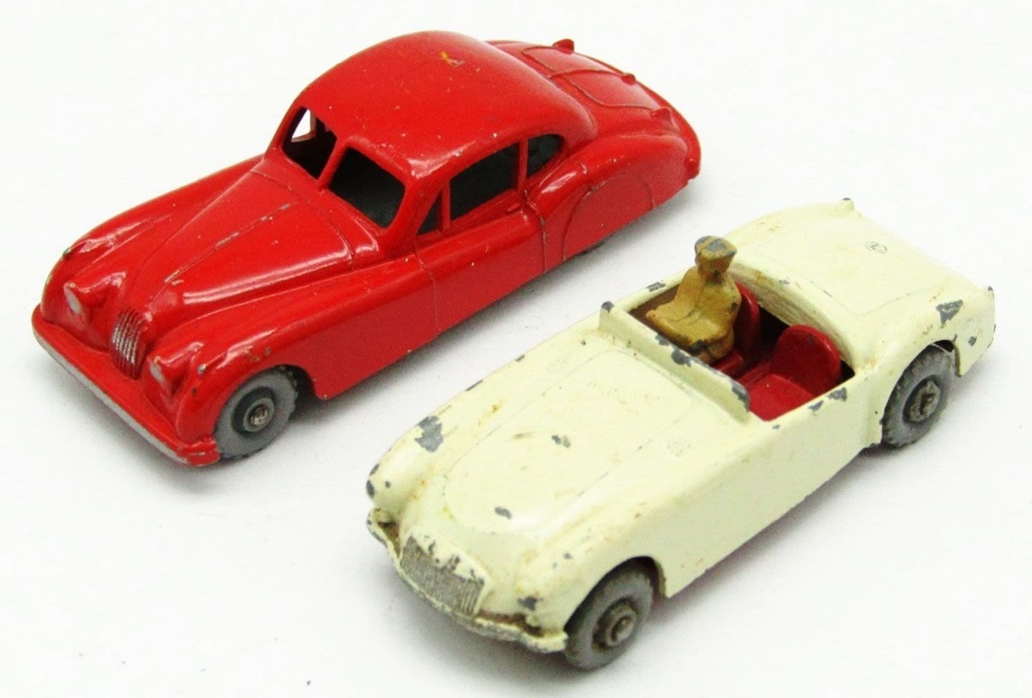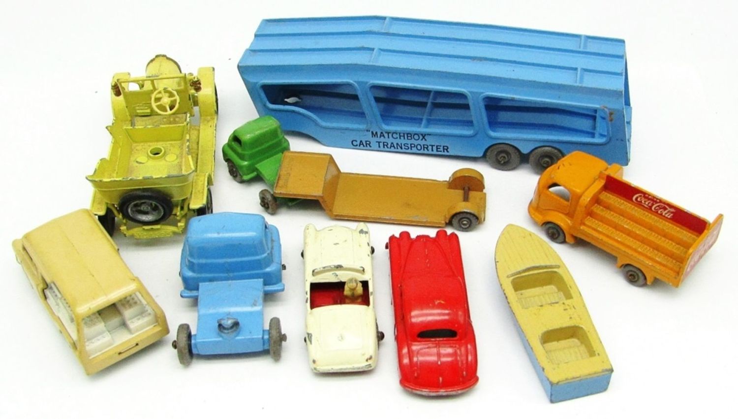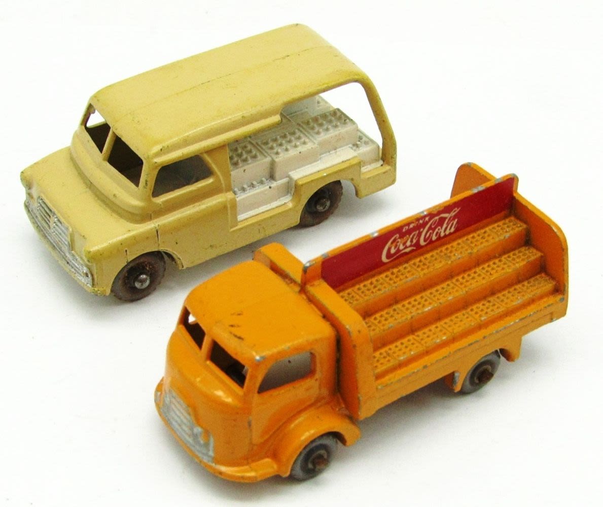 “Matchbox” Car Transporter No.2, 1904 Spyker, No. 29 Bedford Milk Van, Yellow Coca Cola Karrier Bantam 2 Ton Truck No.37, Meteor Sportsman MK II No.48, No.27 Bedford Low Loader Truck, MGA Sports Car No.19 (With Driver), No.32A Jaguar XK 140 Coupe Red Body (RARE!); Used but Good Conditions!
