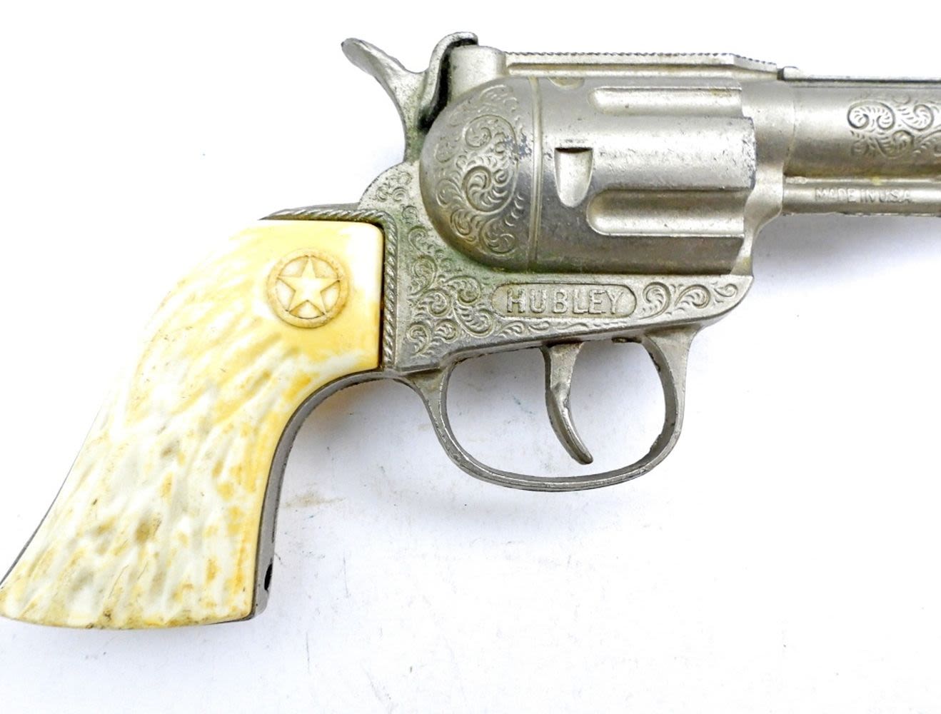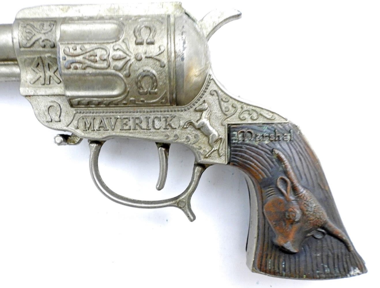 1- 10IN LONG, MAVERICK MARSHAL WITH A BULL AT THE HANDLE, GUN CLICKS (BUT DOES GET STUCK FOR REPAIR), 1- 8IN LONG, HUBLEY RODEO
