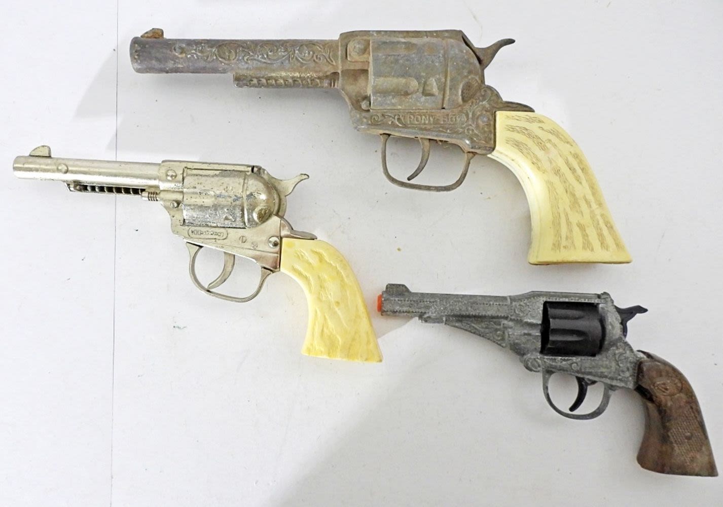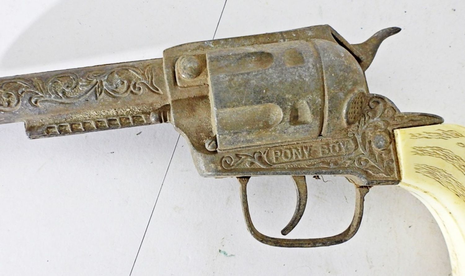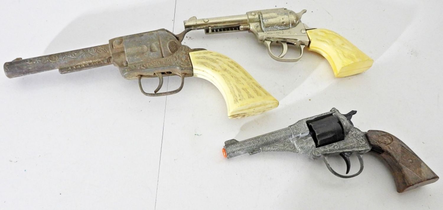 1- EDISON GIOCATTOLI SPA MADIE IN ITALY CAP GUN, 7IN LONG, TIGGER CLICKS, 10IN LONG, PONY BOY, TIGGER CLICKS BUT DOES GET STUCK, 1-HUBLEY, TIGGER CLICKS