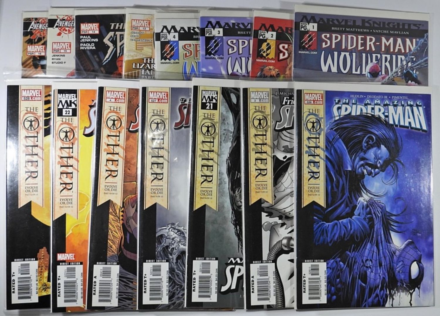 THE OTHER – EVOLVE OR DIE PARTS 6-12; SPIDER-MAN WOLVERINE #1-4; THE SPECTACULAR SPIDER-MAN #13-27; THE AMAZING SPIDER-MAN #522, 523, 505, 506. INDIVIDUALLY SLEEVED & BOARDED.