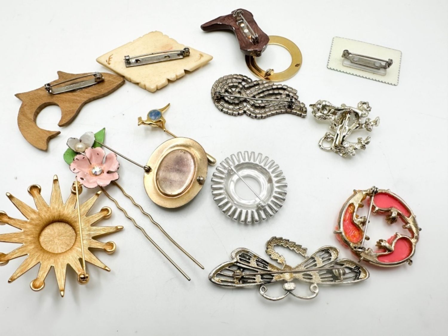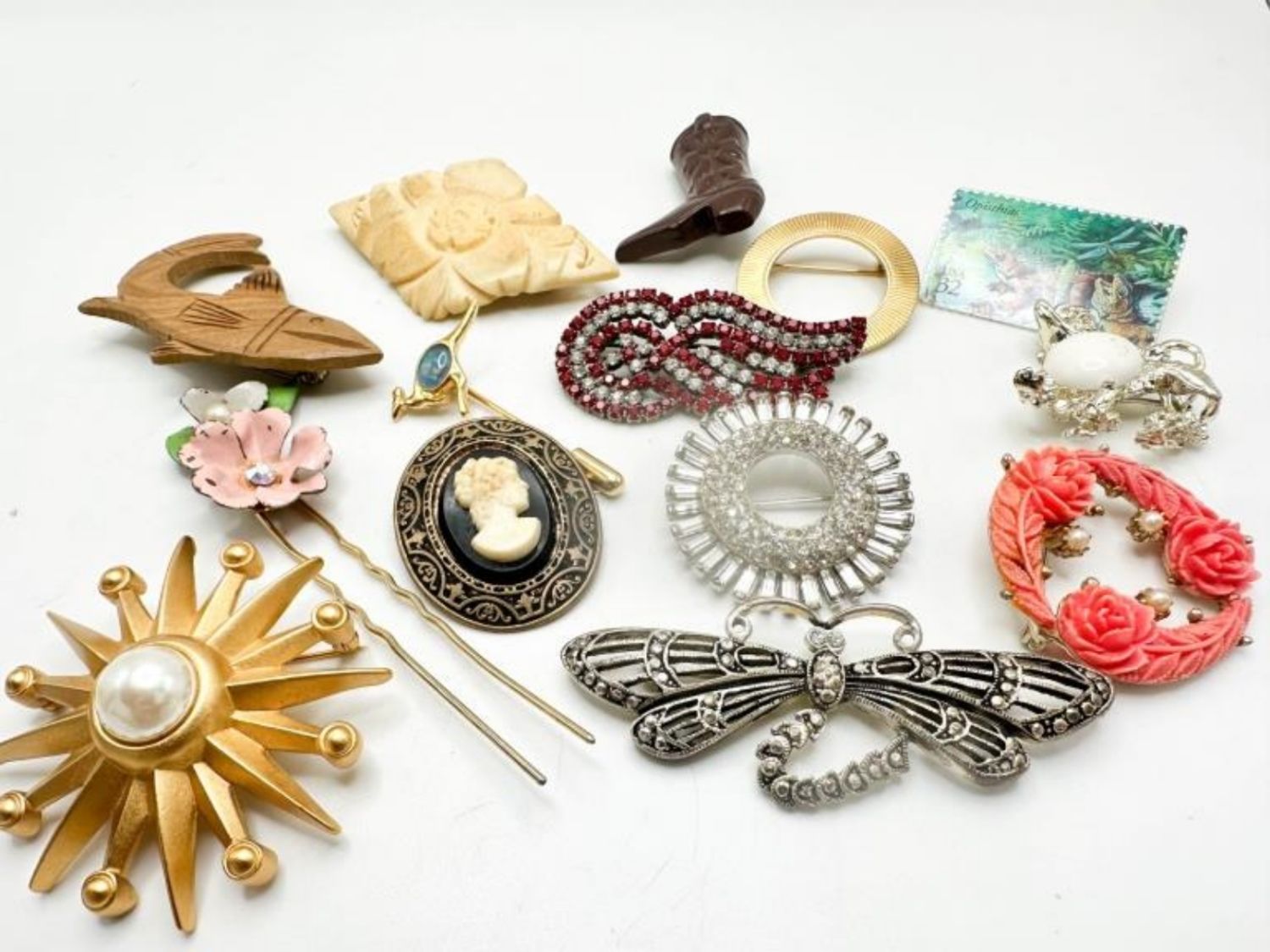 ASSORTED BROOCHES , CAMEO ,DRAGONFLY, STAR, FLORAL , CRAB, CIRCLES AND MORE