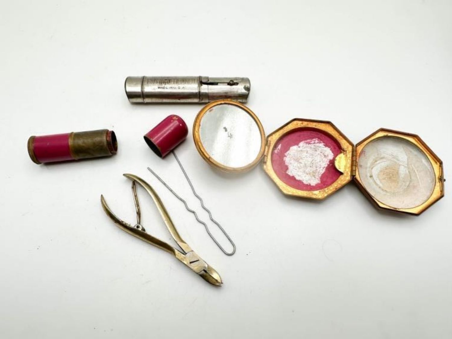 VINTAGE BEAUTY ITEMS, LIPSTICK HOLDERS, PAINTED COMPACT, CLIPPERS