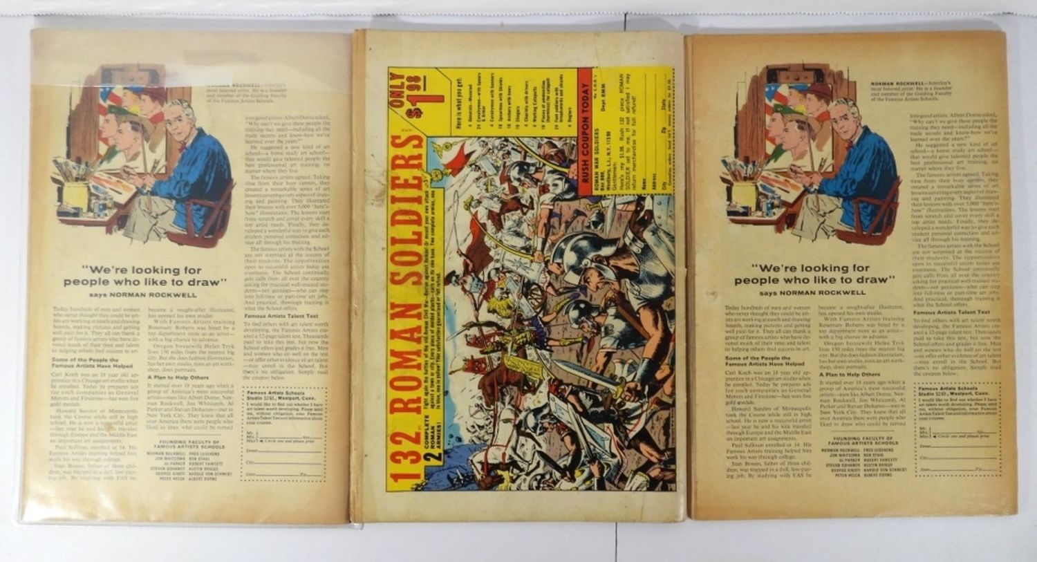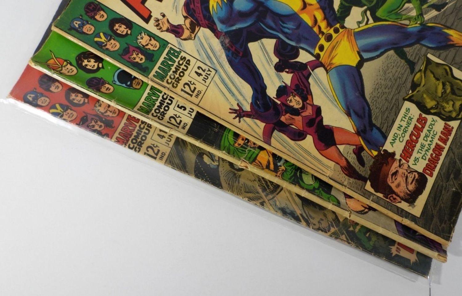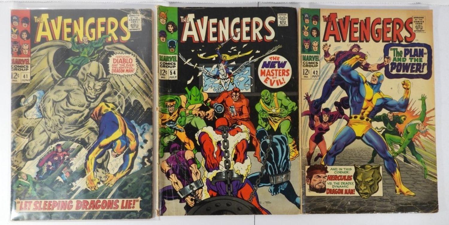 Avengers #41 “Let Sleeping Dragons Lie!” – Complete Book, Silver Age, Fair Condition; Avengers #42 “The Plan and the Power!” – Complete Book, Silver Age, Fair/Poor Condition; Avengers #54 “The New Masters of Evil!” 1st Cameo of Ultron – Complete Book, Silver Age, Poor Condition (Middle Page is Detached From Staples in Book).