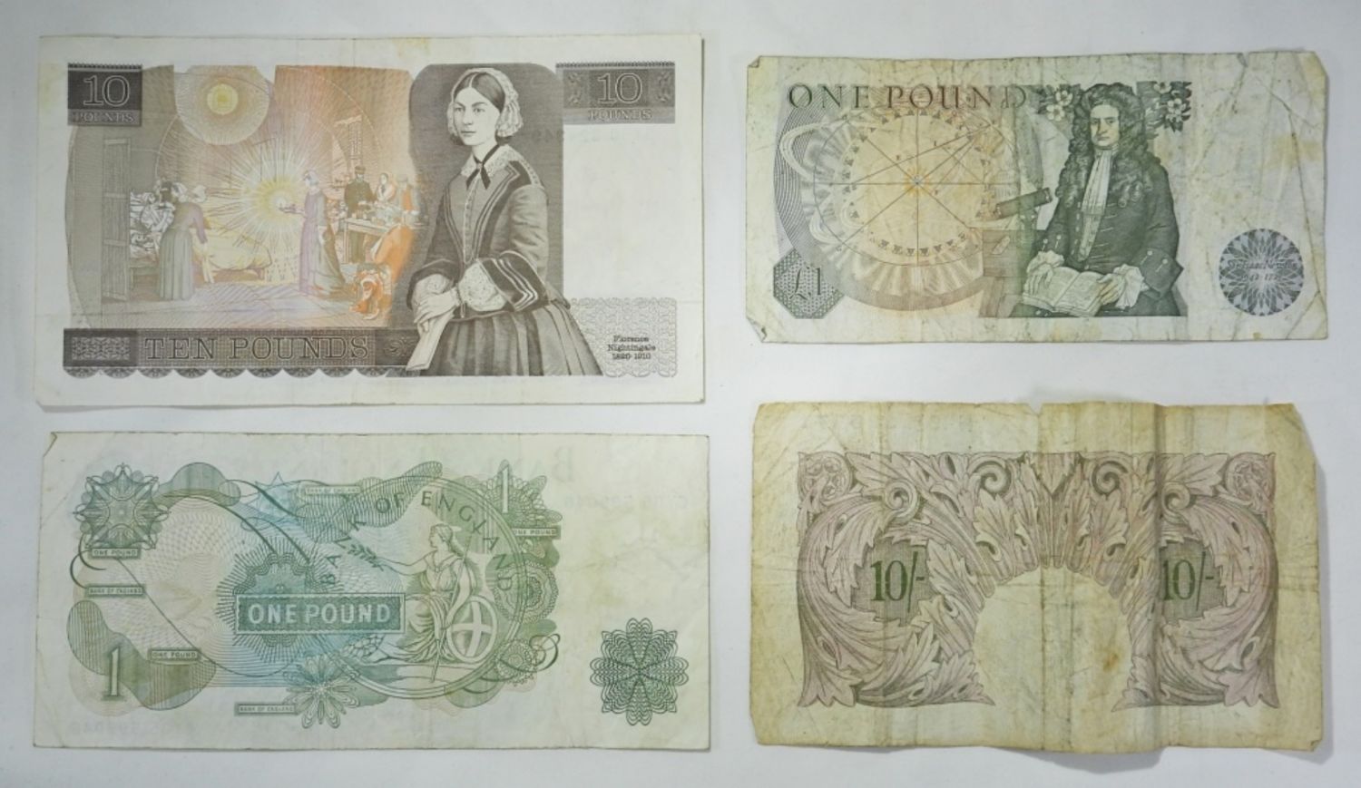 (1) 10 POUNDS, (2) 1 POUND, & (1) 10 SHILLINGS. MIXED DATES & CONDITIONS.