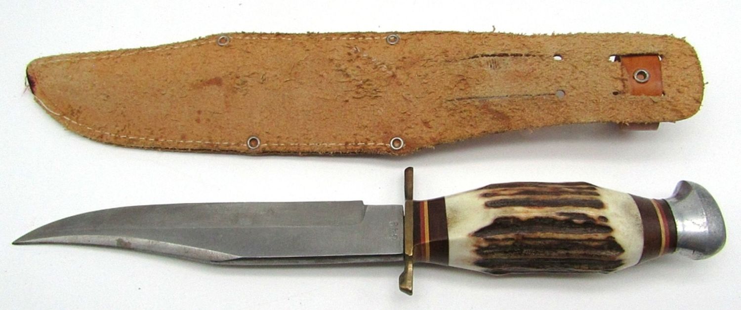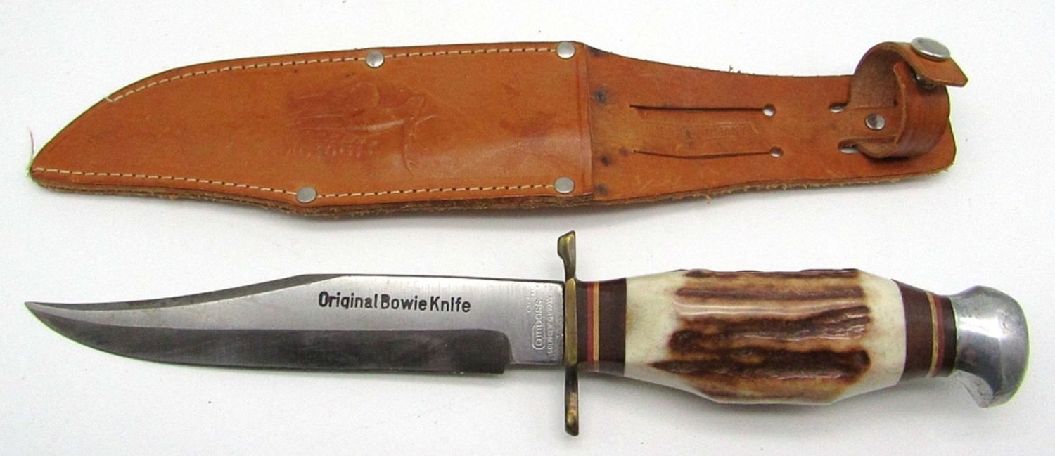Blade Marked “Original Bowie Knife Compass Solingen Germany 849”, Sheath Marked “Made In Germany”, 6″ Blade, 11.25″ Overall Length. Used Conditions.