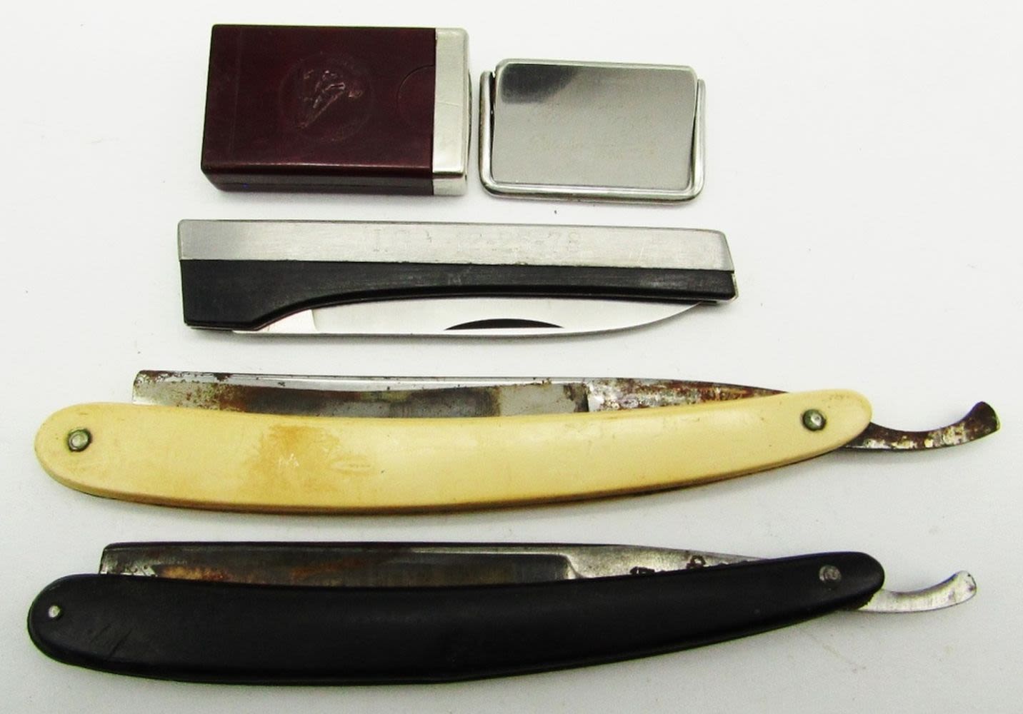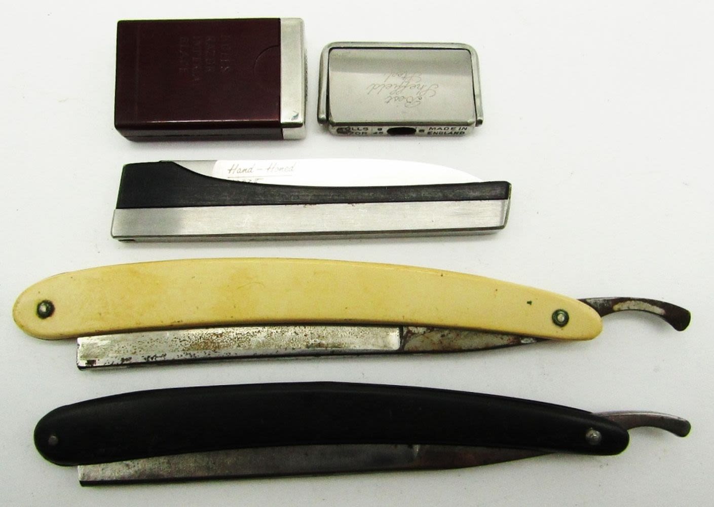 Two Golden Men Straight Razor, Forge Johan Razor Sheffield Straight Razor, Hand Honed Vernco Hi-CV Single Blade Folding Pocket Knife, Rolls Razor G 45 Made in England (Razor Head ONLY!) In Holder; Like New/Used Conditions.