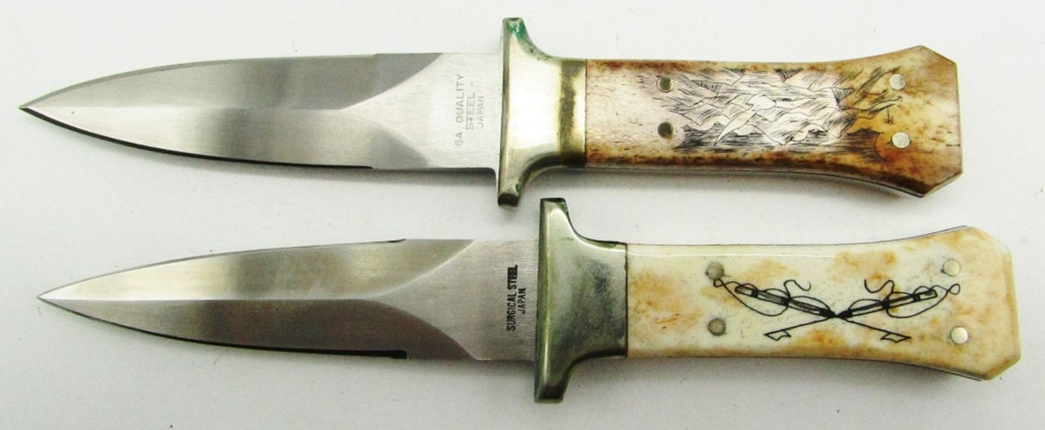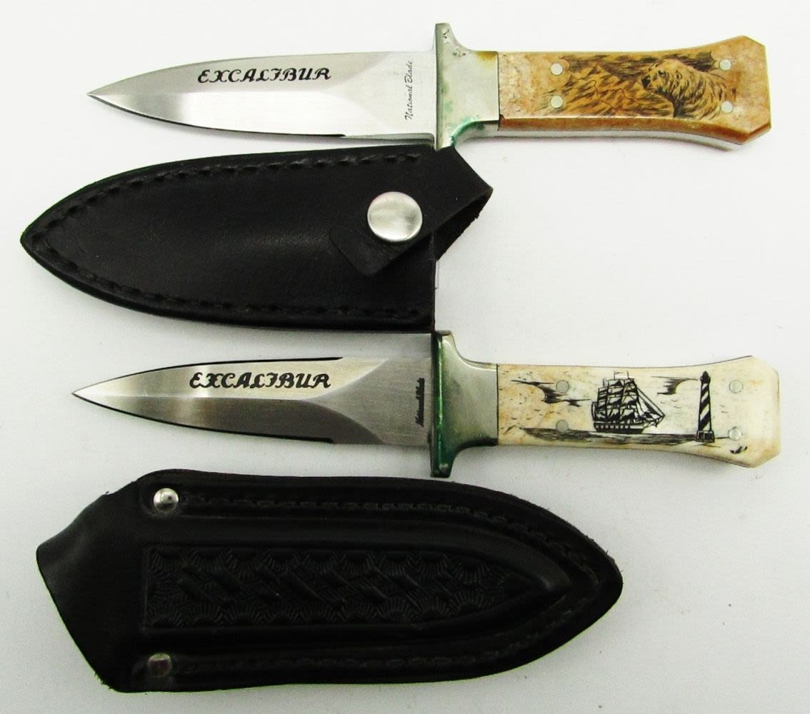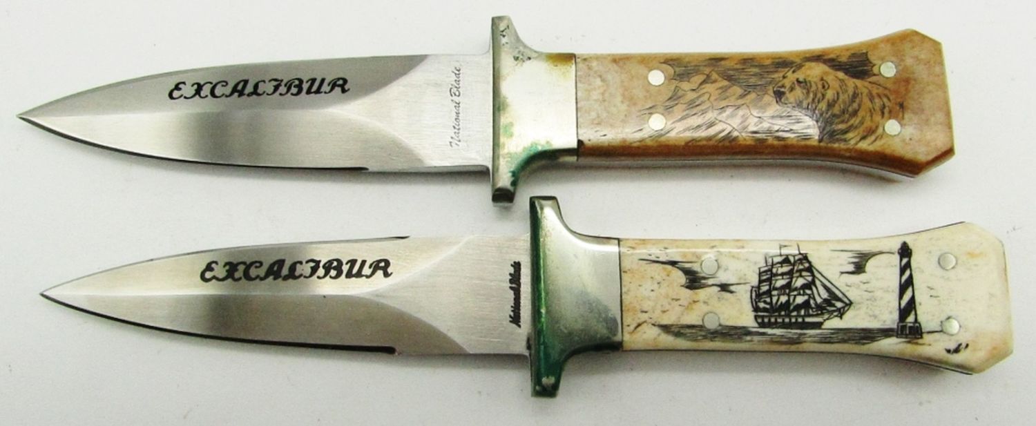 Scrimshaw Ship at Sea & Polar Bear in Ice Mountains; Both Marked “Excalibur” on Blade; Like New Conditions.