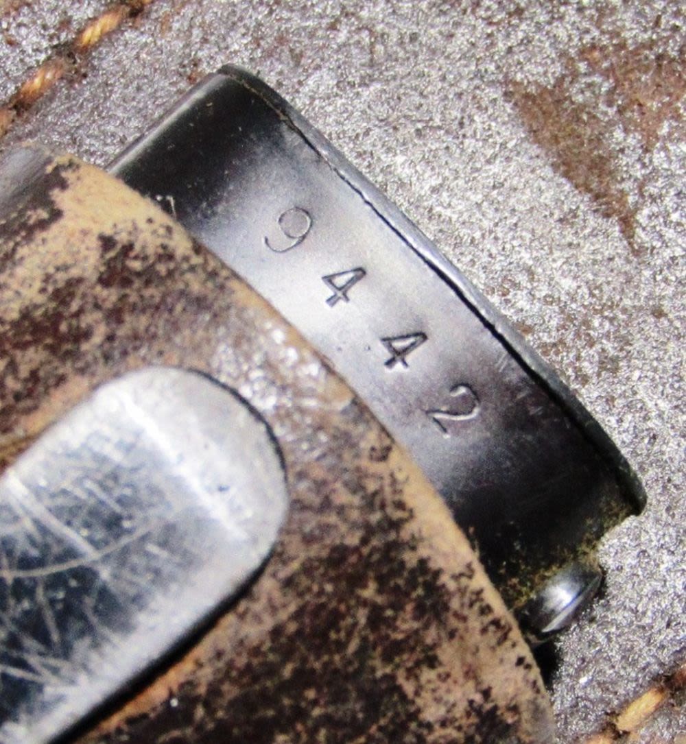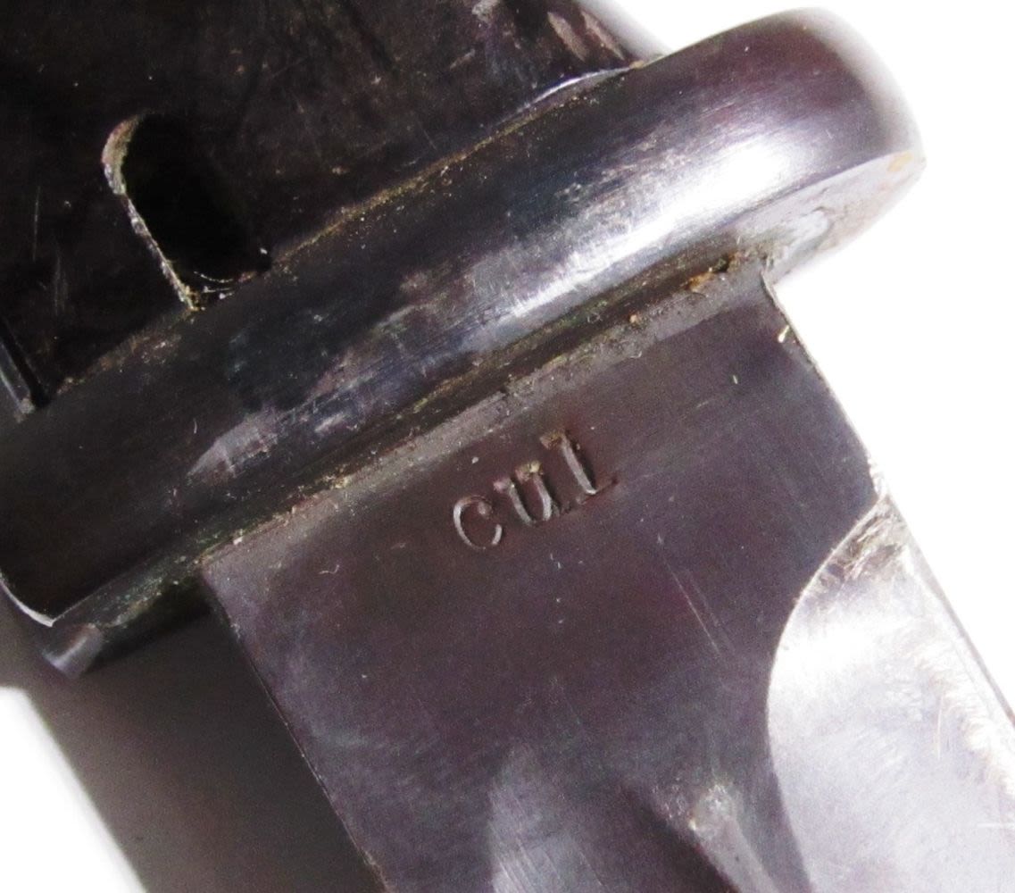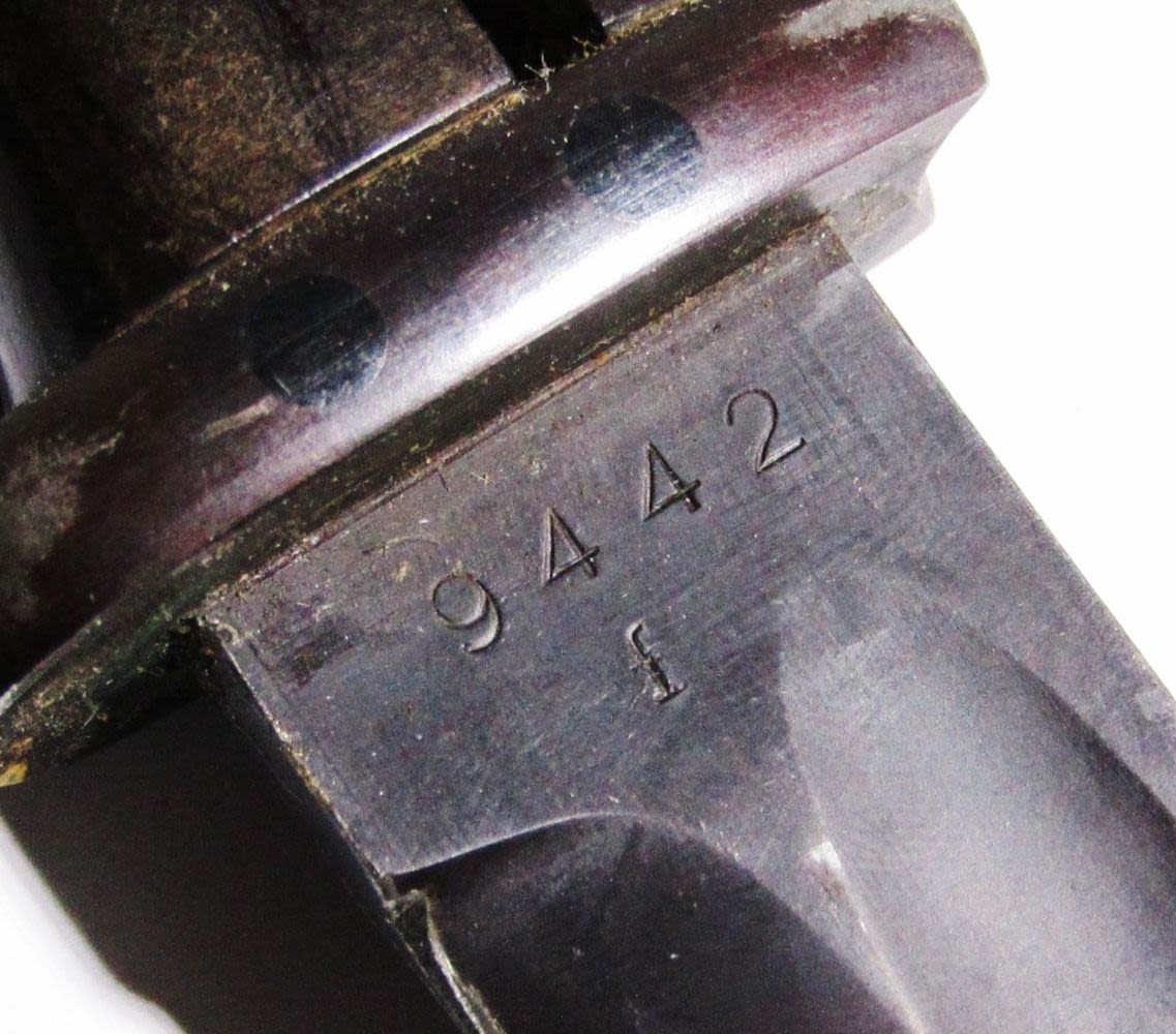 Marked “9442 f” on Blade & Scabbard, “CUL” on Blade and “CUL 1940” on Scabbard; Frog Marked “1939” With Other Indistinguishable Writing; 9.78″ Blade, 16″ Overall. Good Condition!