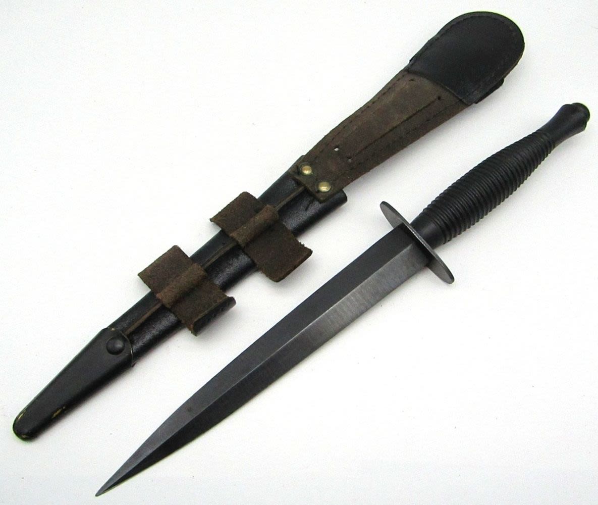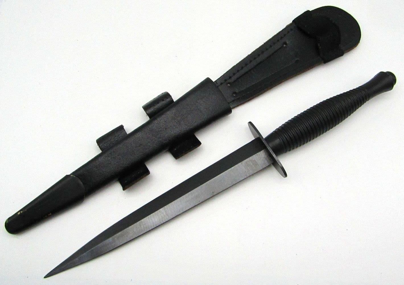 7″ Double Edge Black Carbon Steel Blade, Leather Sheath; Good Condition. Marked “Sheffield England”.
