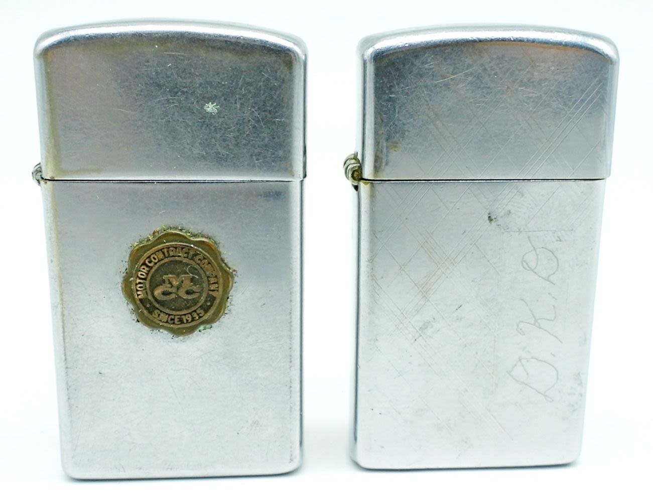 1- 1968 USED CONDITION, ” MOTOR CONTRACT COMPANY SINCE 1935″ ON THE FRONT, 1-1975 ETCHED DESIGN CRAVED “D.K.D”