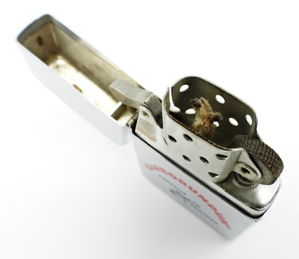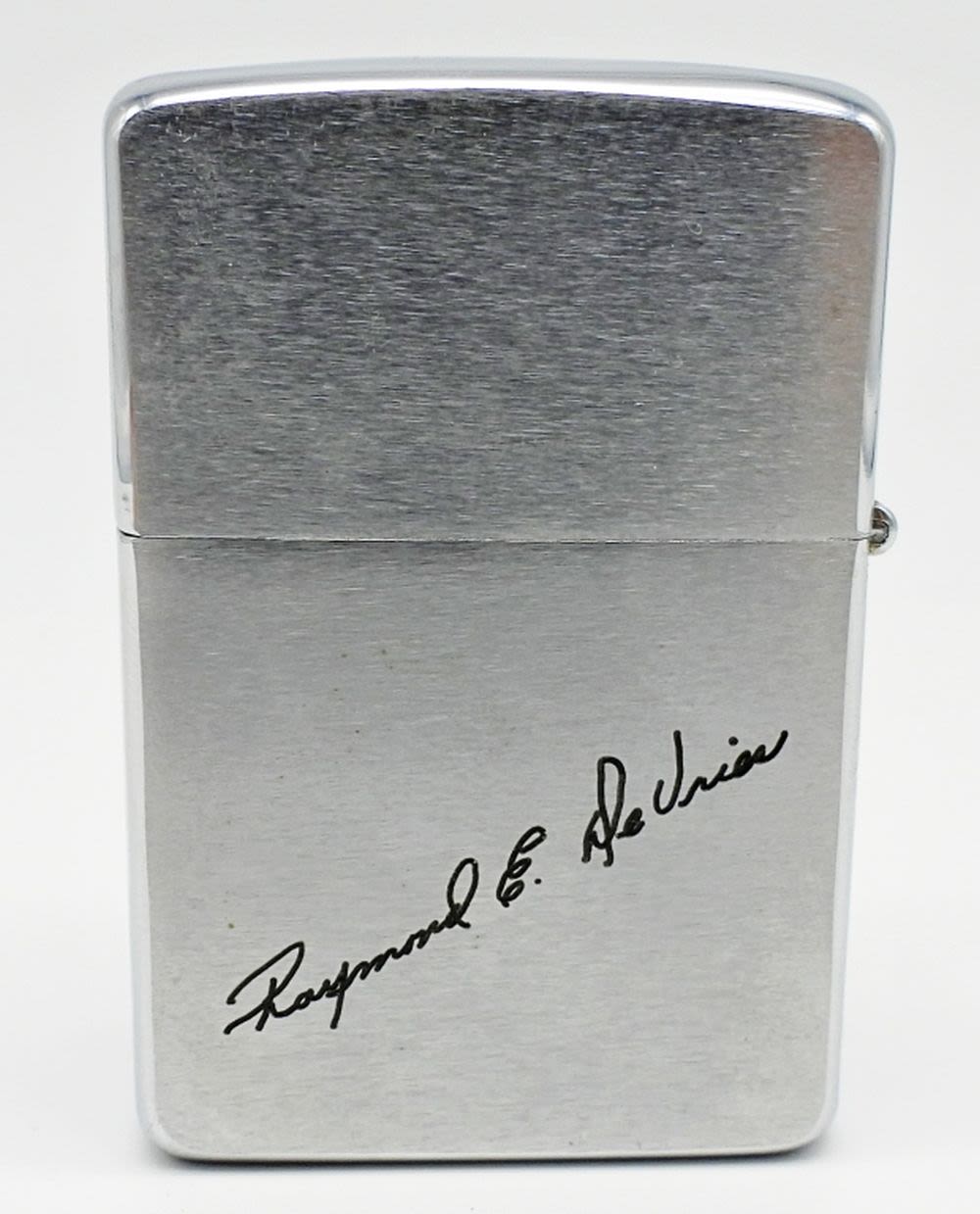 USED CONDITION, CARBORUNDUM ABRASIVE SEMINAR ON THE LIGHTER, IN THE BOX, SIGNED ON THE BACK “RAYMOND DE VRIES”