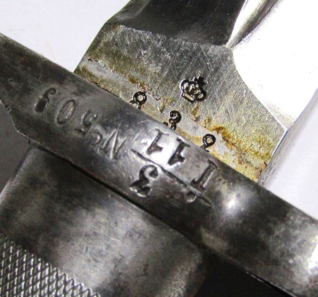Marked “832, 250, I11 No. 509”, “EAB” on Scabbard Throat, Crown on Ball Tip; 8.25″ Blade, 14″ Overall Length; Used Condition.