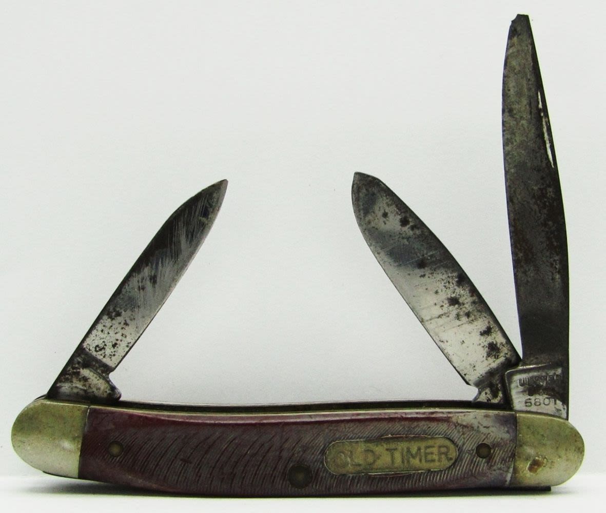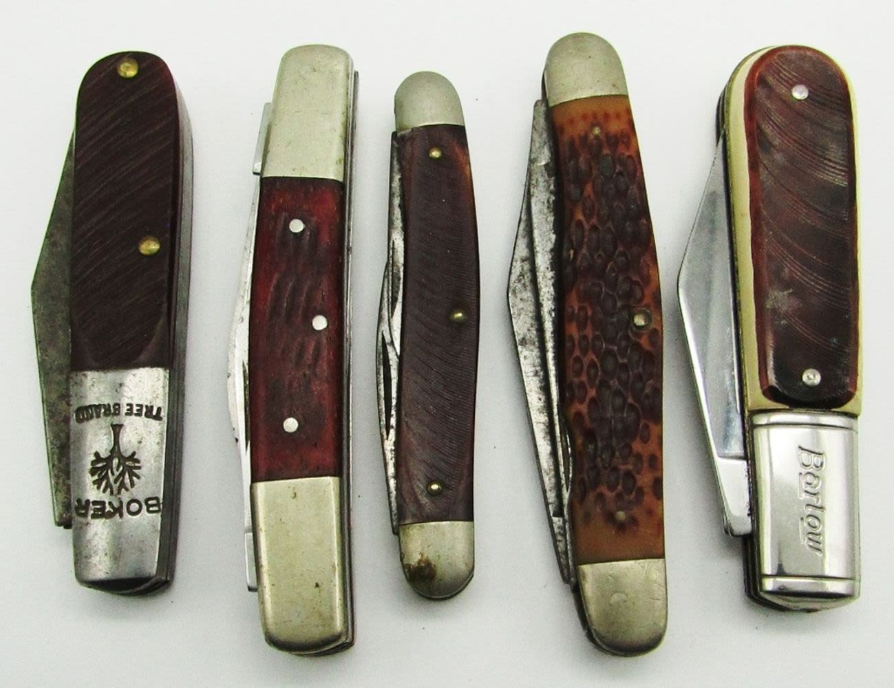 2-Blade Kabar 1063, 5-Blade Unmarked Knife (previously 6-blades, 1 broke off), 2-Blade Barlow Colonial, 2-Blade Boker Tree Brand 493, 3-Blade Old Timer Ulster USA 58OT; Used Conditions.