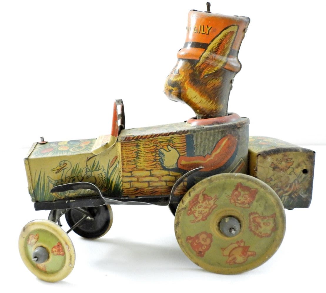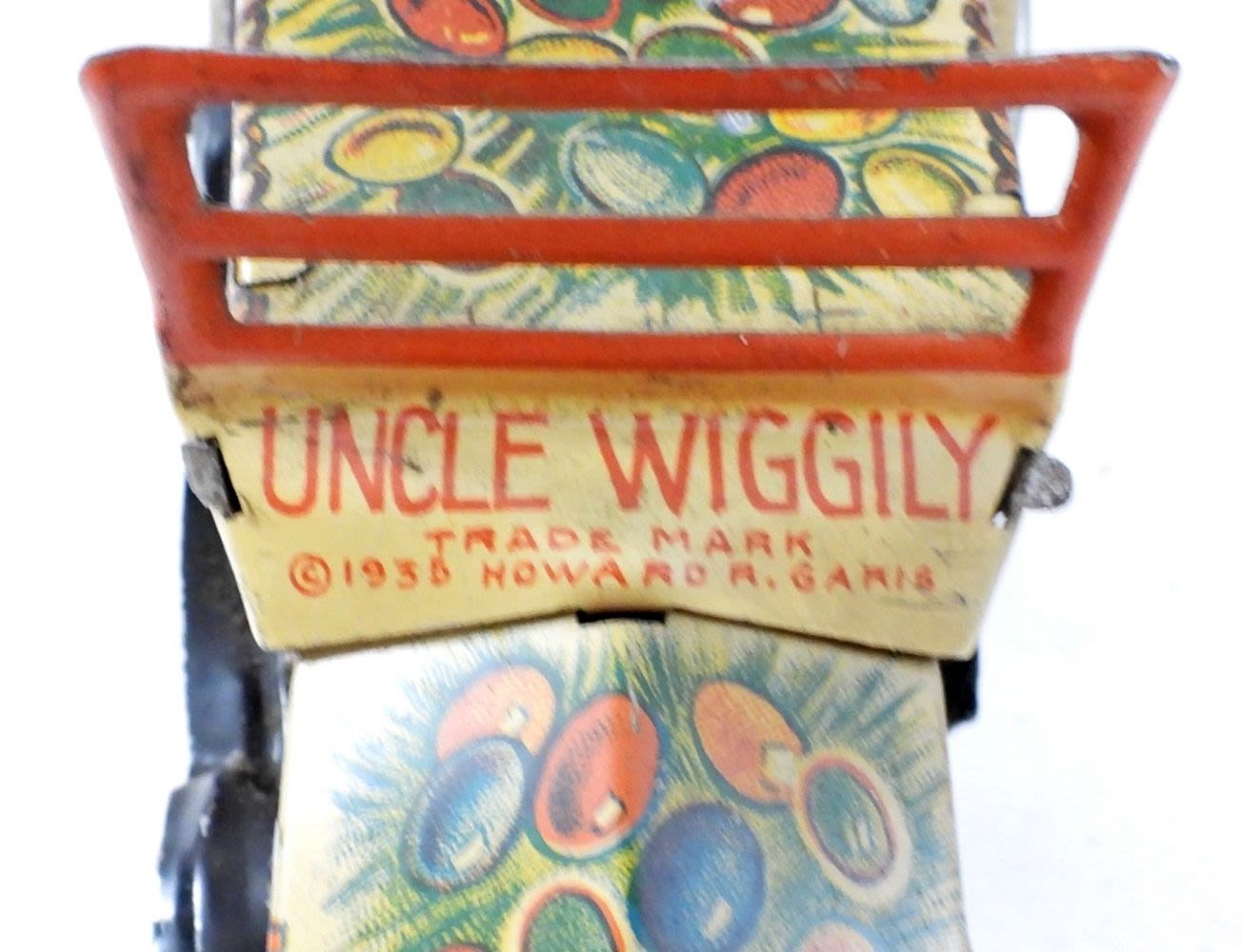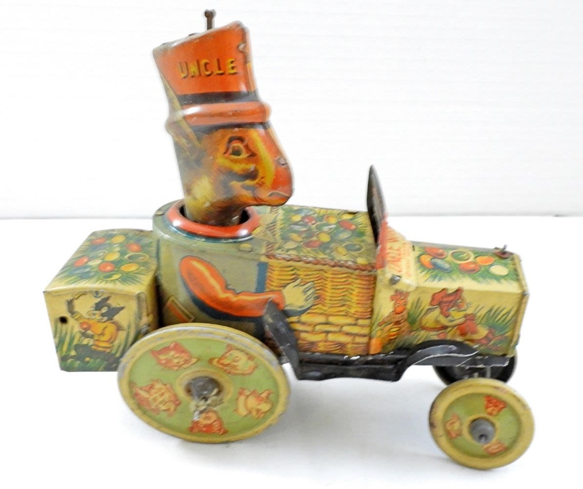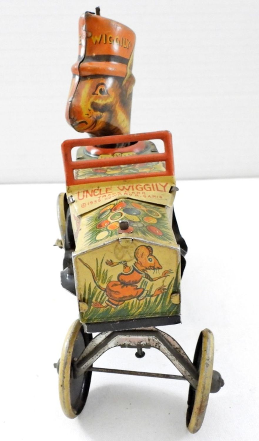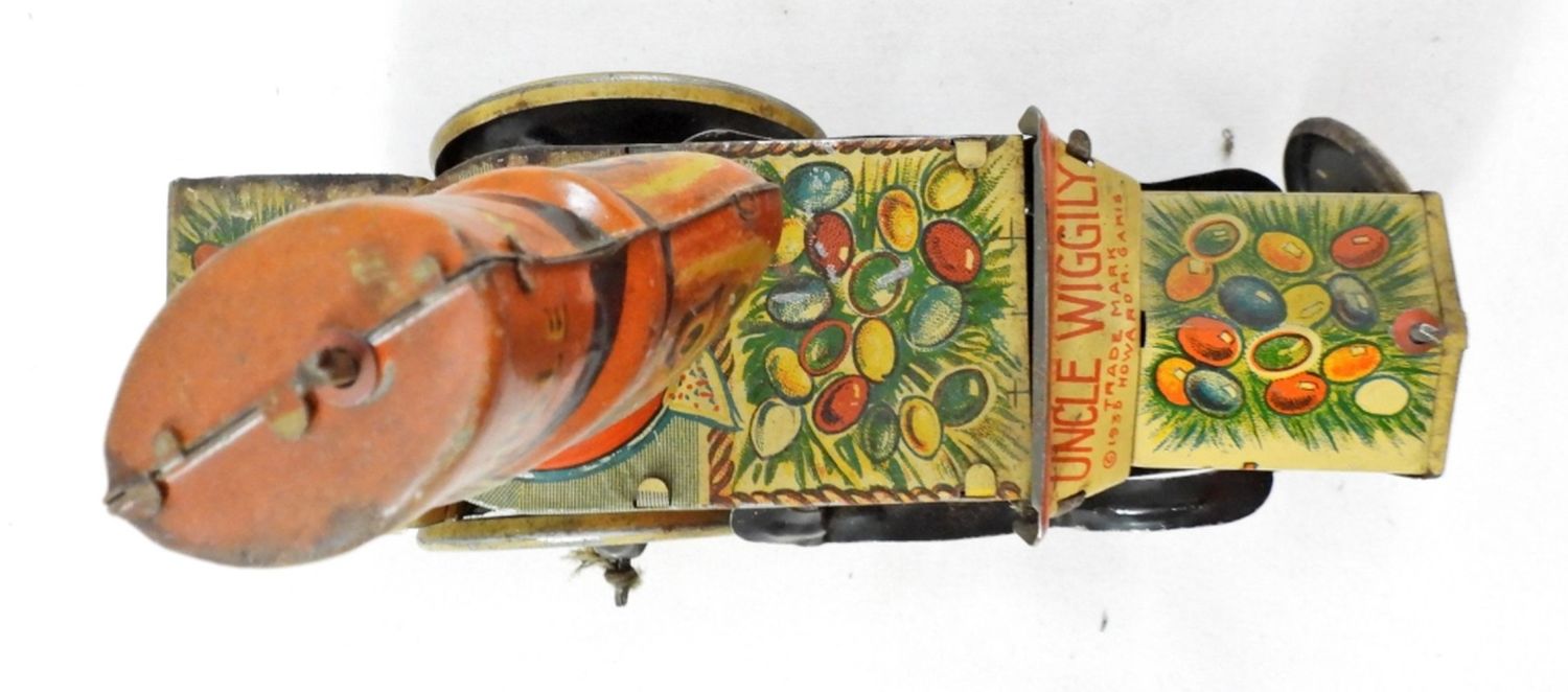 WIND UP NO LONGER WORK COULD BE REPAIRED, WHEELS DON’T MOVE AS MUCH, STAMPED UNCLE WIGGLIY TRADE MARK 1935 HOWARD R. GARIS
