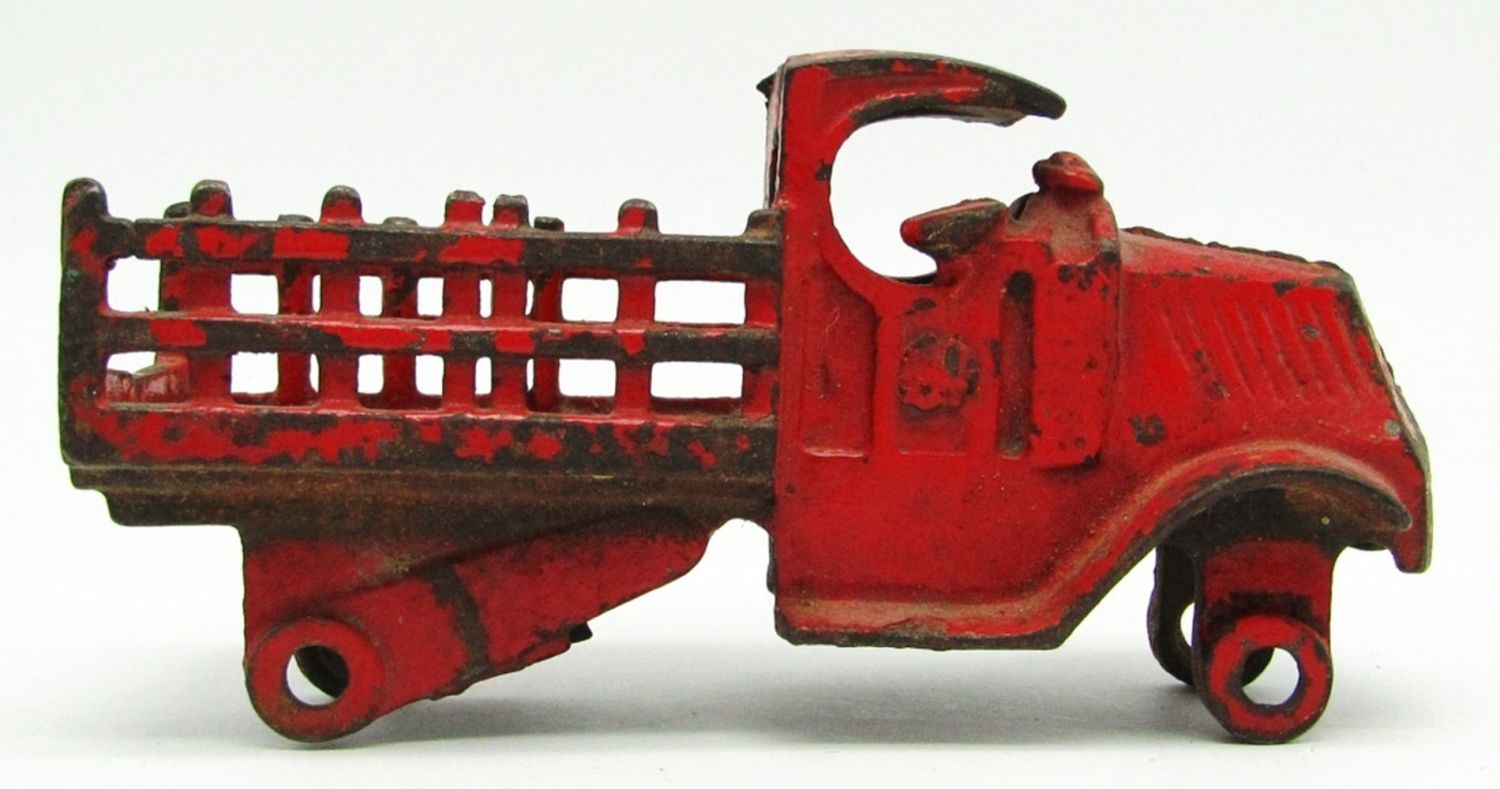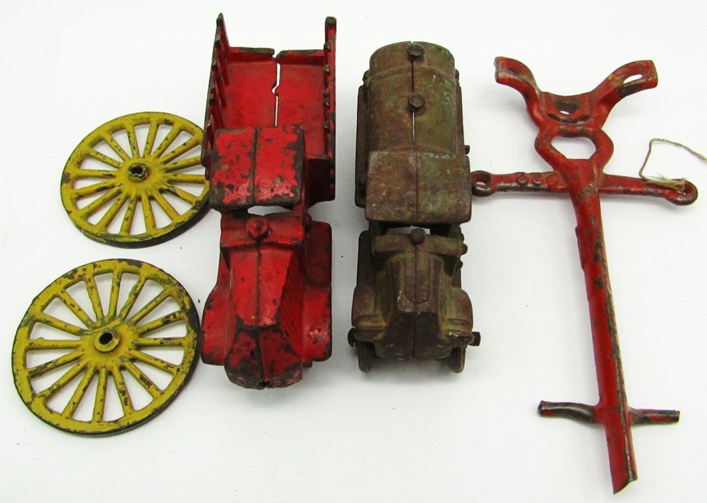 1920’s A.C. Williams Cast Iron Mack Gasoline Tanker, Cast Iron C Mack Stake Body Delivery Truck, Cast Iron Wheels, Cast Iron Horse Together Bar; Used Conditions.