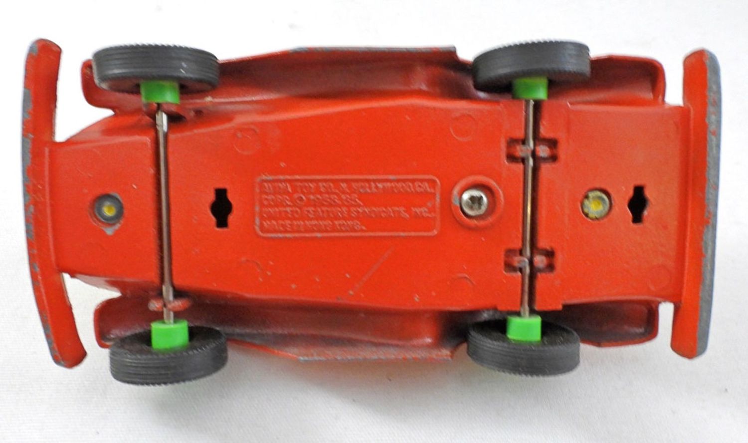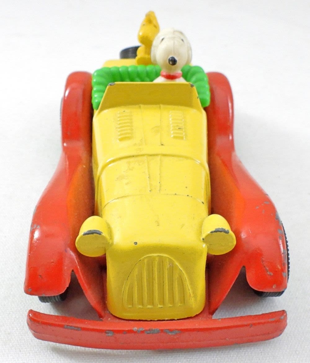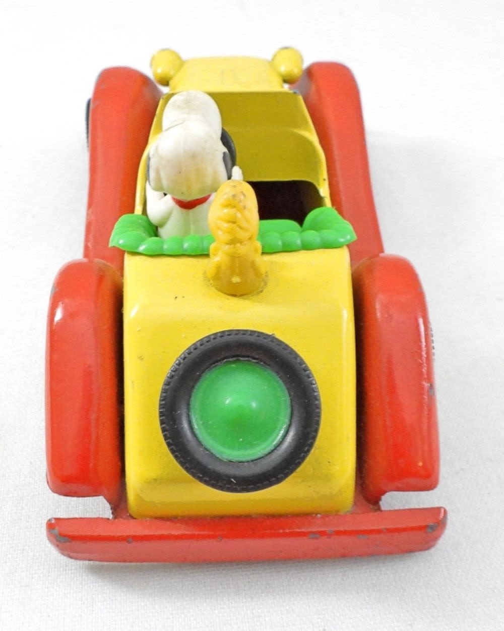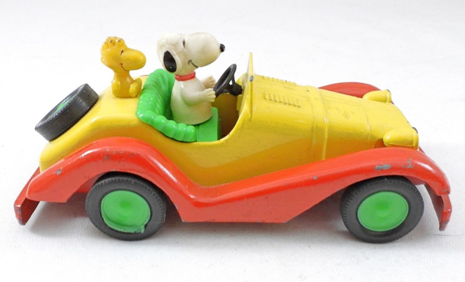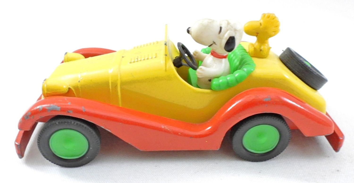 1958, STAMPED WITH BRAND ON THE BOTTOM, WHEELS ARE RUBBER, HAS SNOOPY AND WOODSTOCK, NORMAL WEAR FOR THE AGE OF THE TOY