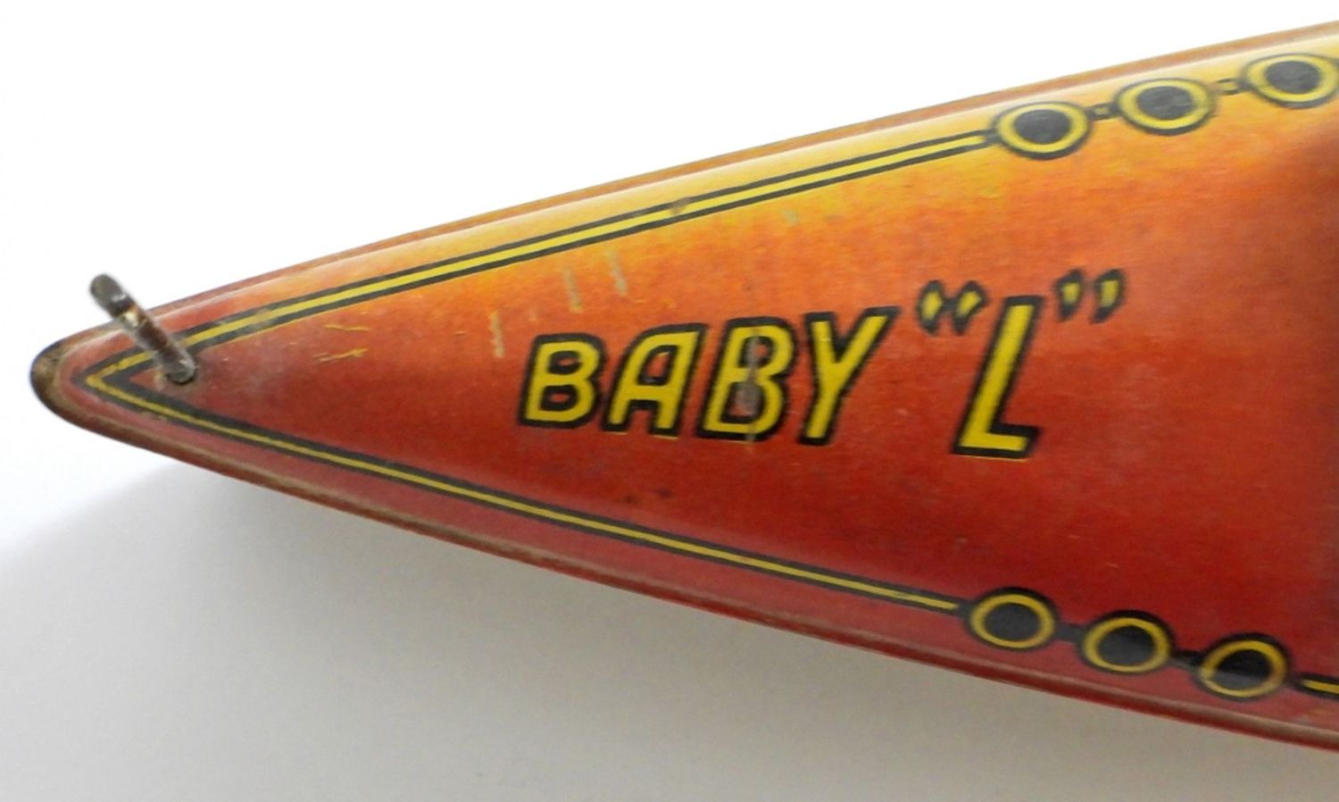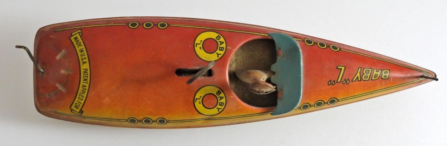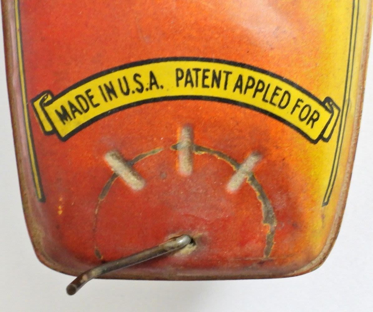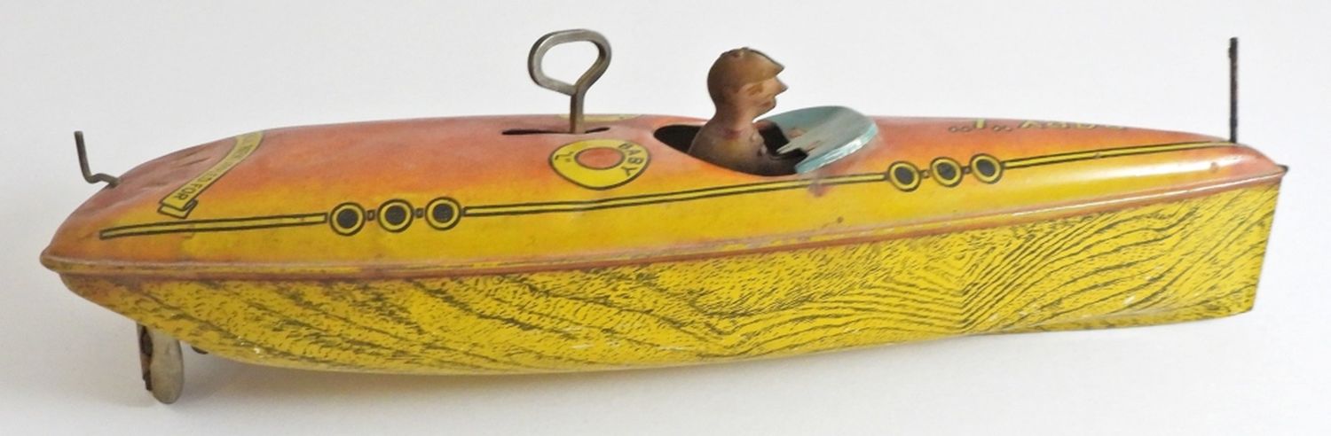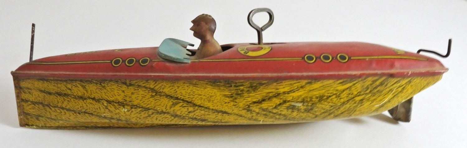 11IN LONG, WINDUP STILL WORKS WAS TESTED, MISSING FRONT FLAG, NORMAL WEAR FOR AGE OF THE TOY
