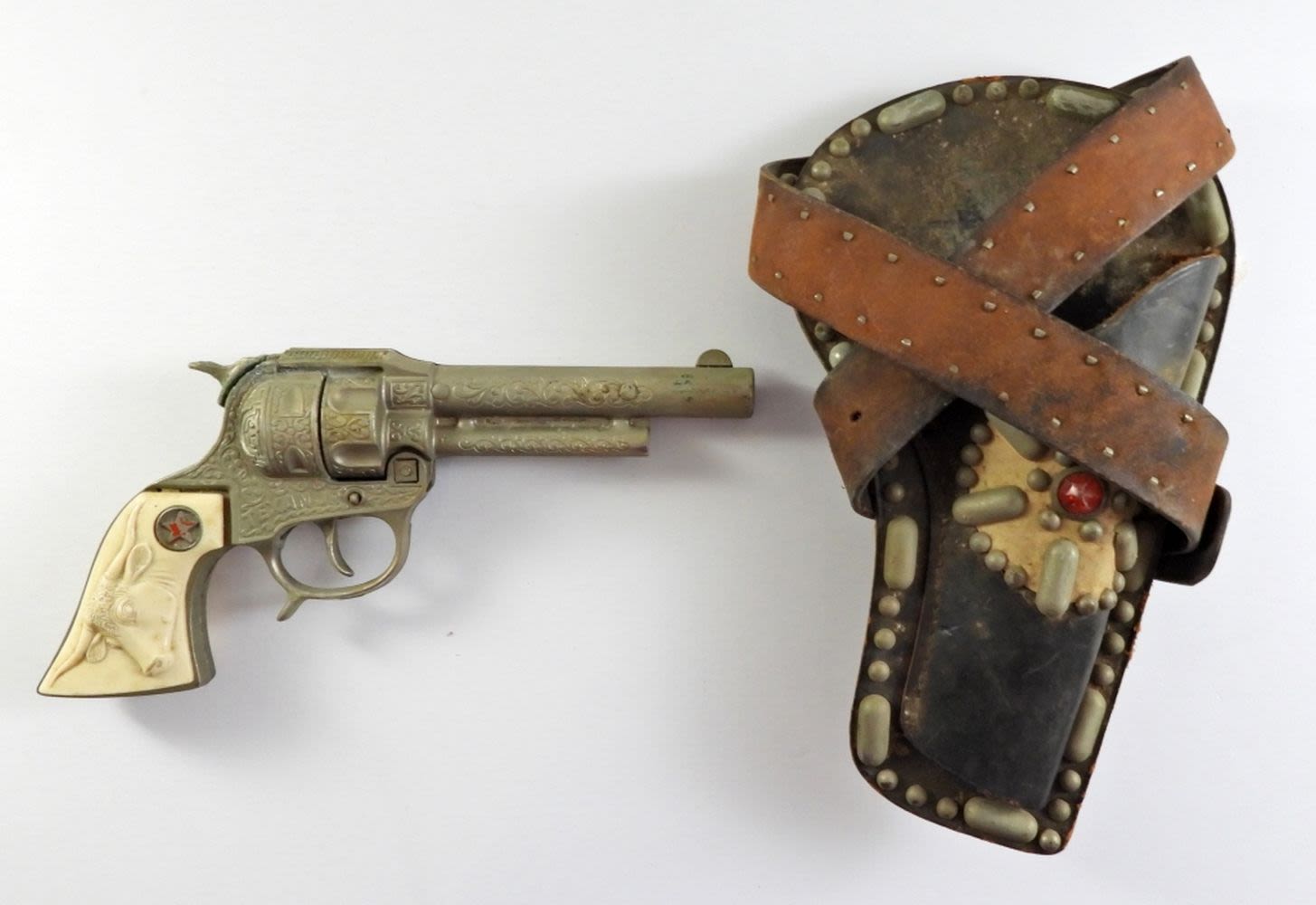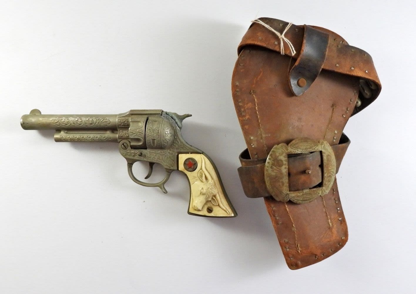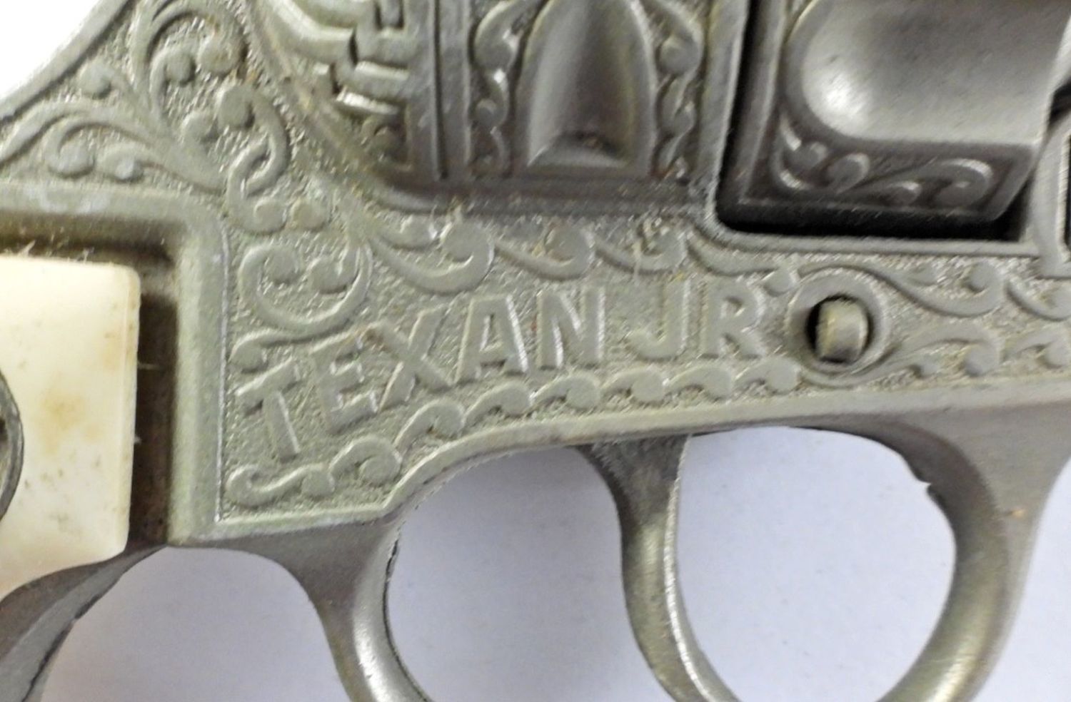 9IN LONG, A BULL AT THE HANDLE, TEXAN JR STAMPED ON BOTH SIDES, BOTTON WORKS TO OPEN THE CAP GUN AND LOCK NICELY, TIGGER IS STUCK (FOR REPAIR)