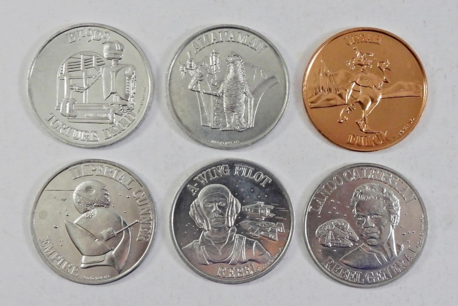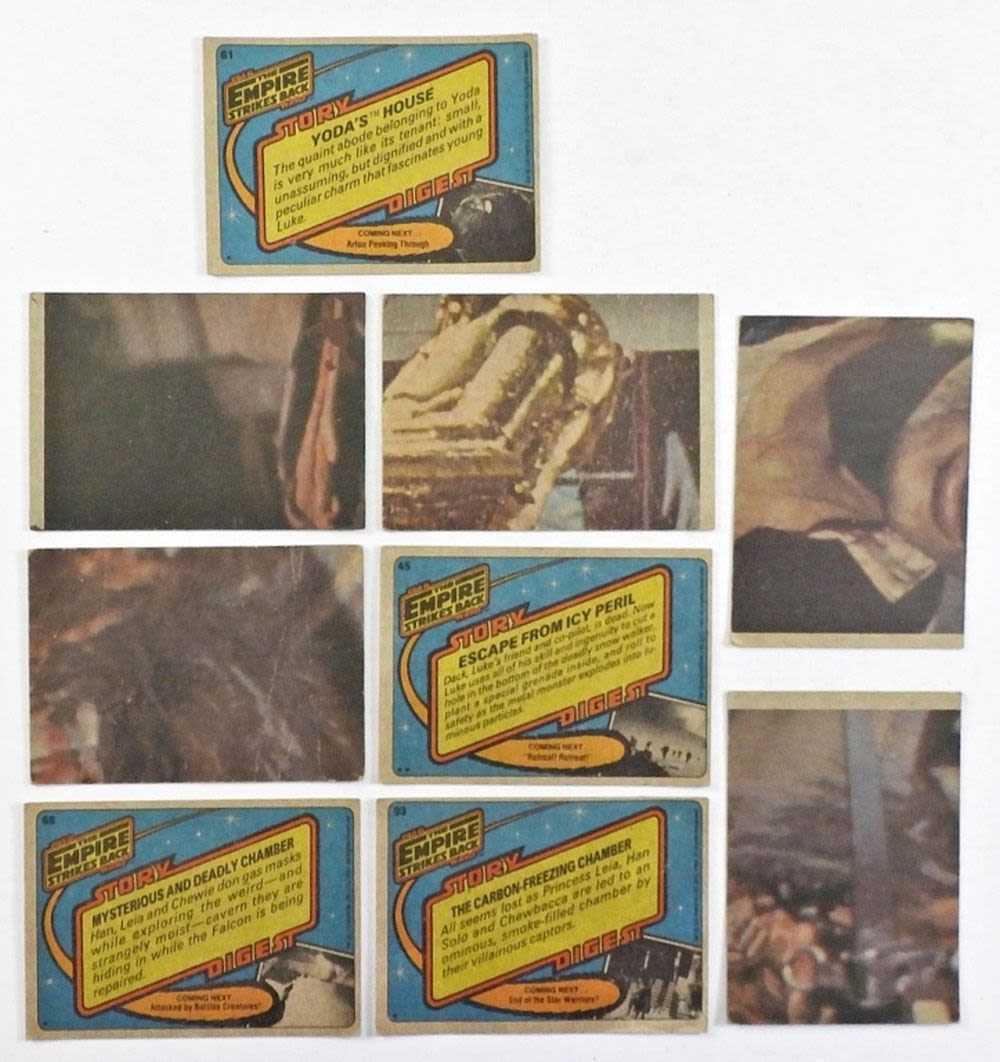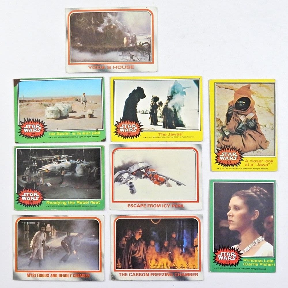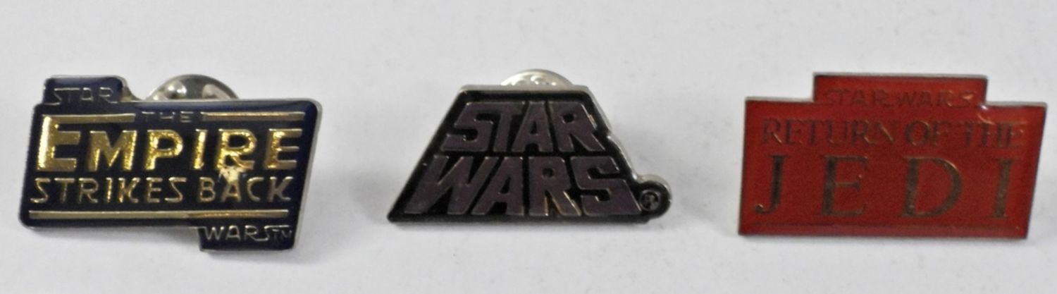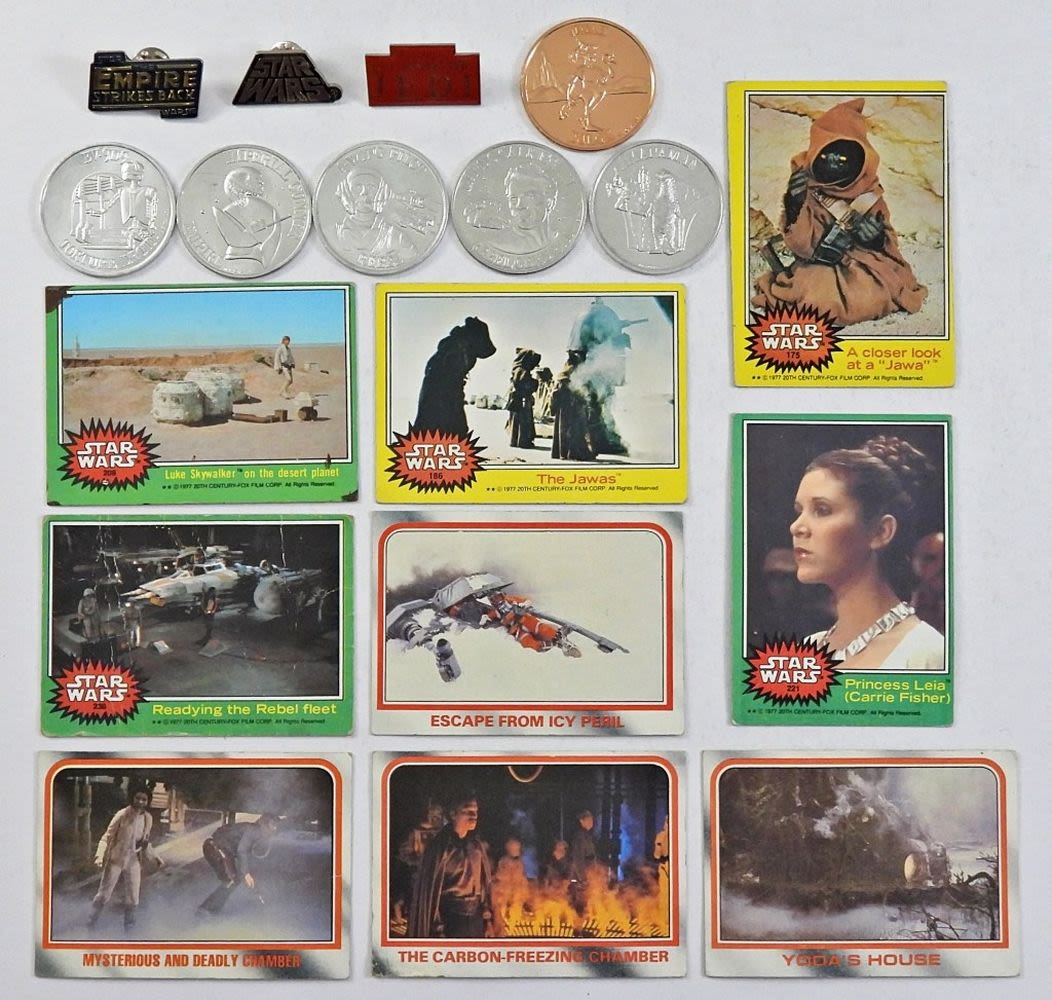 5- 1977 STAR WARS TRADING CARDS, 4- 1980 TRADING CARDS,6- 84-85 STAR WARS TOKENS (IMPERIAL GUNNER EMPIRE , AMANAMAN, URGAH DULOK, EV-9D9 TORTURE DROID, LANDO CALRISSIAN REBEL GENERAL) 3- ENAMEL PINS