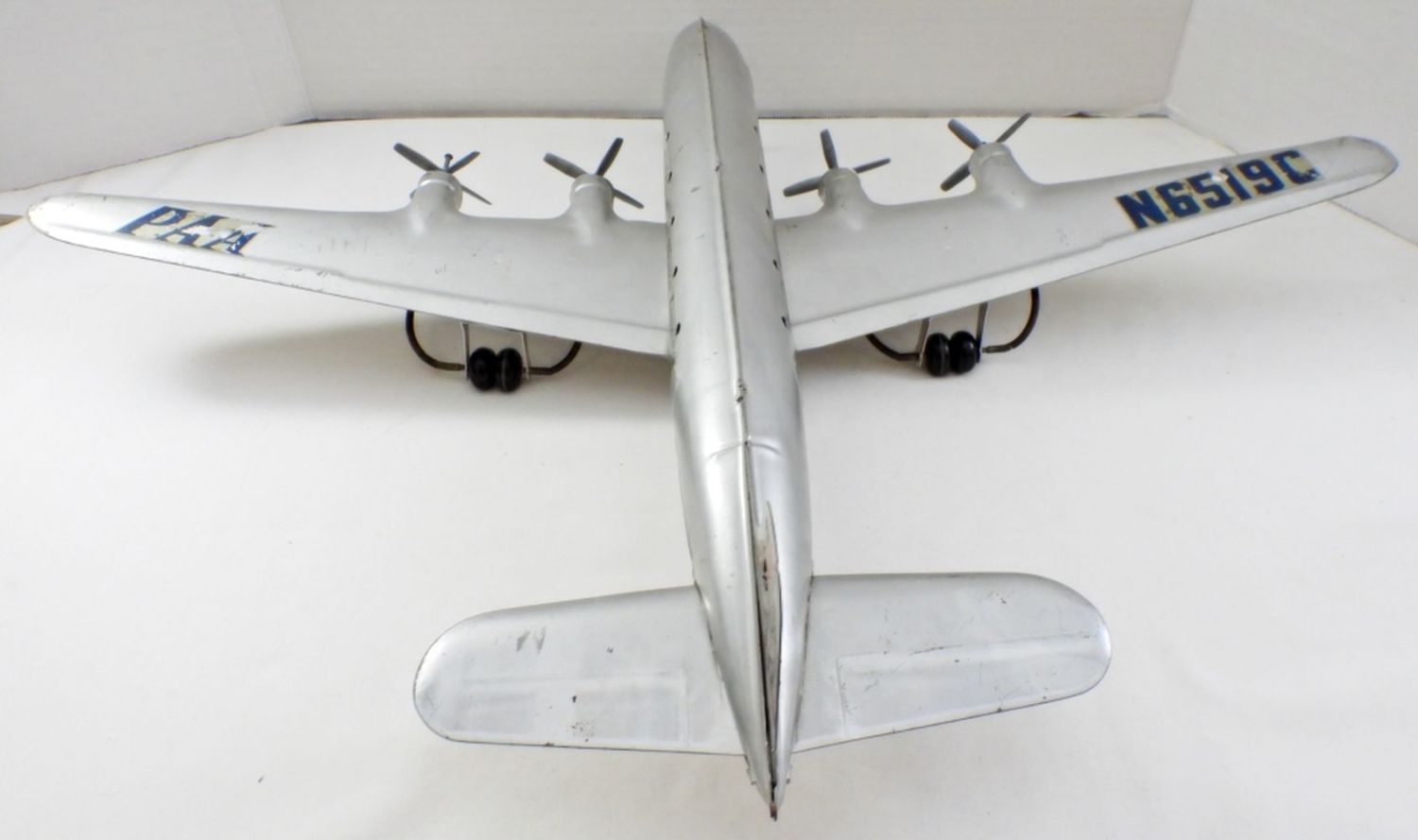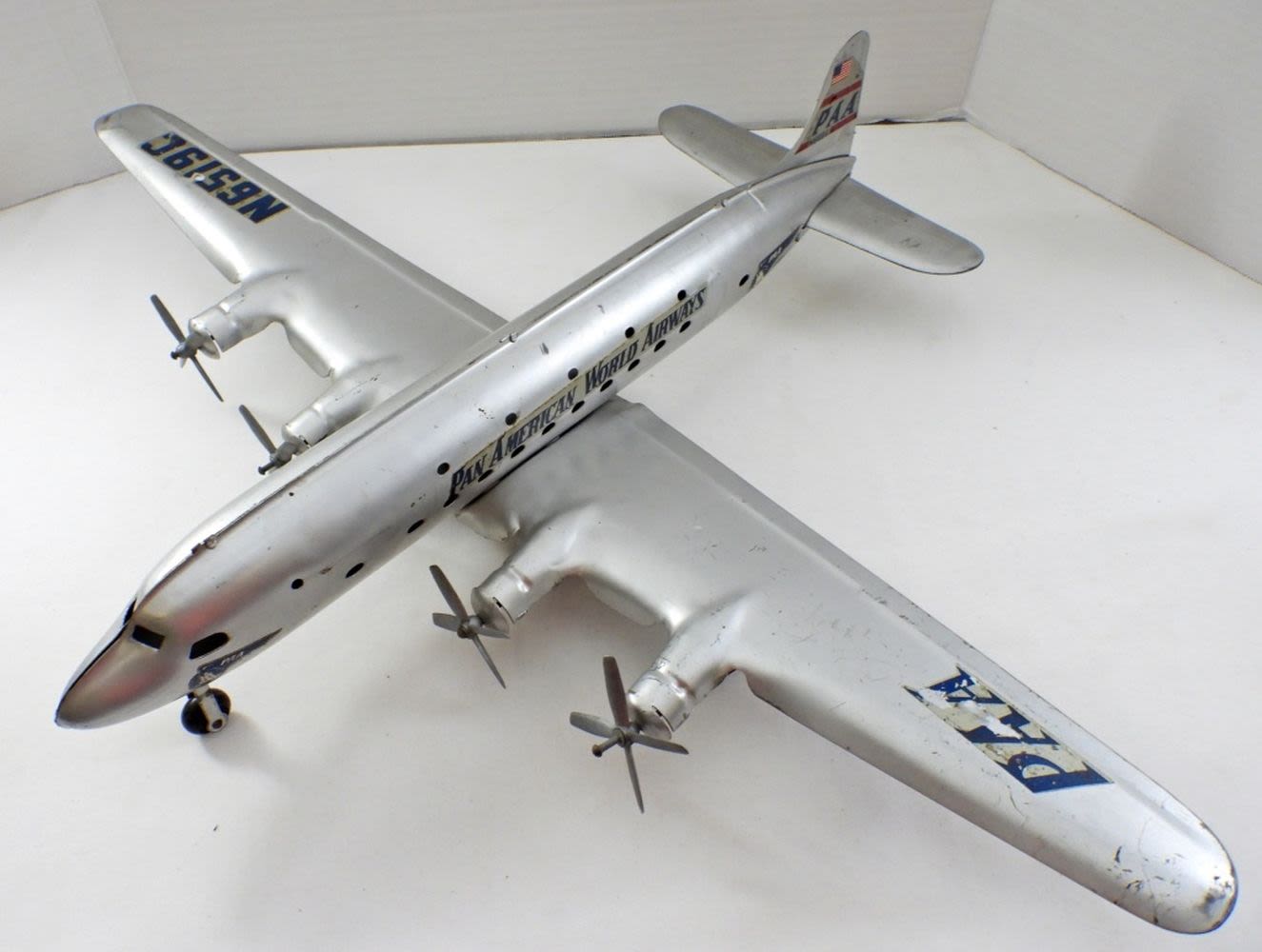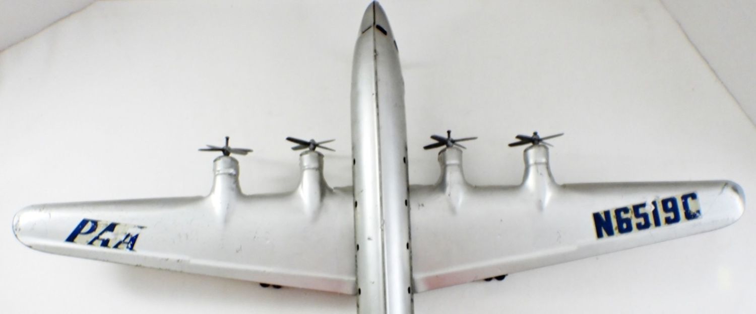 22IN LONG, 27IN WINGSPAN, ORINGAL DECALS HAVE FADING, SOME SCRATCHES MADE OUT OF PRESSED STEEL, AND IS MODELED AFTER PAM AIRLINES, PROPELLERS ARE INTACTED AND STILL WORK WHEN WHEELS ARE IN MOTION.