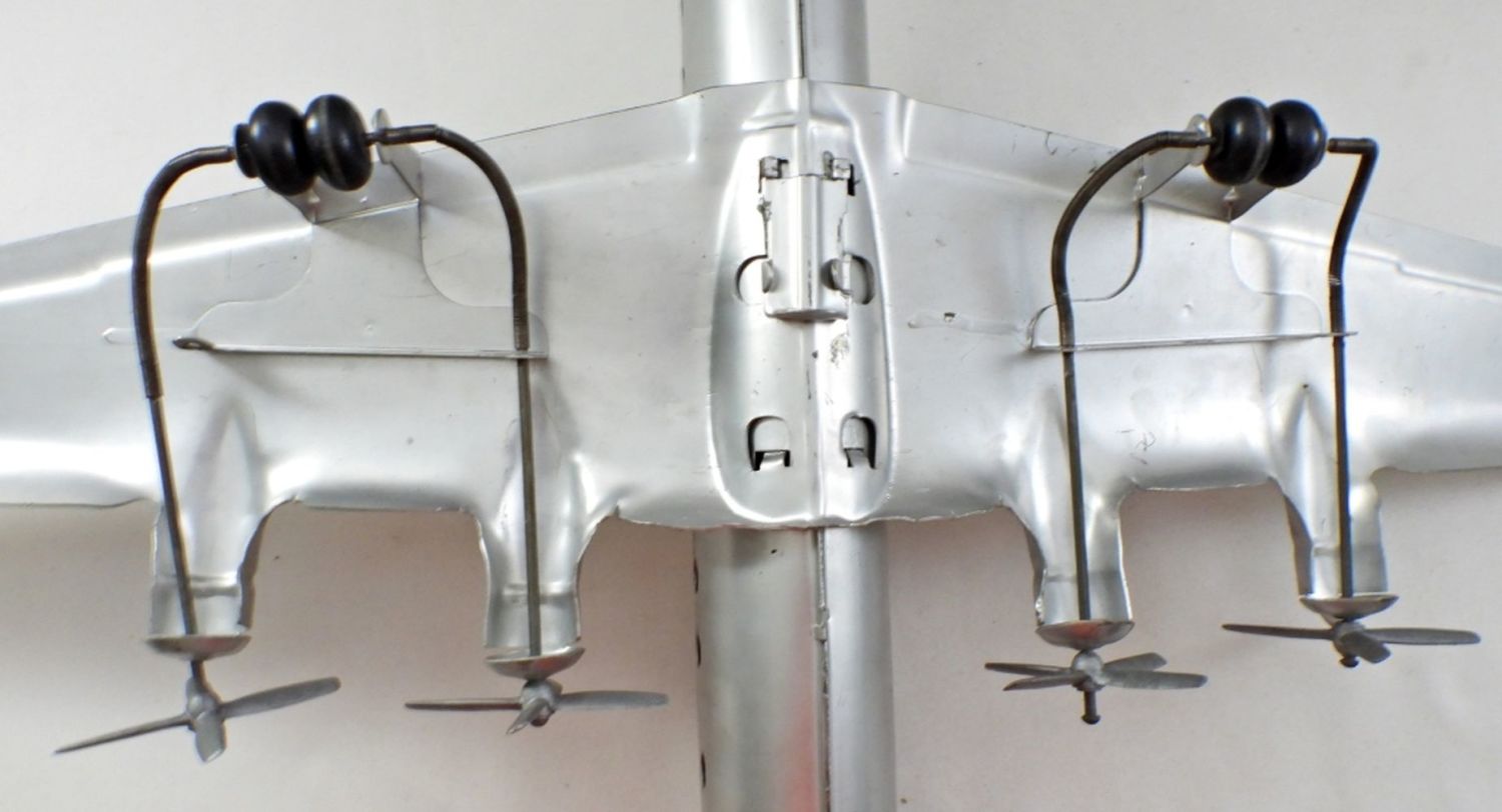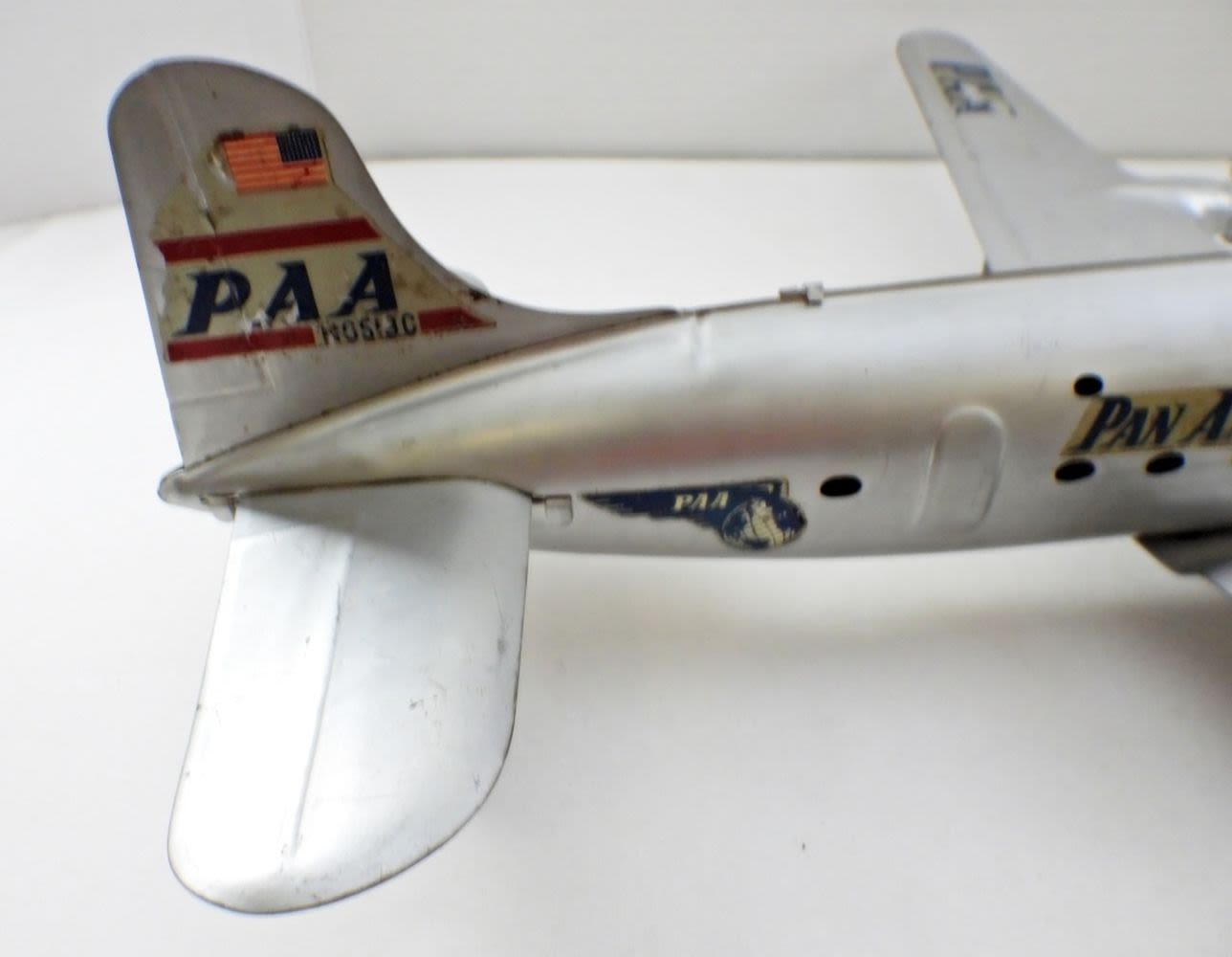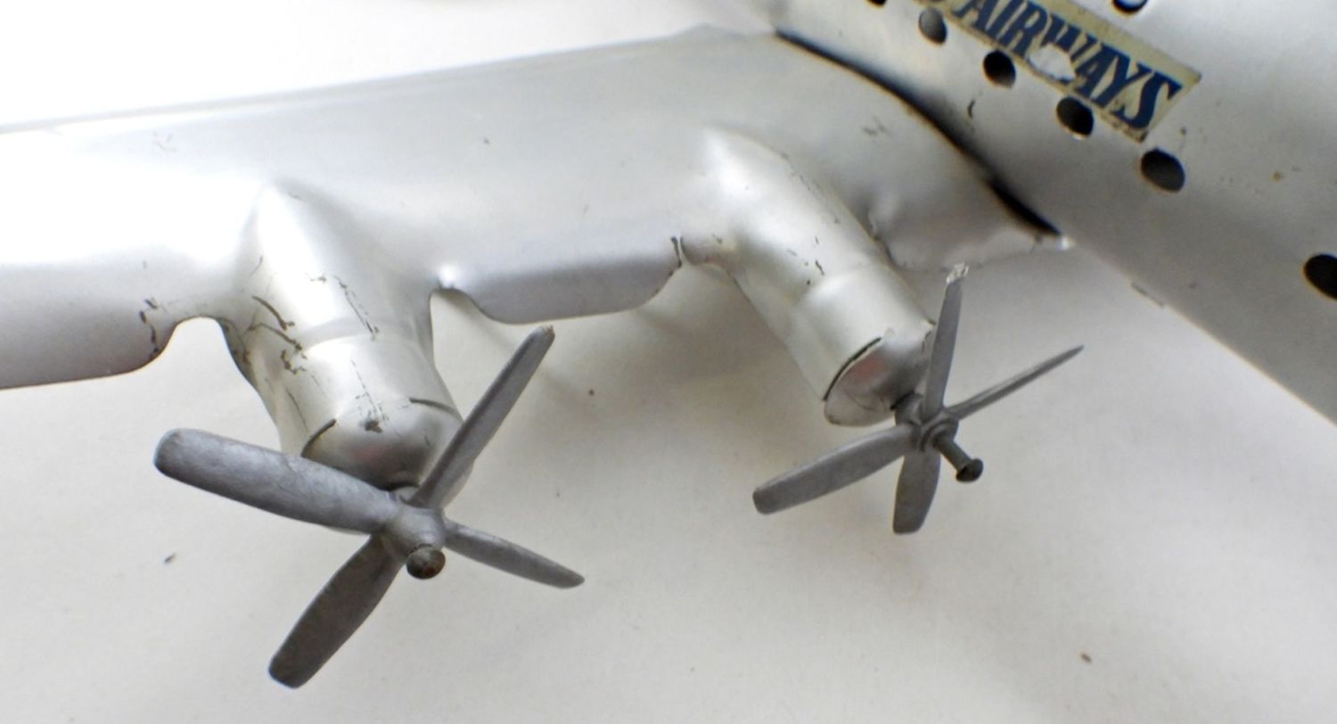 22IN LONG, 27IN WINGSPAN, ORINGAL DECALS HAVE FADING, SOME SCRATCHES MADE OUT OF PRESSED STEEL, AND IS MODELED AFTER PAM AIRLINES, PROPELLERS ARE INTACTED AND STILL WORK WHEN WHEELS ARE IN MOTION.