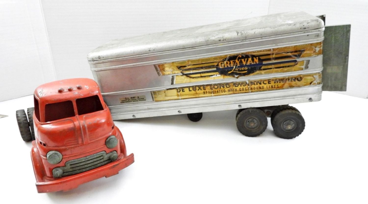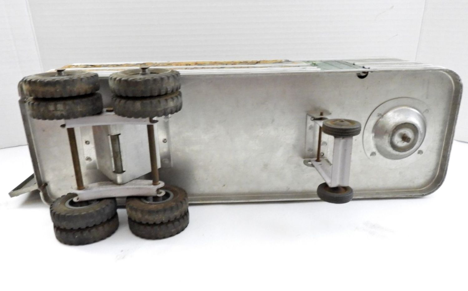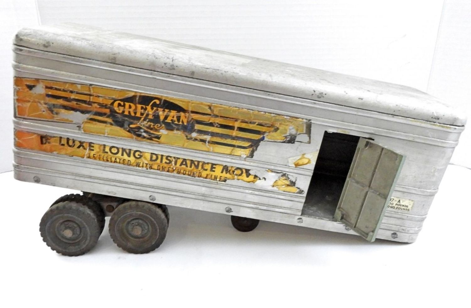 23IN LONG, STICKERS ARE COMING OFF, BACK DOORS AND SIDE DOORS ON THE TRAILER OPEN, RUBBER TIRES