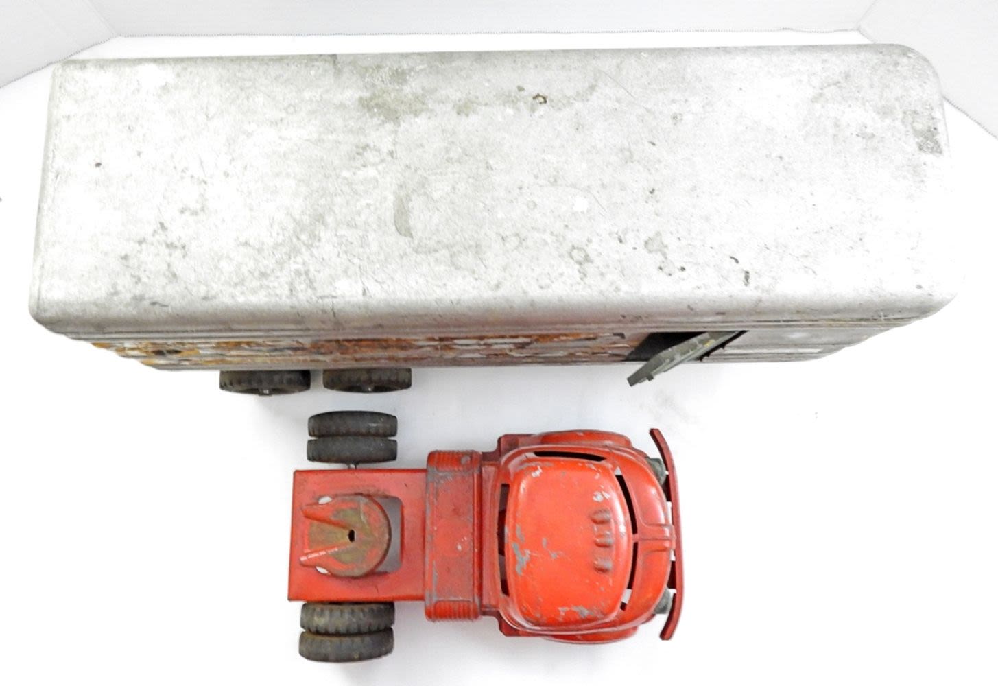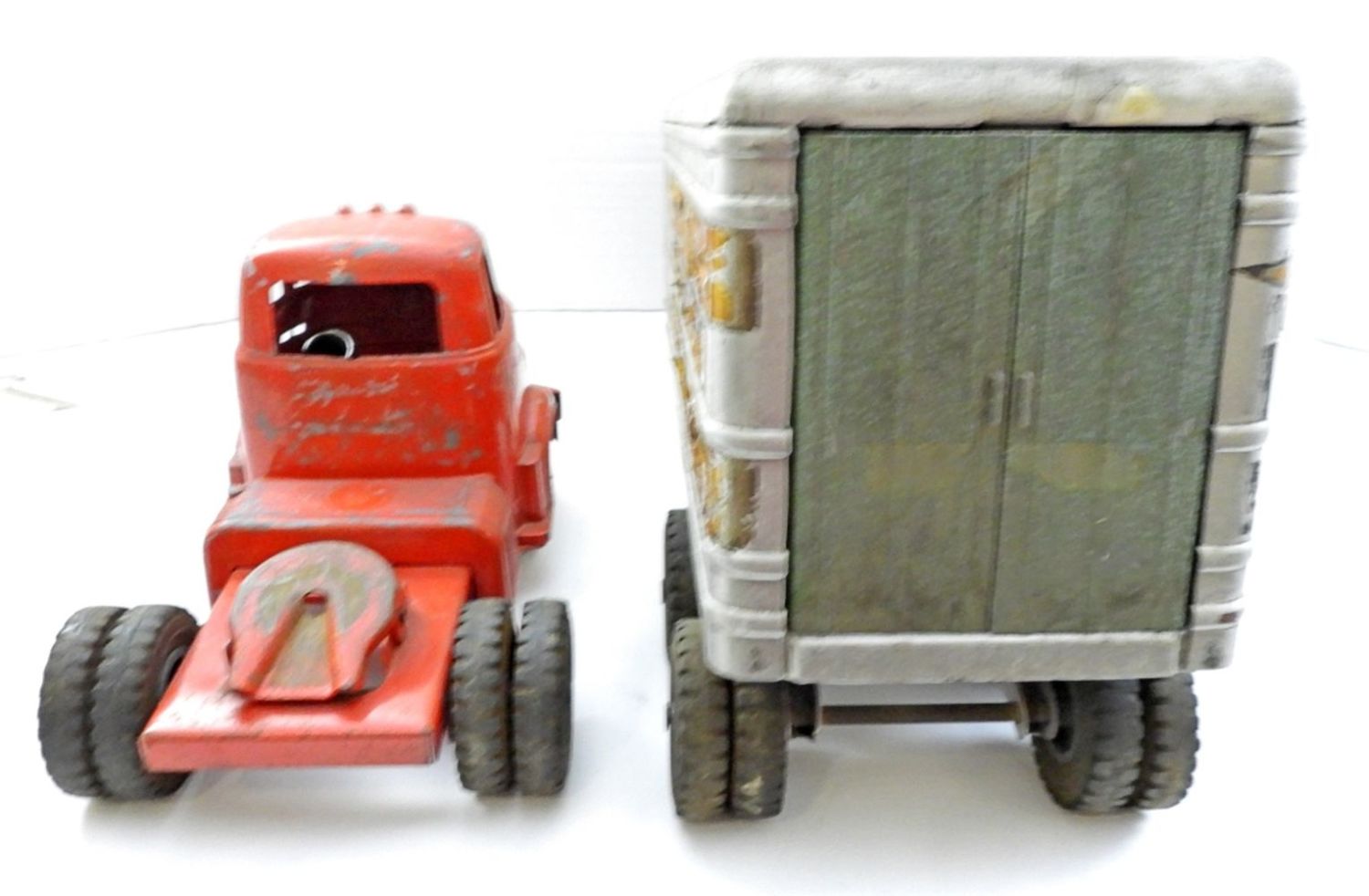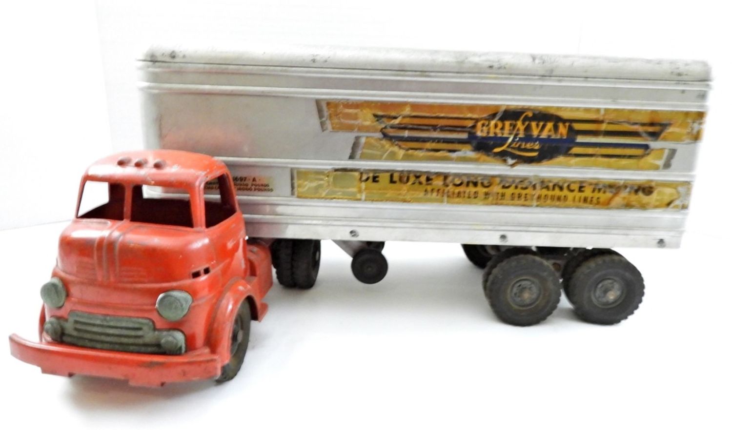 23IN LONG, STICKERS ARE COMING OFF, BACK DOORS AND SIDE DOORS ON THE TRAILER OPEN, RUBBER TIRES