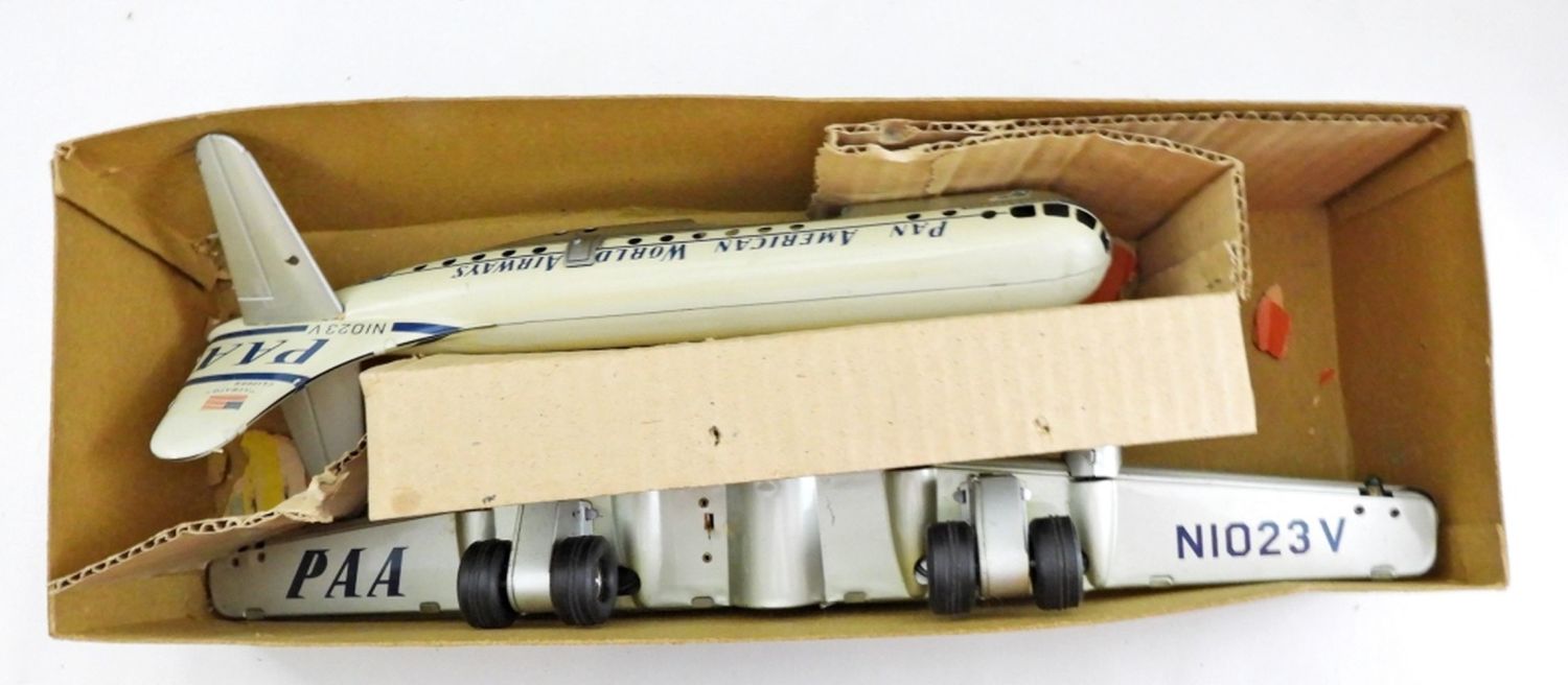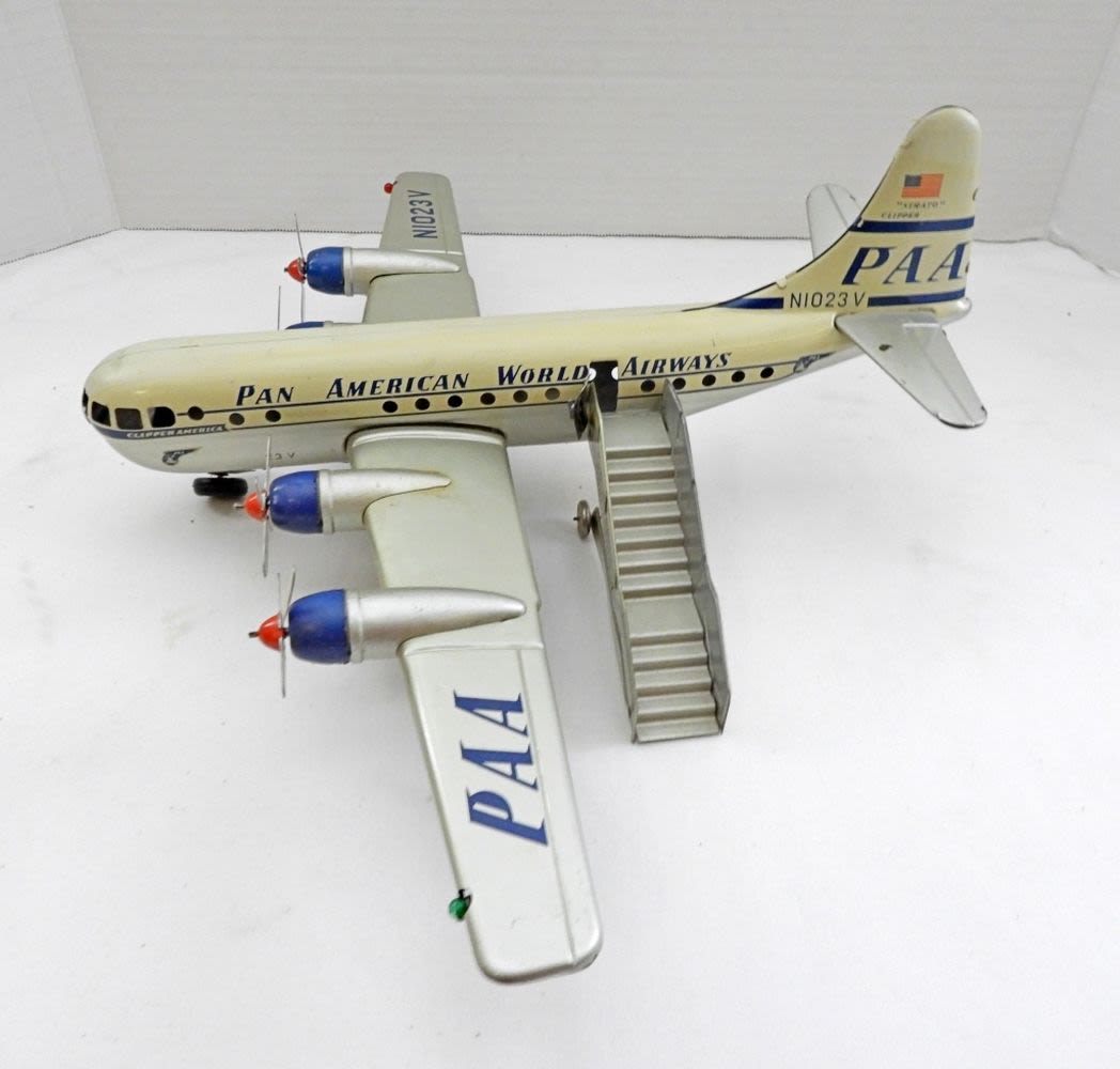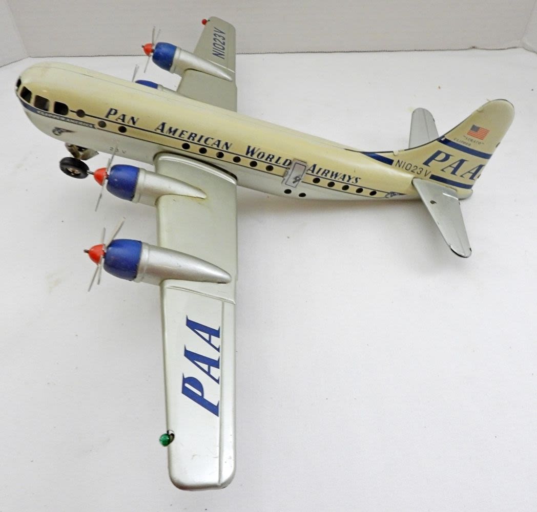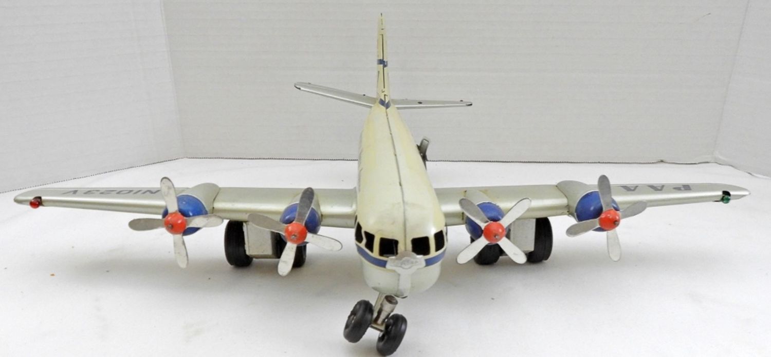 IN BOX( BOX IS DAMAGE FROM THE NORMAL WEAR OF THE AGE), MADE IN THE 1950S, PROPELLERS MOVE WHEN THE TOY IS IN MOTION (FRICTION TOY)
