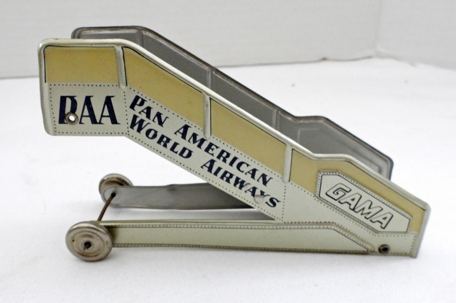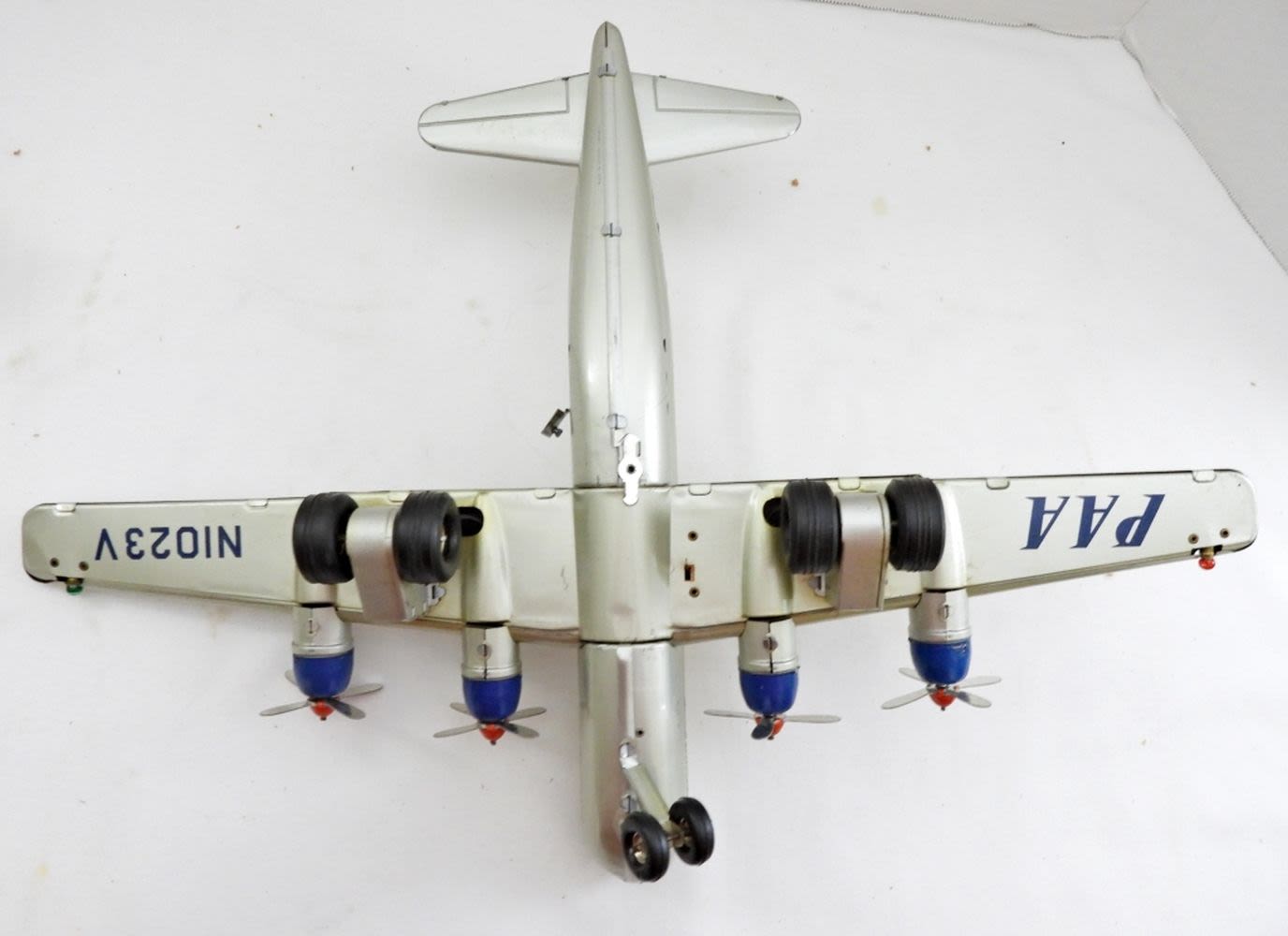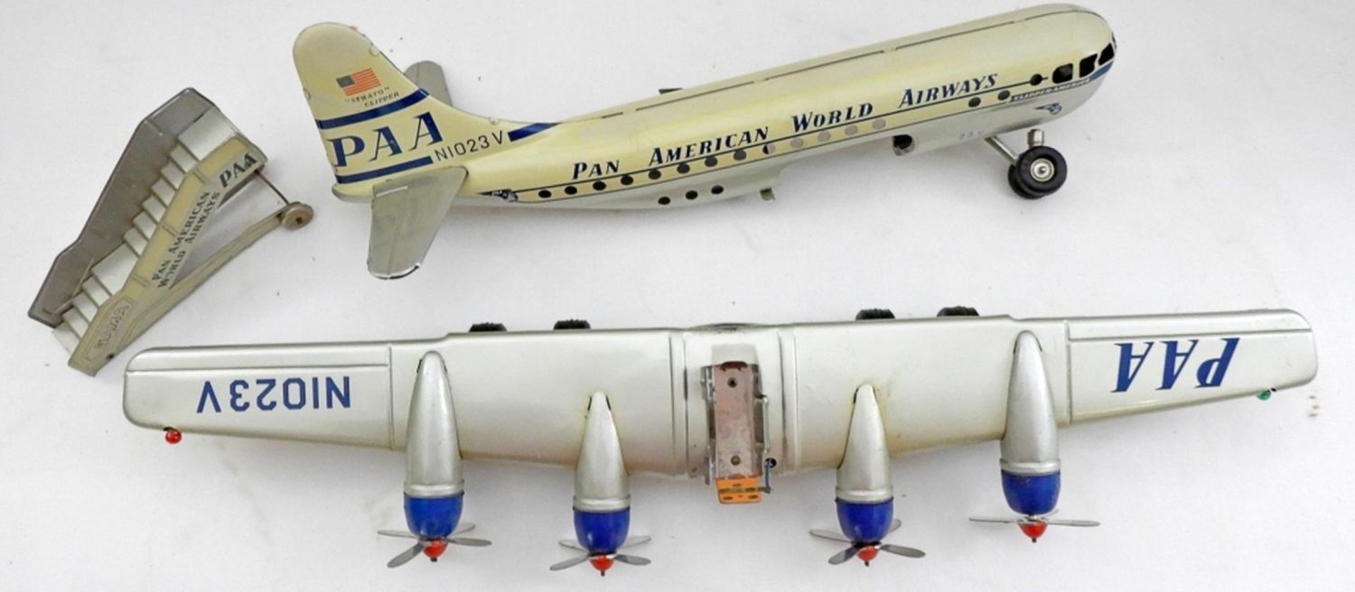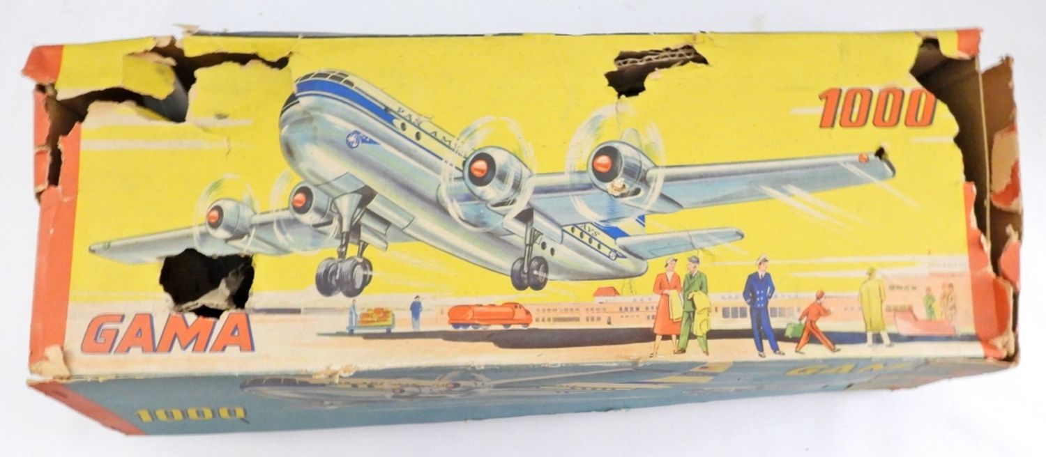 IN BOX( BOX IS DAMAGE FROM THE NORMAL WEAR OF THE AGE), MADE IN THE 1950S, PROPELLERS MOVE WHEN THE TOY IS IN MOTION (FRICTION TOY)
