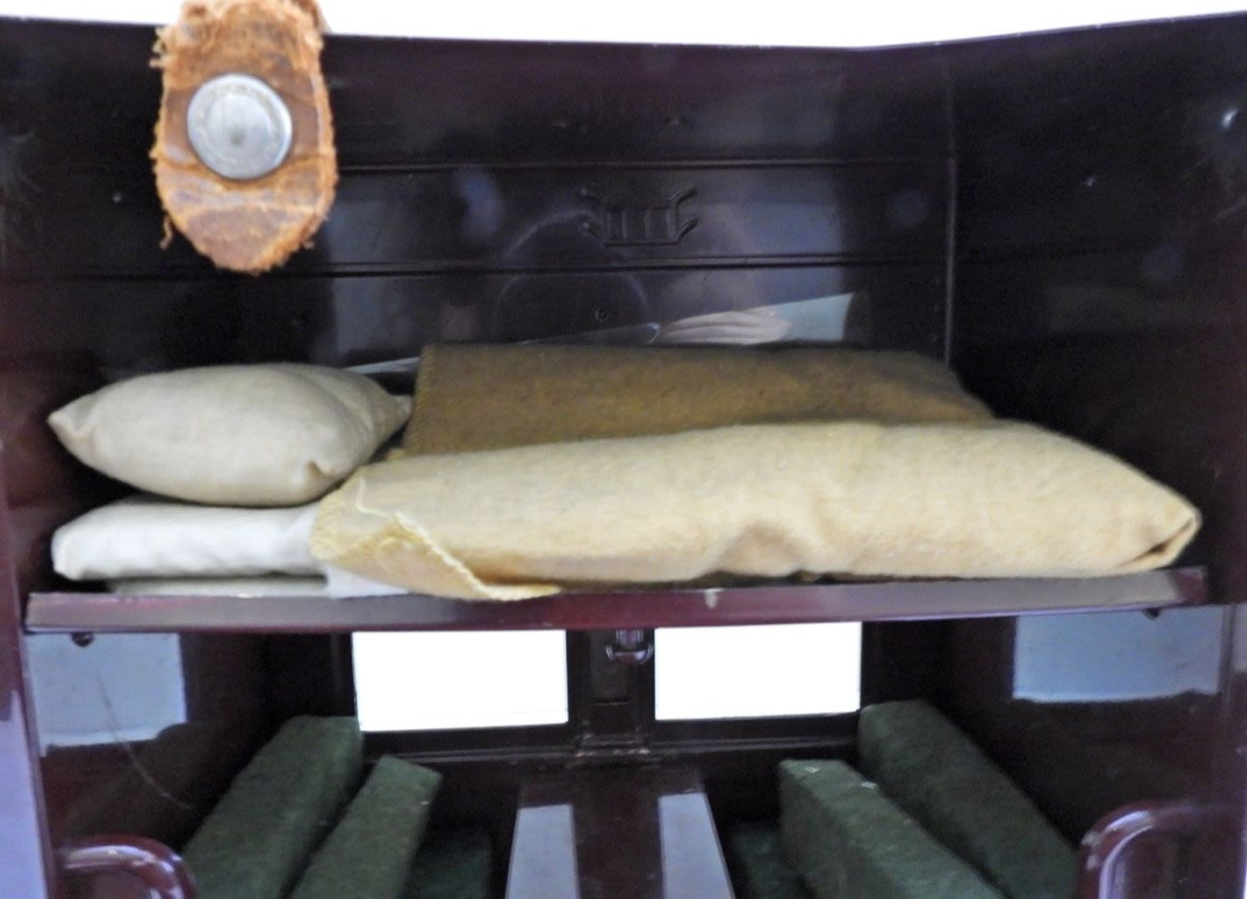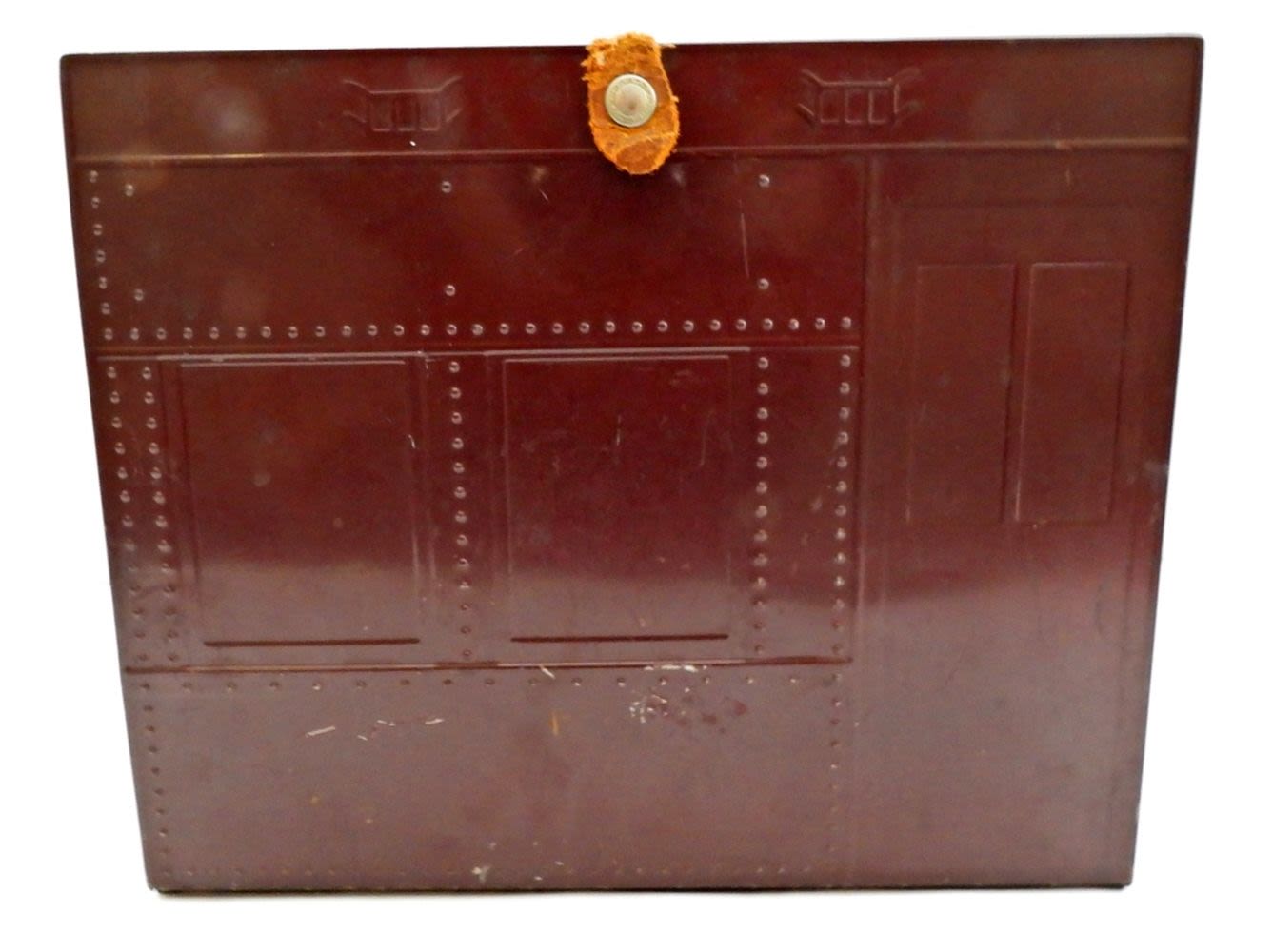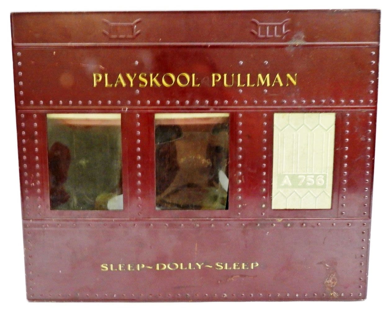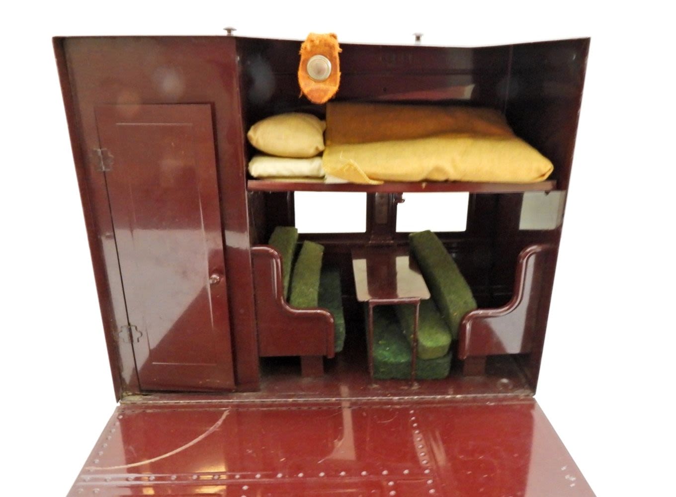 A756, DOLL HOUSE CASE, 9″ TALL 11″ WIDE, HANDLE IS MISSING, COMES WITH BEDDING, AND SEATING
