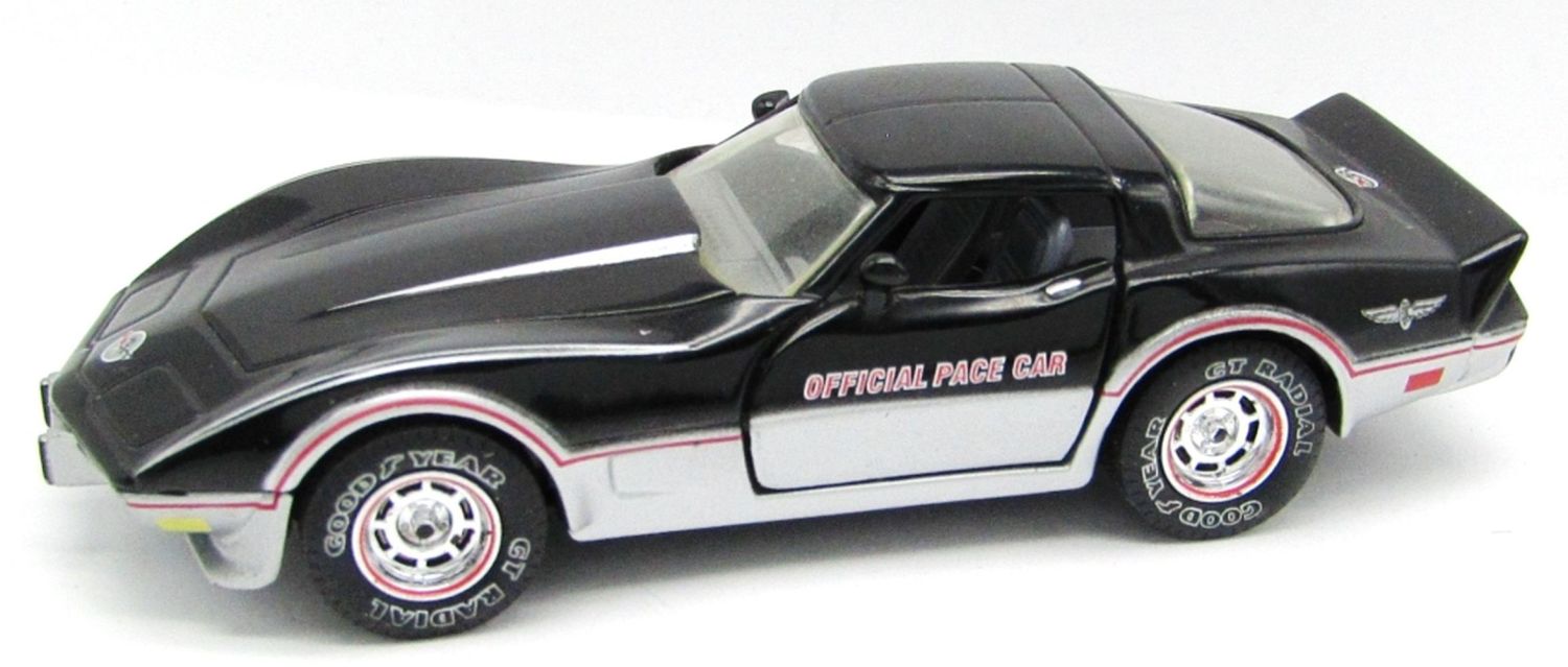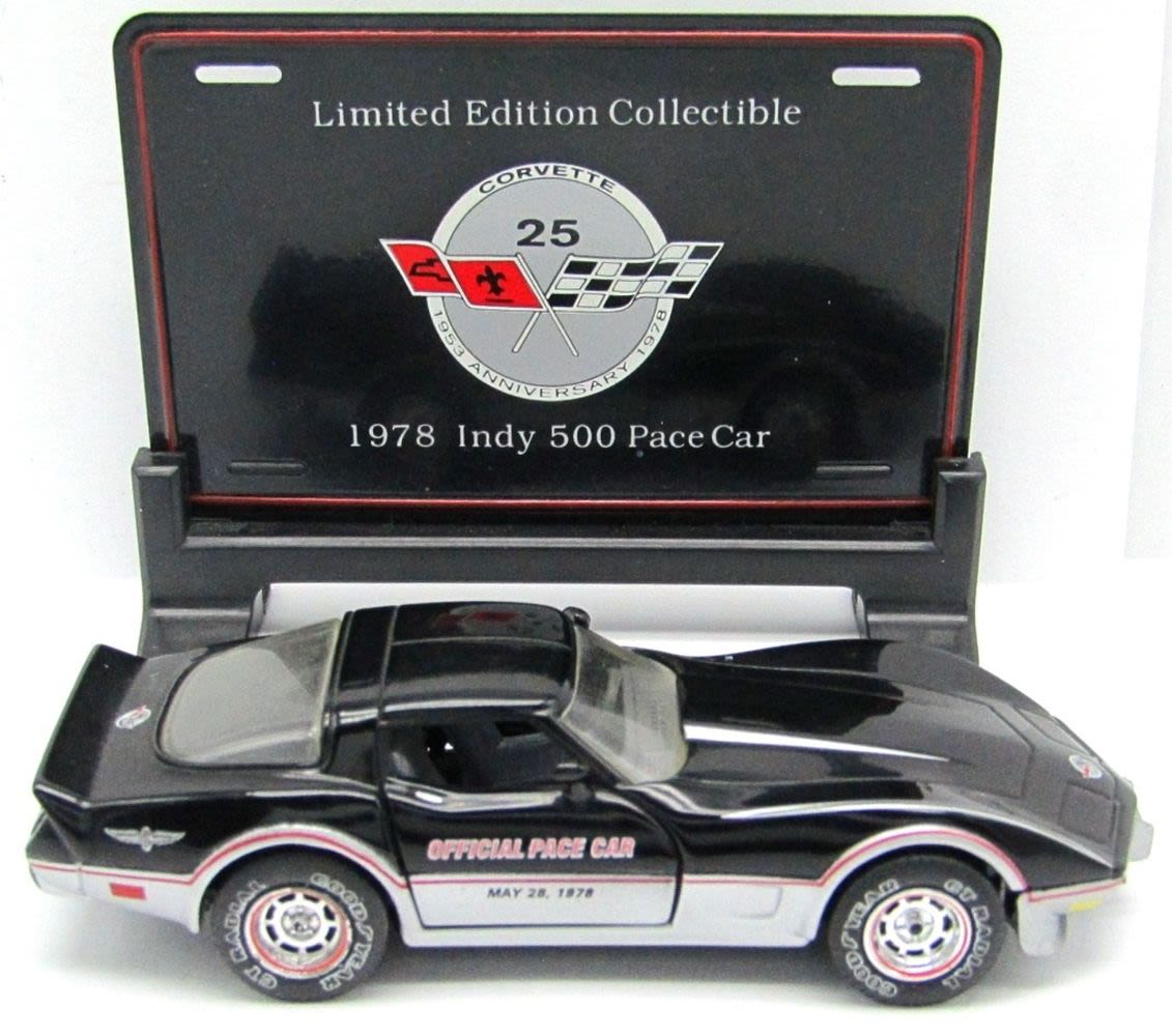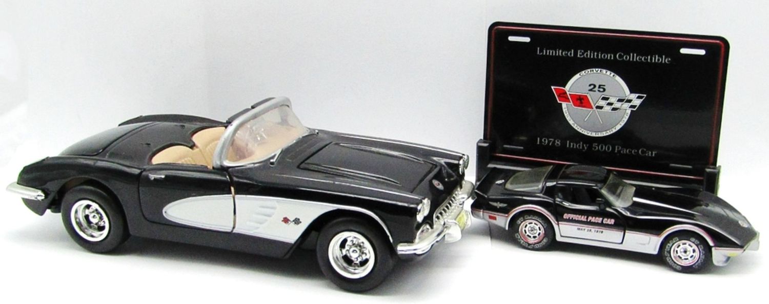 1959 Chevrolet Corvette Open Top Black 1:24 Scale Model Motor Max, 1978 Chevrolet Corvette 1:43 Scale Model Indianapolis 500 Pace Car Chevrolet Corvette with Limited Edition Collectible 1978 Indy 500 Pace Car 25th Anniversary Plague Sign; Fair Conditions.