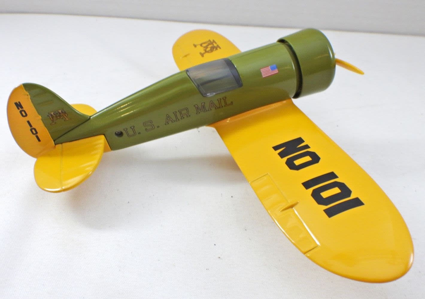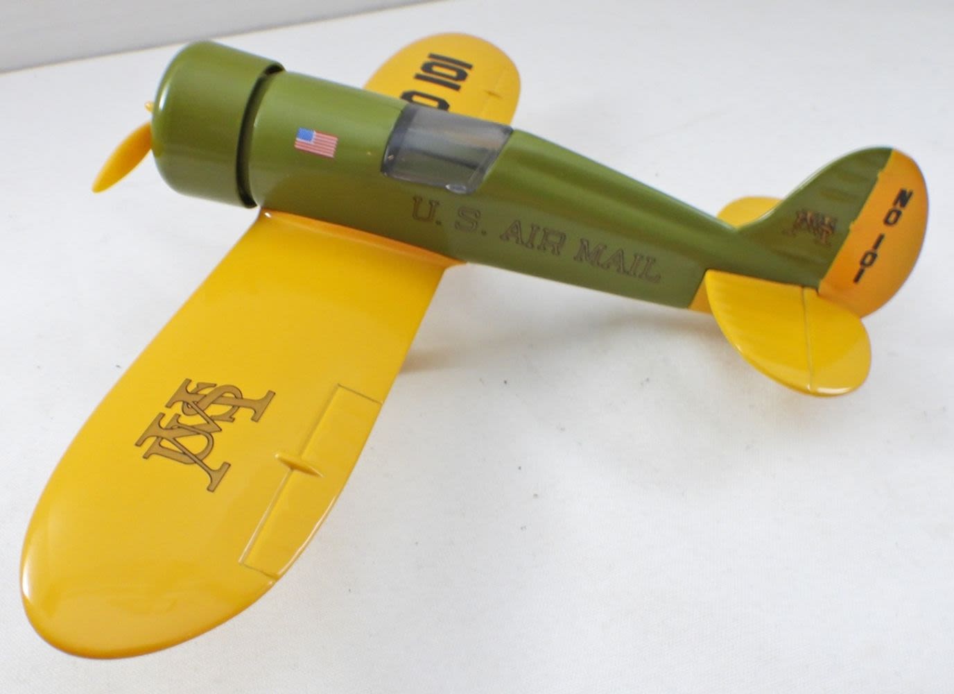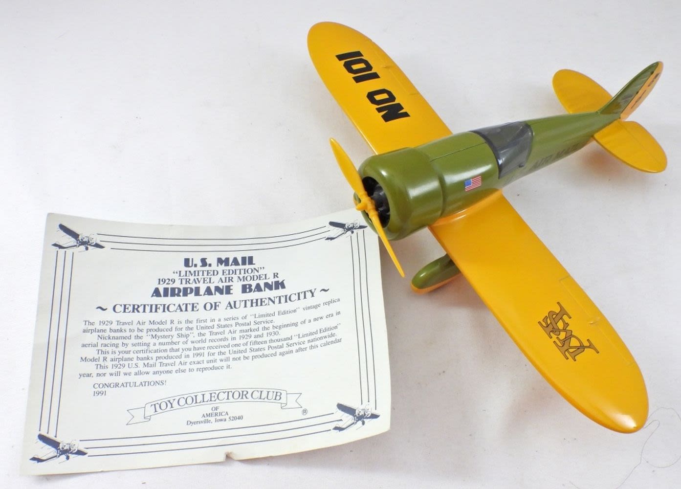1991, GREAT CONDITION, U.S. MAIL “LIMITED EDITION” 1929 TRAVEL AIRE MODEL R AIRPLANE BANK, COA COMES WITH FROM TOY COLLECTOR CLUB, COINS GO IN SEATING AREA, PROPELLER OPENS TO LET COINS OUT