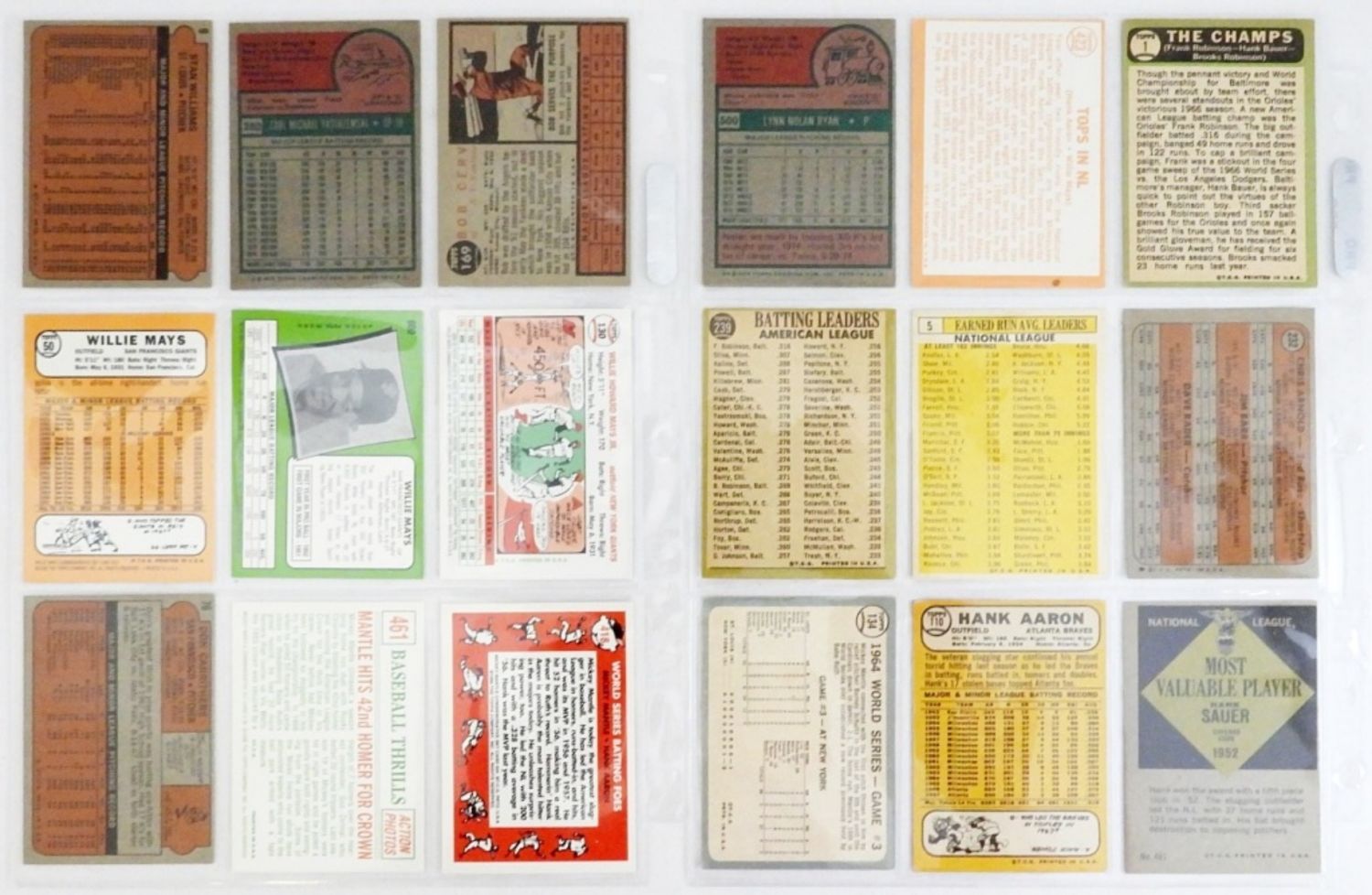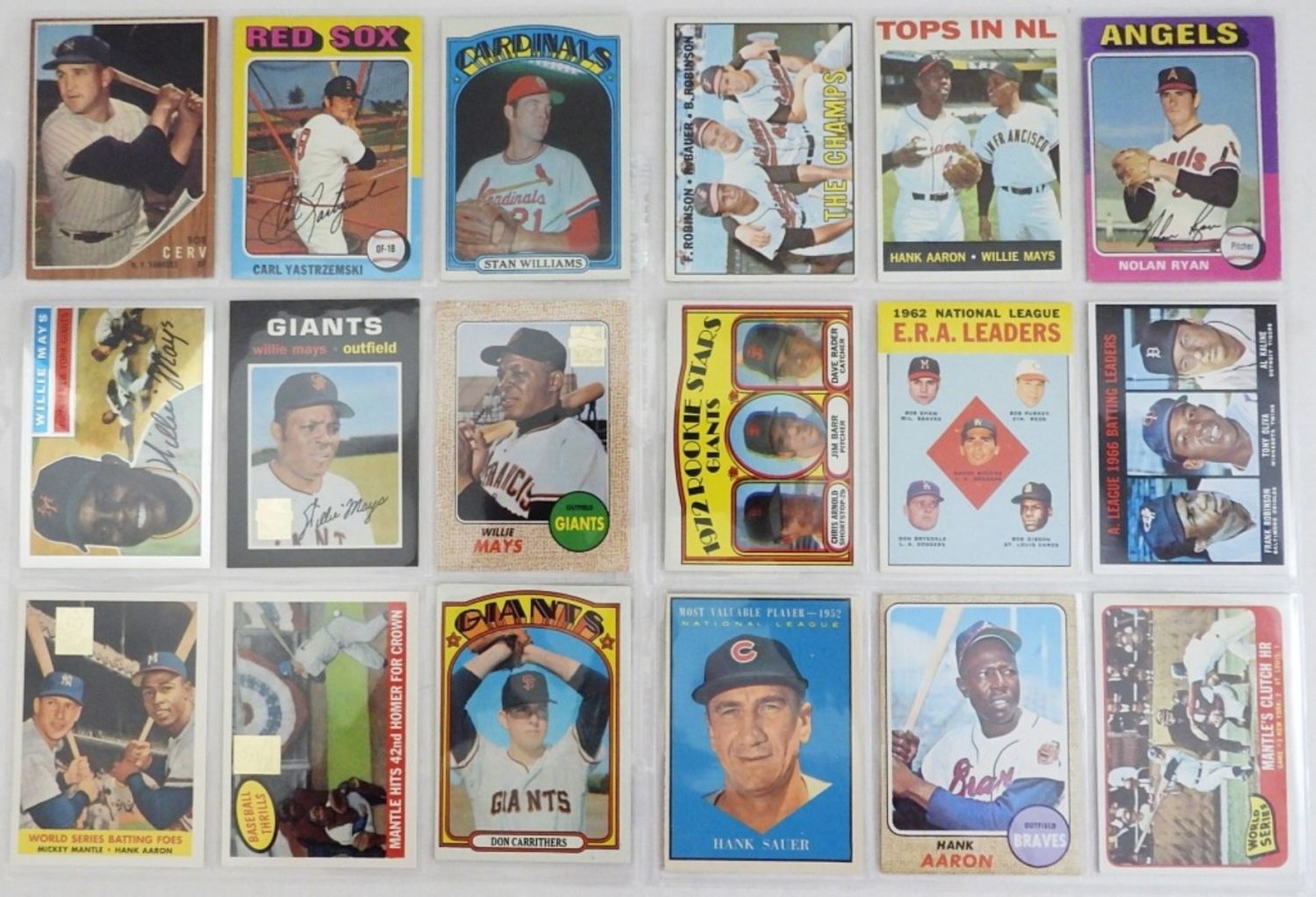 1965 T #134 MANTLE WS, 1968 T #110 AARON, 1967 T #1 THE CHAMPS, 1964 T #423 AARON/MAYS, 1967 T #239 BATTING LEADERS, 1963 T #5 ERA Ldrs, 1975 T RYAN, (4) 1996 COMMEMORATIVE MANTLE, MAYS & MORE – OVERALL EX or BETTER