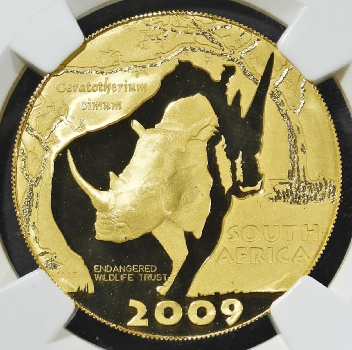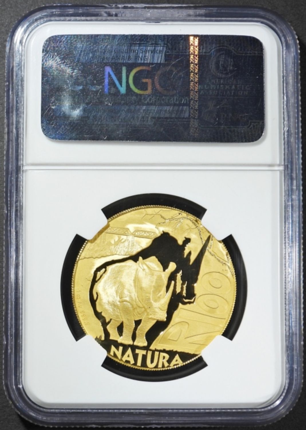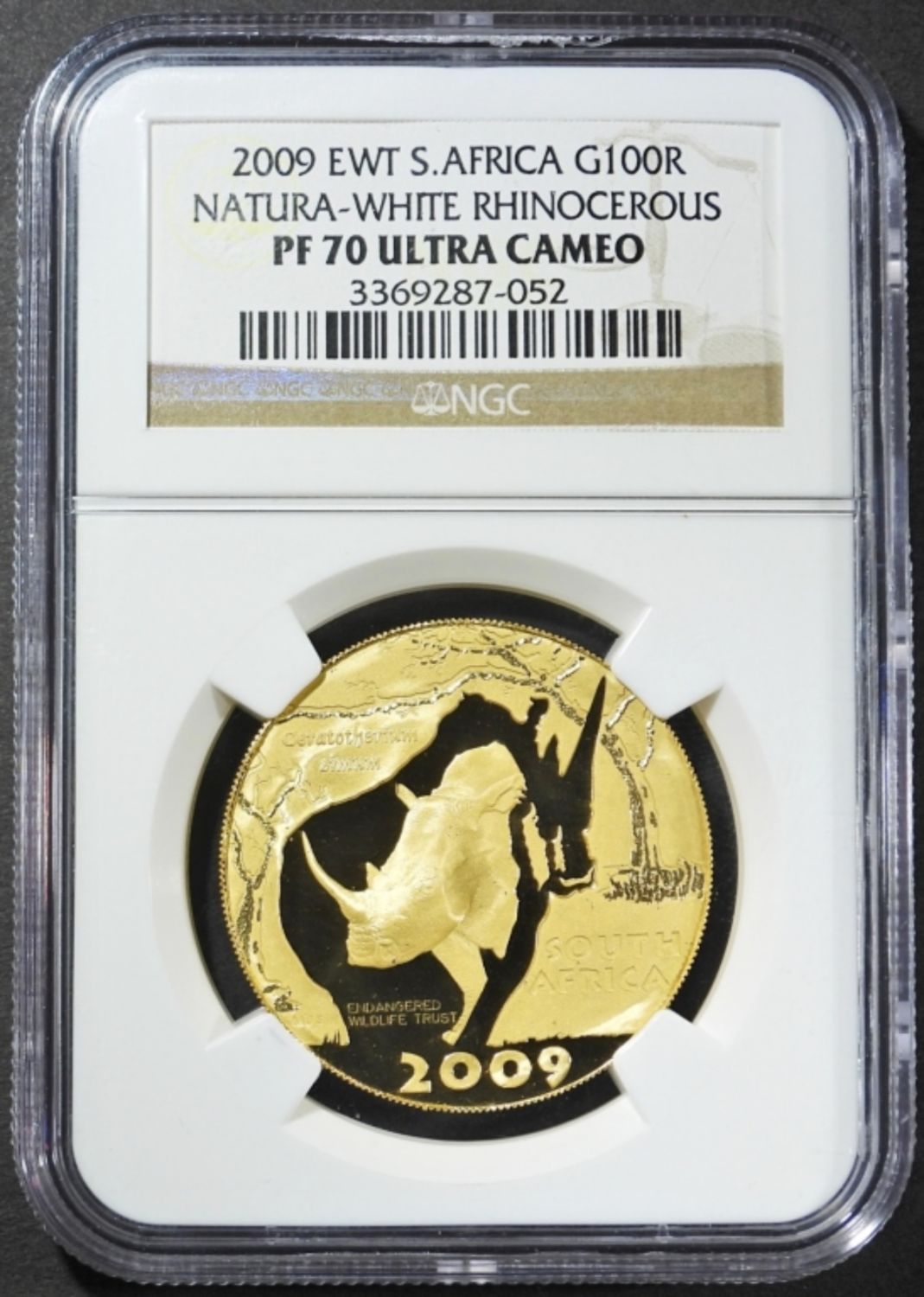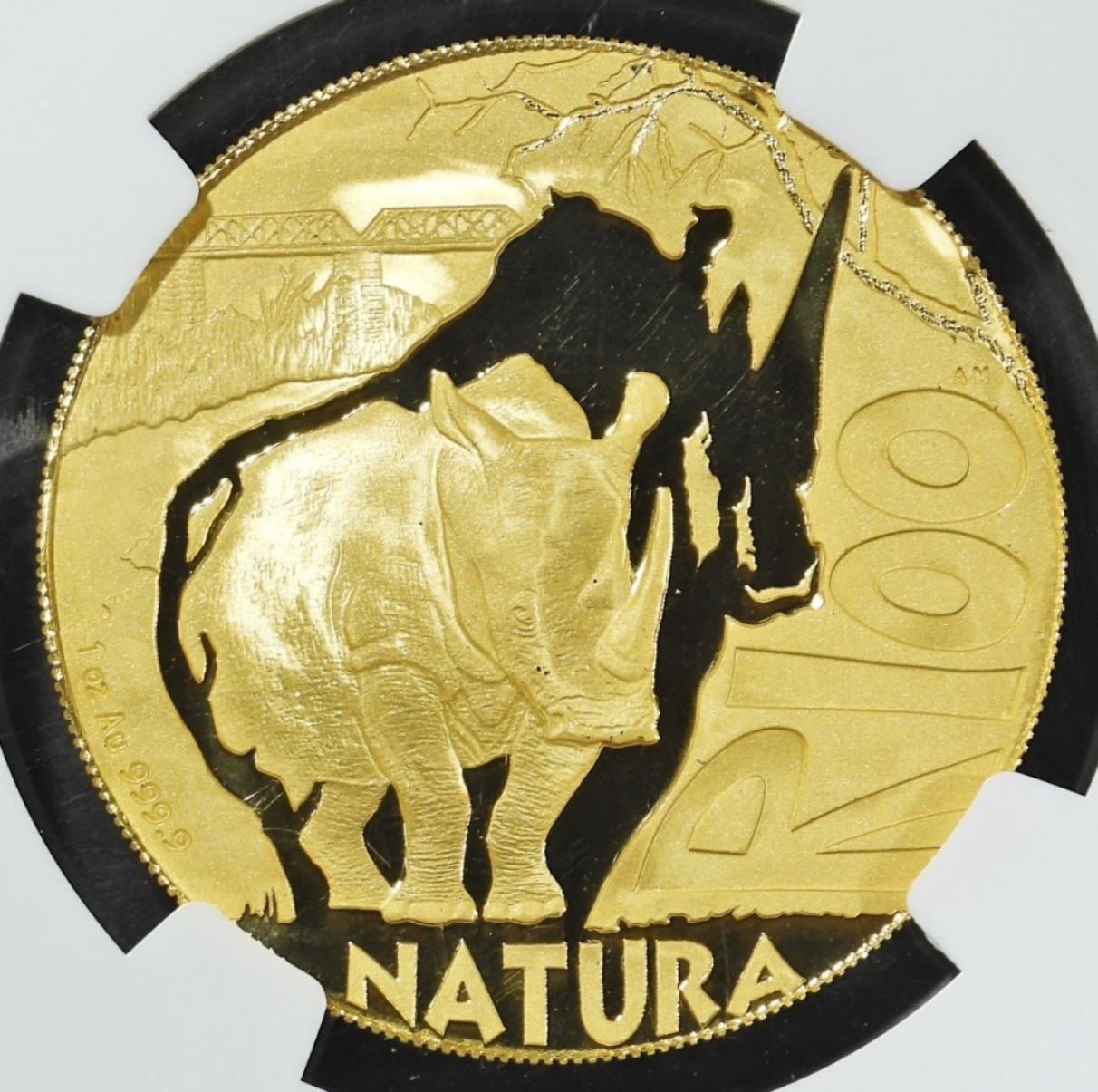 ENDANGERED WILDLIFE TRUST SOUTH AFRICA NATURA WHITE RHINOCEROUS GOLD 100 RAND. 1 OZ 999.9