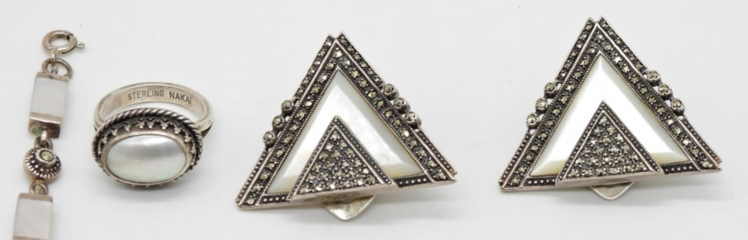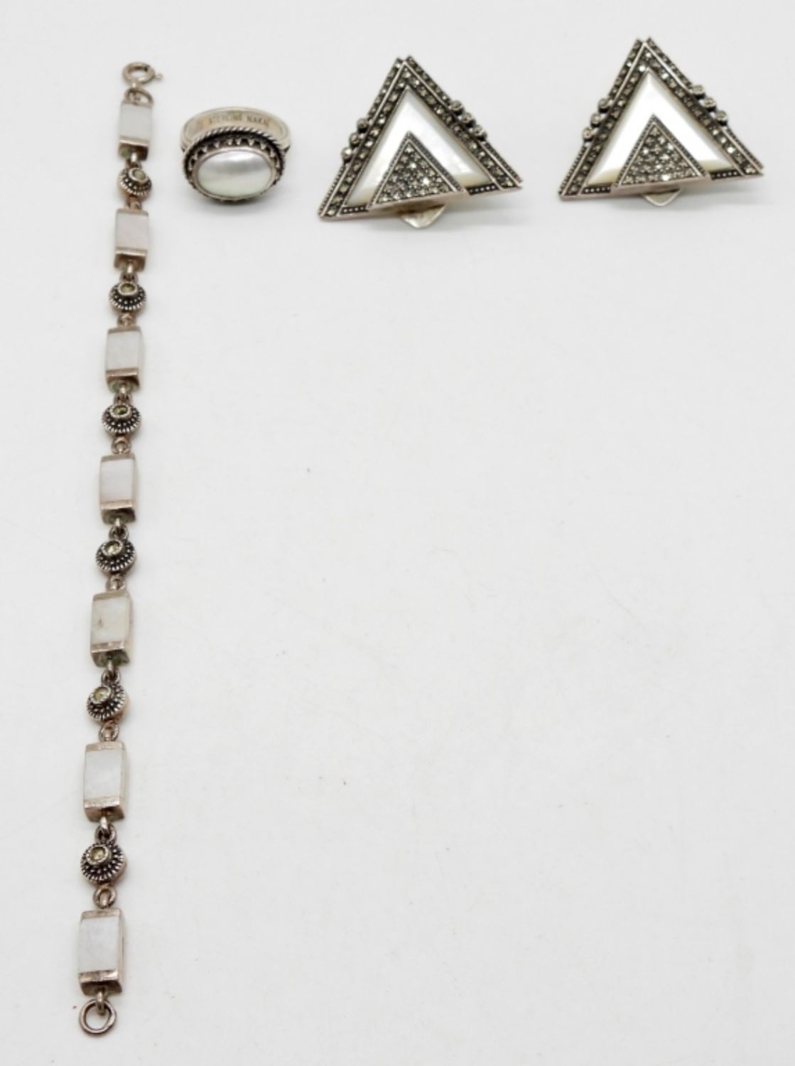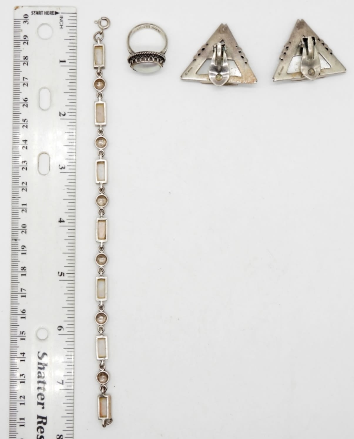 CLIP-ON EARRINGS, 7 1/2″ BRACELET & RING SIZE 6 (26 dwt)