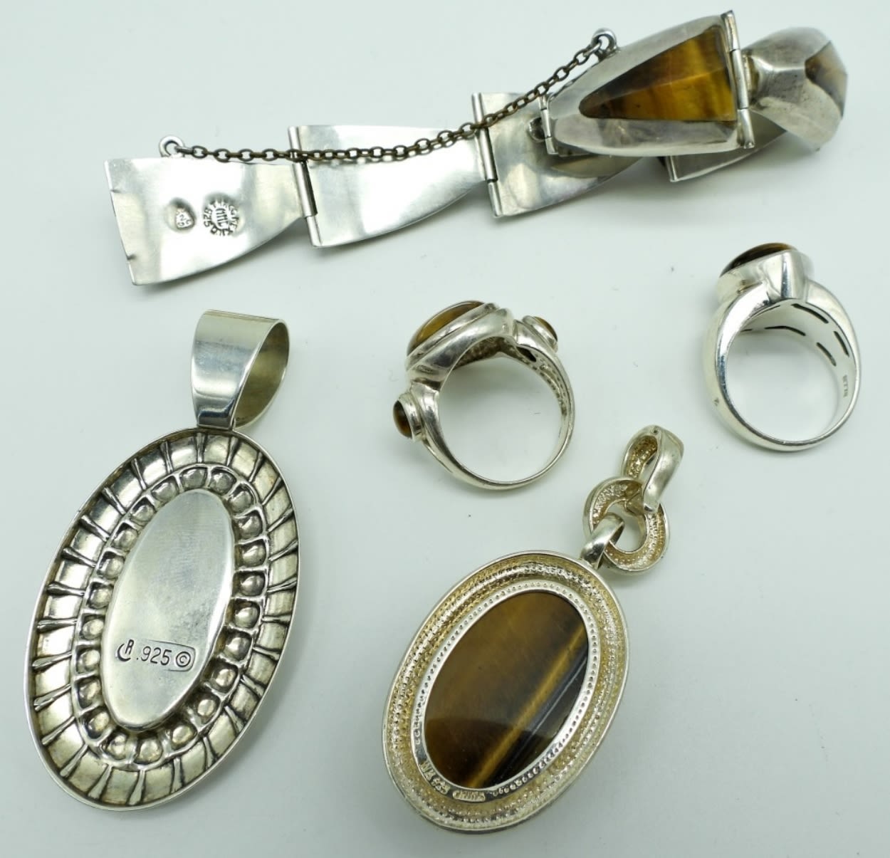50DWT, 2 RINGS- SIZES-8, STAMPED 925 ON BOTH, 2 PENDANTS- 2 1/2IN LONG,STAMPED 925, BRACELET-NEAR 7IN LONG STAMPED MEXICO CITY 925 MMC ON THE BACK