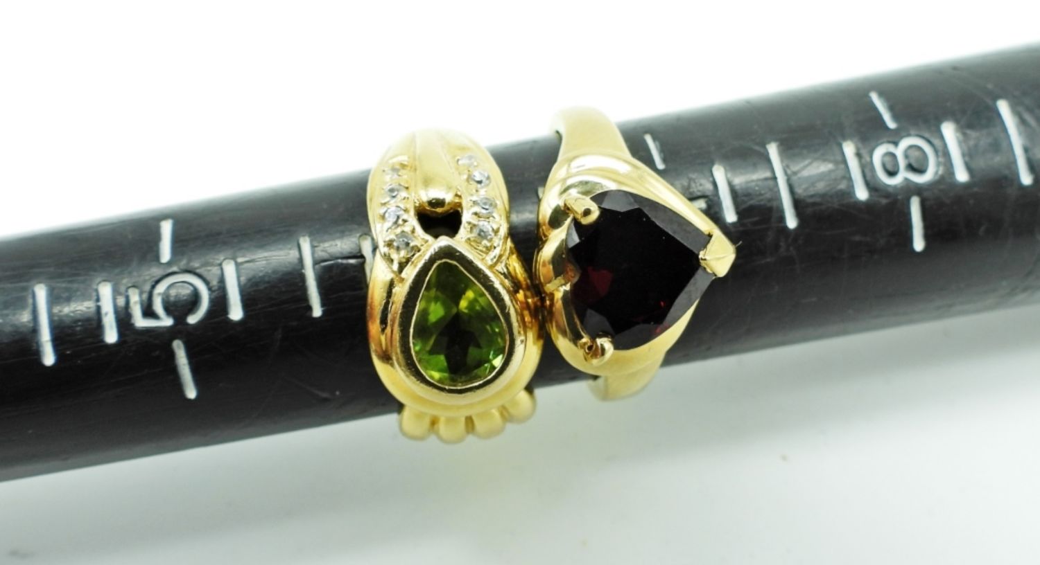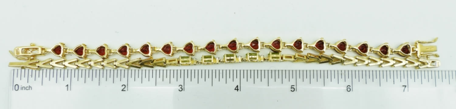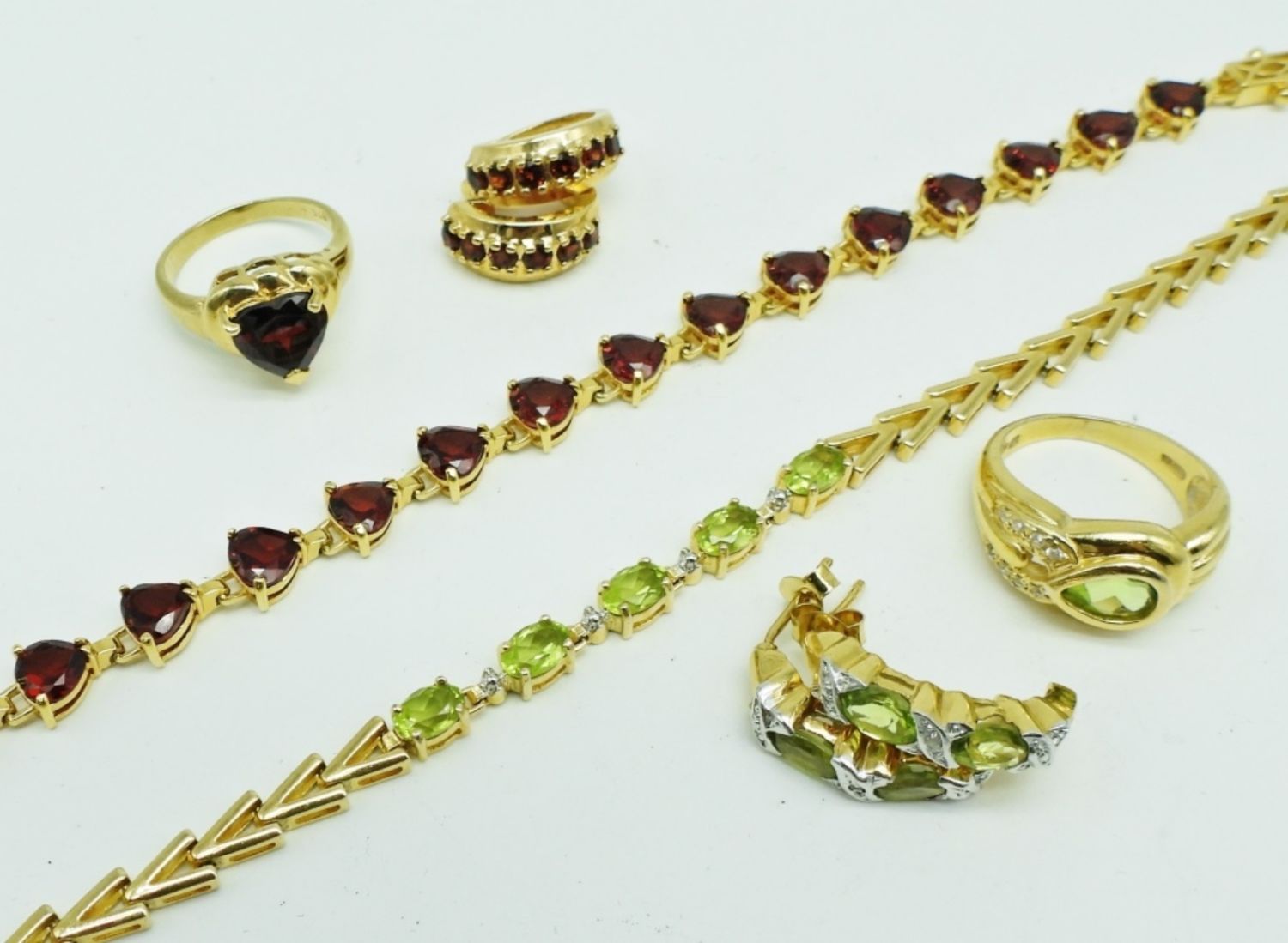 24 DWT, 1- GARNET GEMSTONE TENNIES BRACELET 7 1/2″ LONG, RING SZ 6 1/2, PIERCED HUGGIE EARRINGS, ALL STAMPED 925, 1- PERIDOT TENNIES BRACELET 8″ LONG, RING SZ 6, PIERCED HUGGIE EARRINGS, ALL STAMPED 925