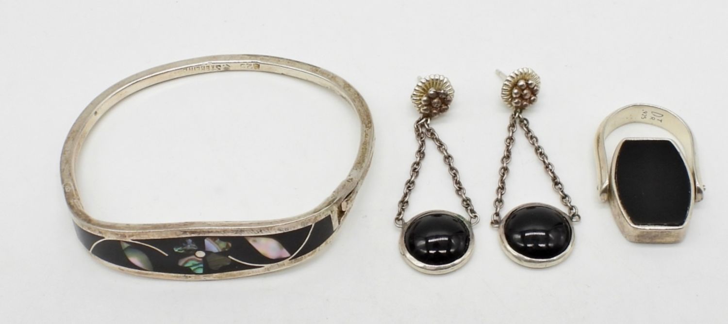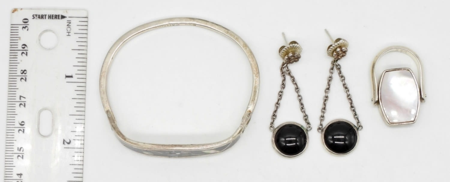 HINGED BRACELET 6 1/2″ with INLAY, PIERCED EARRING & REVERSIBLE PENDANT (19 dwt)