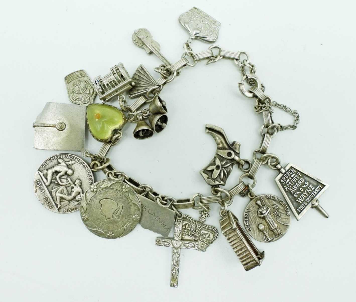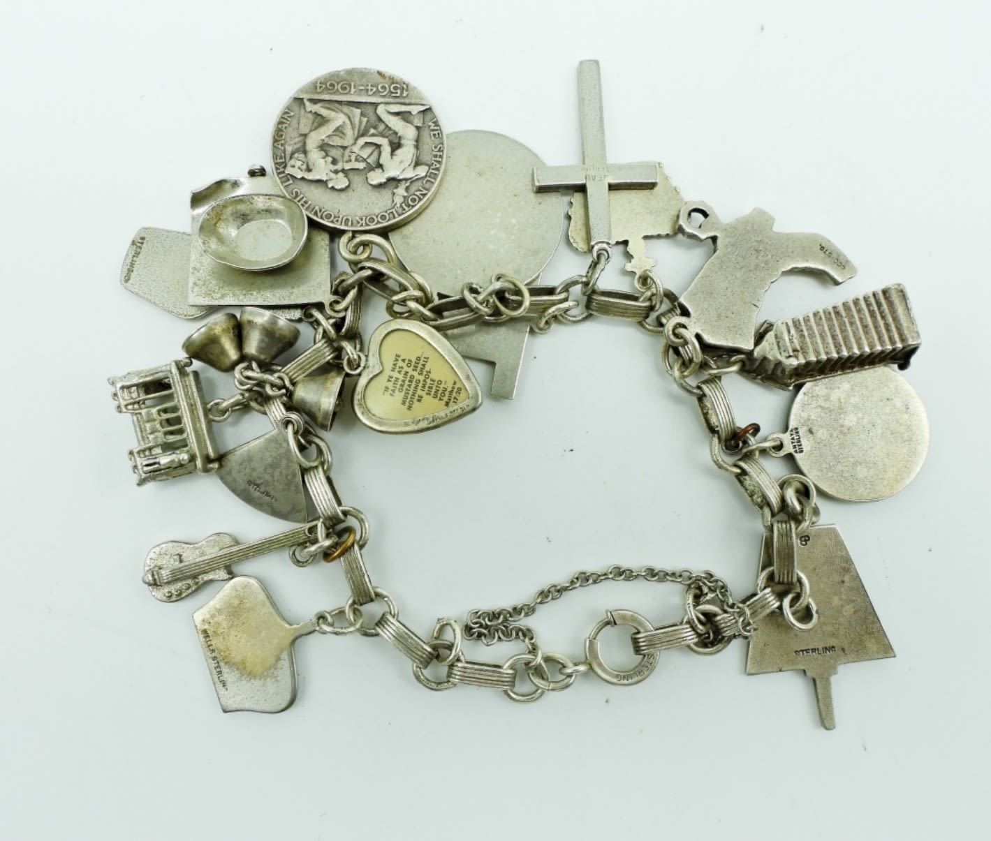 33.9DWT, ABOUT 8IN LONG, 17 CHARMS ATTACHED, STAMPED STERLING AND ON THE CLASP