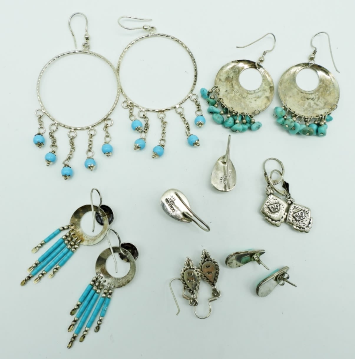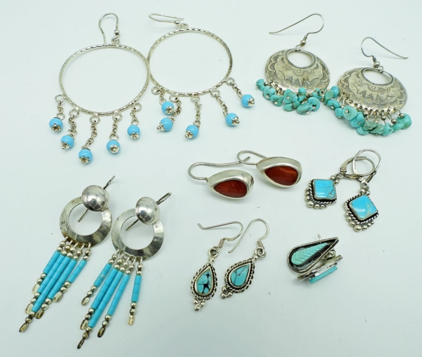 26.5DWT, ALL PIERCED AND STAMPED 925 ON SOME PART OF EARRINGS, ALL DIFFERENT STYLES, 1 -STUDS, 6- DROP PAIRS