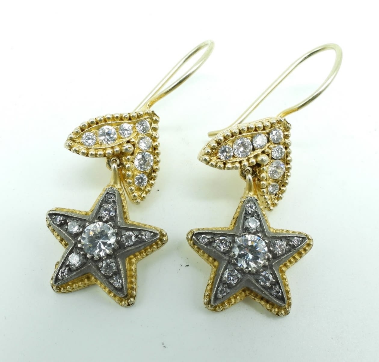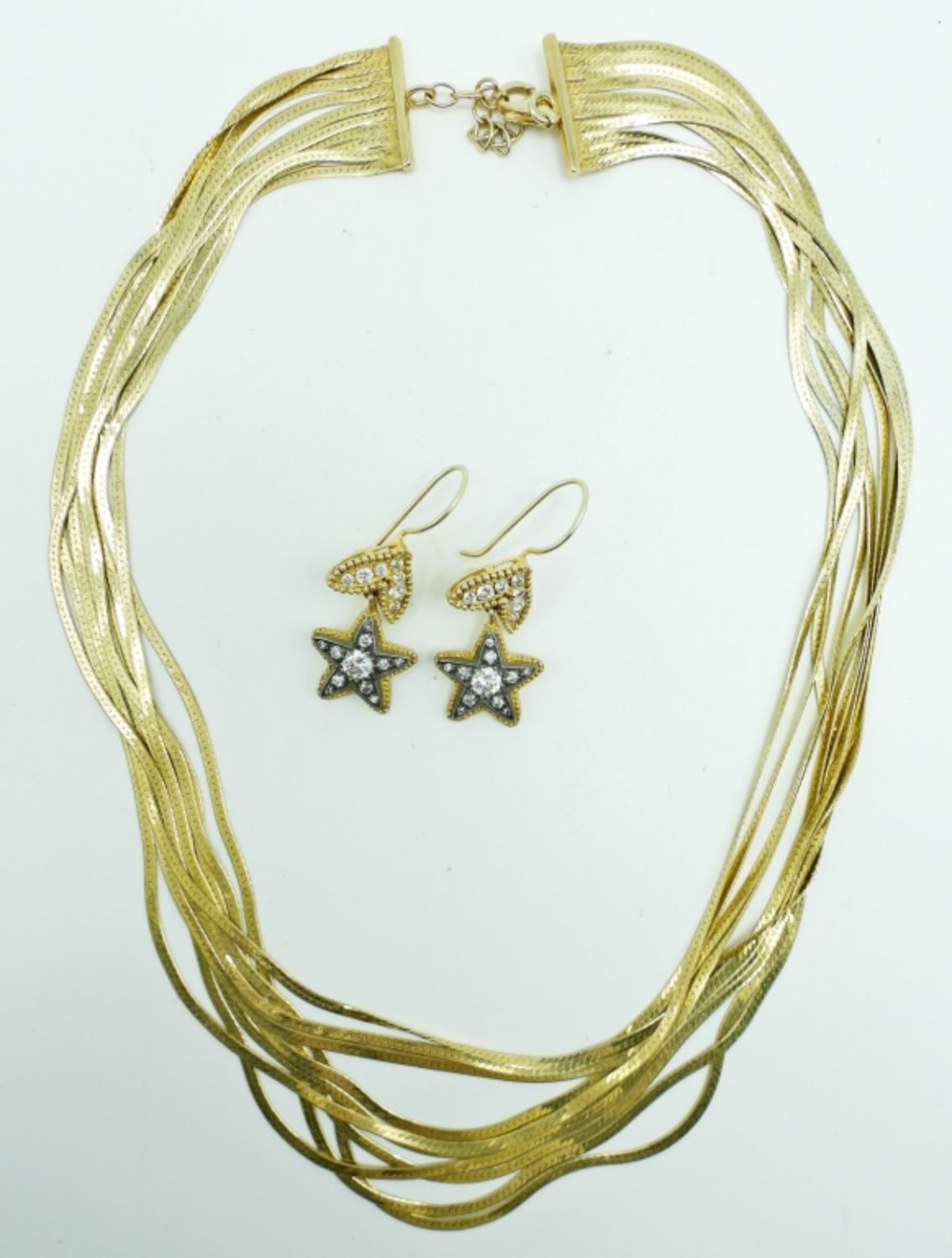 27.9DWT,20″LONG, GOLD TONE, DROPPED PIERCED EARRINGS STARS WITH CLEAR STONES, STAMPED 925, LOBSTER CLASP STAMPED 925 FOR THE NECKLACE
