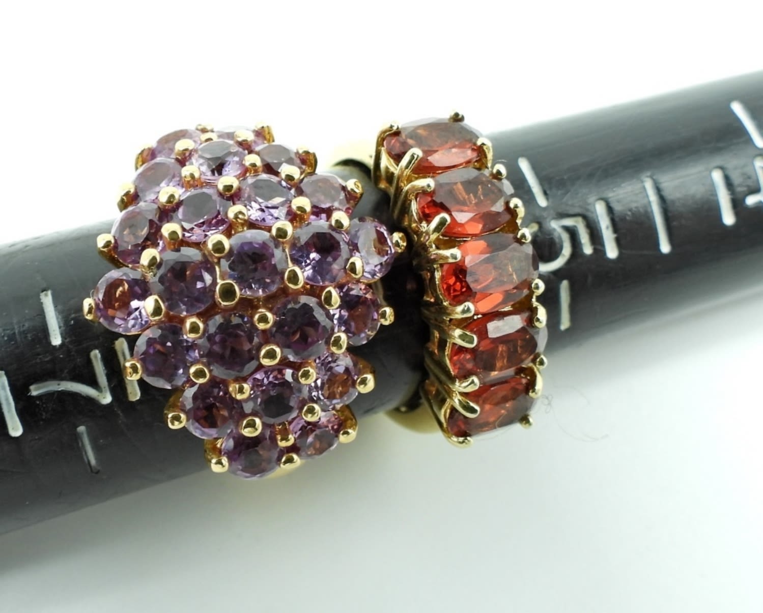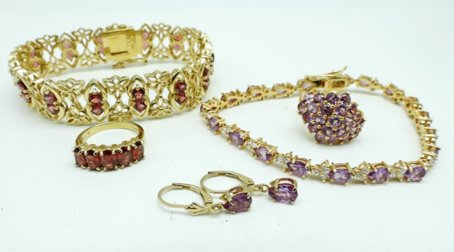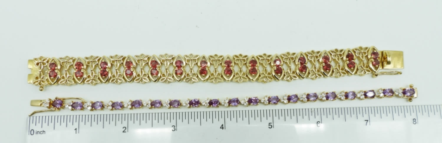 35.6 DWT, 1- 8″ LONG GARNET GEMSTONE FLOWER DESIGN, WITH BOX CLASP, RING SIZE 6, AMETHYST GEMSTONE WITH CLEAR STONES, 8″LONG BRACELET WITH BOX CLASP, RING 6 1/2 AND PAIR OF PIERCED EARRINGS, ALL STAMPED 925