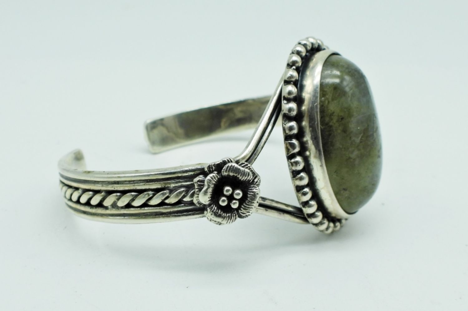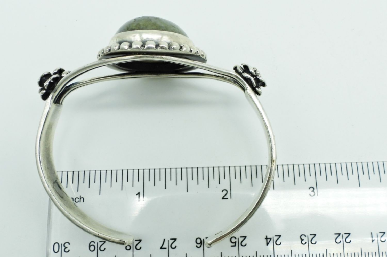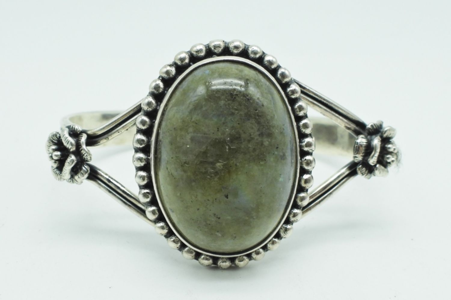 22.2DWT, 2 1/2″ WIDE, MOONSTONE IN THE MIDDLE WITH A FLOWER ON EACH SIDE AND ROPE DESIGN, STAMPED 925 ON THE INSIDE