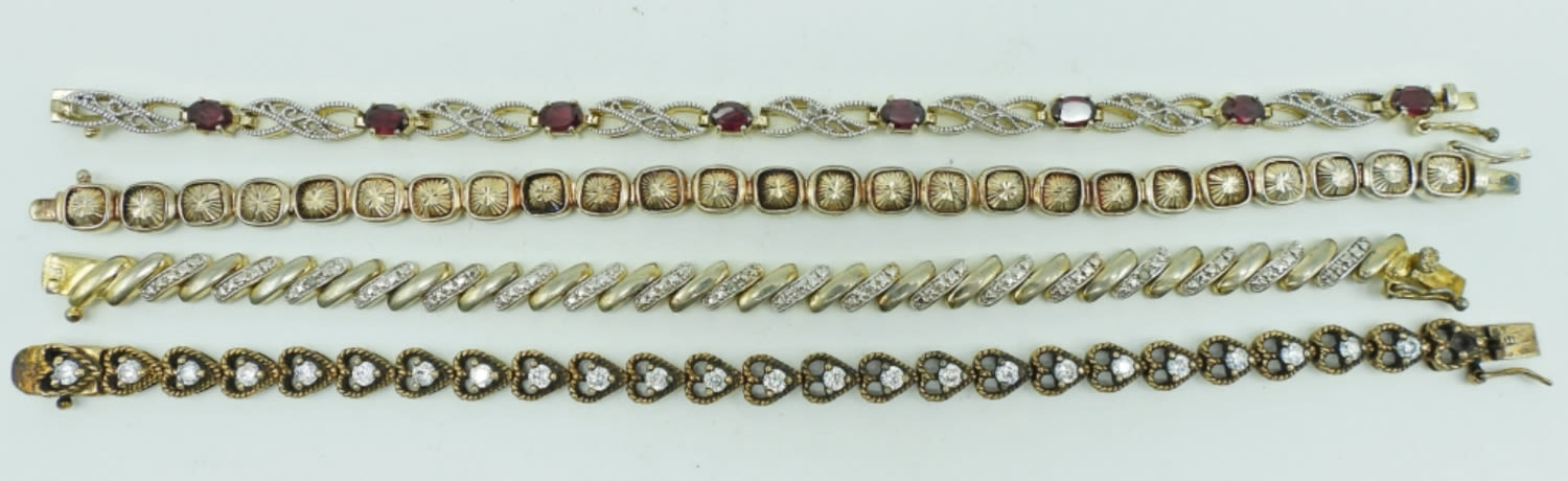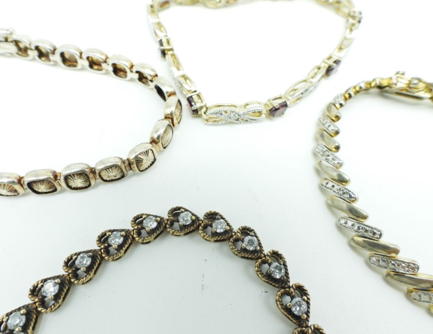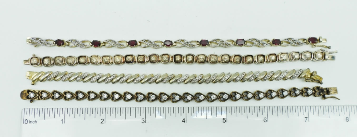 36.3DWT, ALL NEAR 8″ LONG WITH BOX CLASP, ALL DIFFERENT STYLES, (ONE STONE MISSING FROM THE HEART BRACELET FOR REPAIR), ALL STAMPED 925 ON THE CLASP