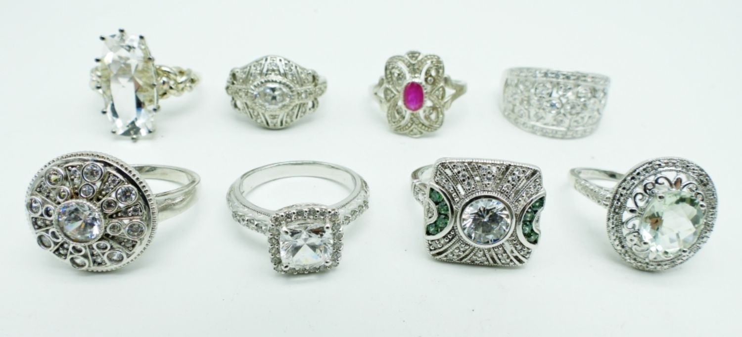 30DWT, ALL DIFFERENT STYLES, STAMPED 925 INSIDE, STUNNING RINGS, SIZES, (5) 9, (2) 10, (1) 11
